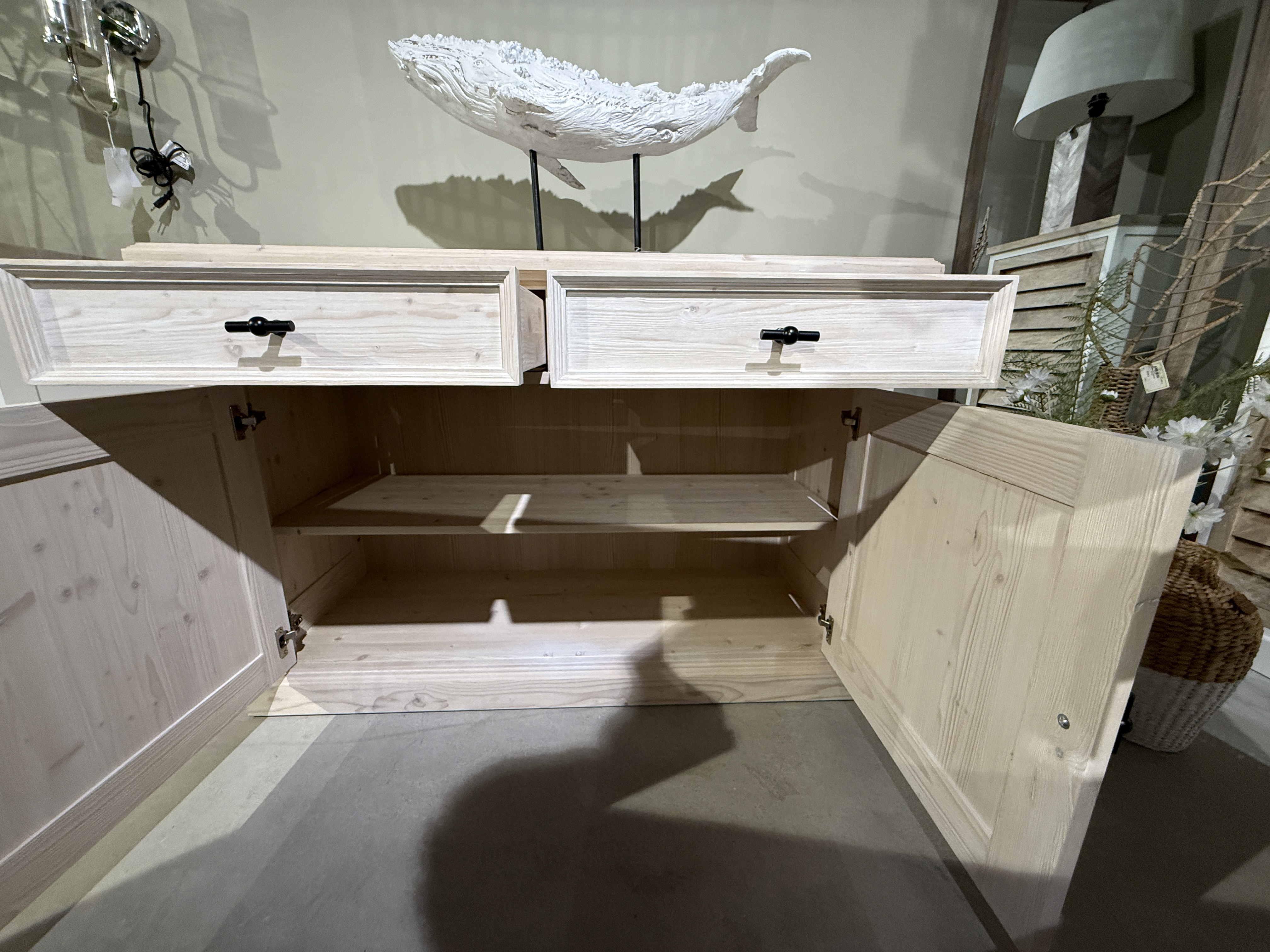Doch nicht nur das Design überzeugt – auch beim Thema Stauraum punktet die Oslo-Anrichte auf ganzer Linie. Hinter mehreren Türen und in großzügigen Schubladen verbirgt sich reichlich Platz für Geschirr, Bücher, Alltagsgegenstände oder Deko. Alles ist ordentlich verstaut und dennoch schnell griffbereit.