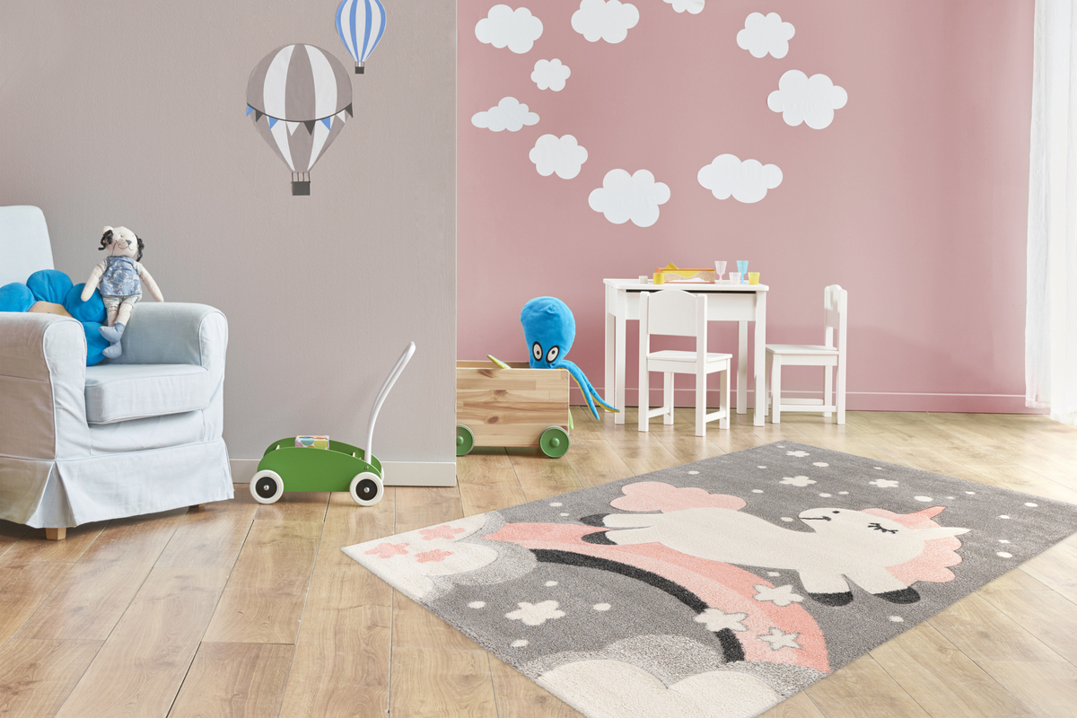 Dieser attraktive Kinderteppich ist für das Kinderzimmer von heute ideal geeignet. Das verspielte, kindgerechte Motiv und die dezenten Farben eignen sich ideal als Spieluntergrund und lassen Kinderaugen strahlen. Legen Sie den Teppich als weichen Spieluntergrund ins Kinderzimmer und genießen Sie nicht nur seine süße Optik, sondern auch die sichtbare Freude Ihrer Kinder. Ein großer Vorteil ist auch das pflegeleichte Material des Teppichs, das für eine robuste Qualität sorgt. Gerade im Kinderzimmer sind diese Eigenschaften für einen Teppich nicht wegzudenken, denn dadurch hält der Teppich hoher Beanspruchung und Verschmutzungen stand und Ihre Kinder werden lange Zeit Freude an Ihrem neuen Bodenbelag haben.