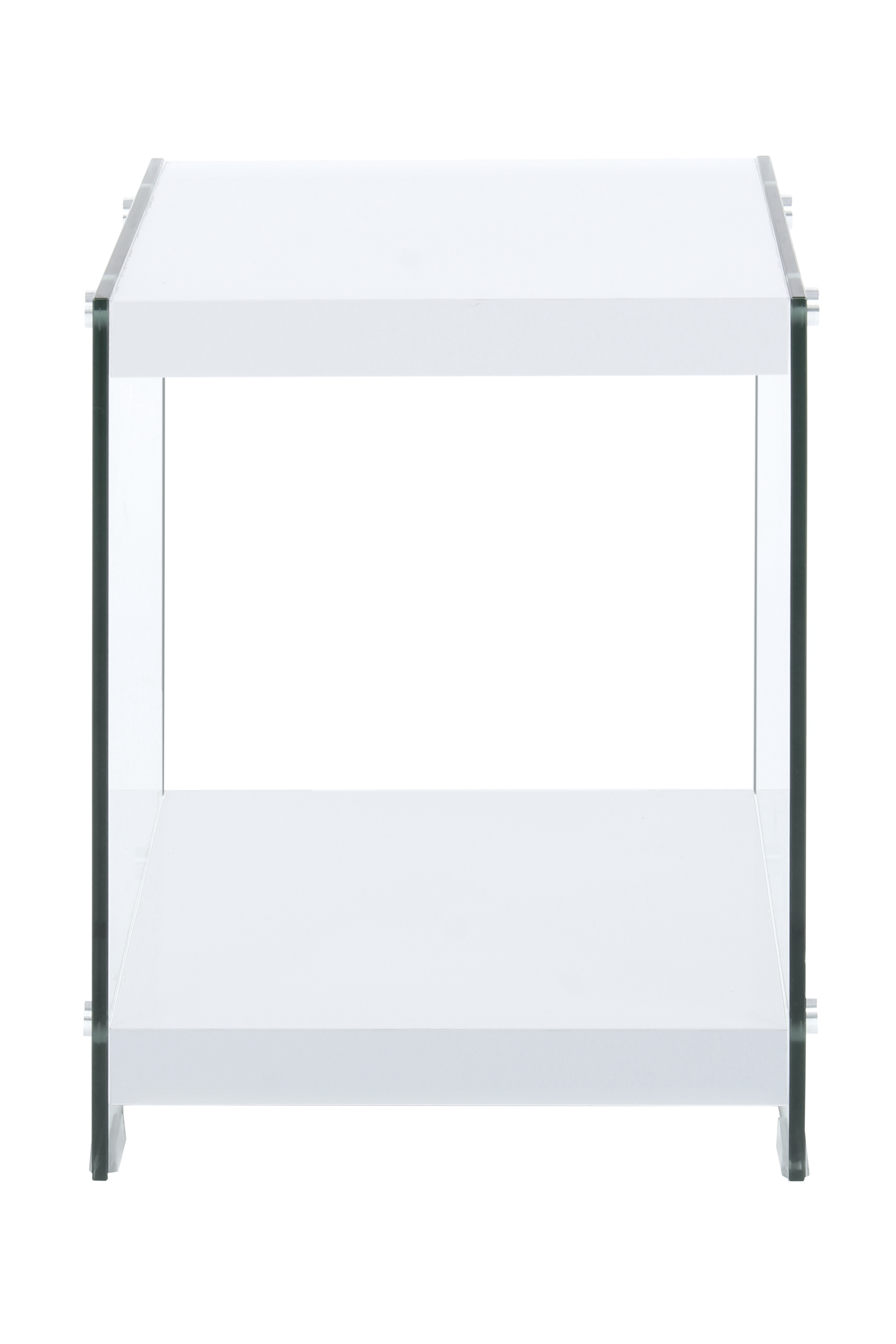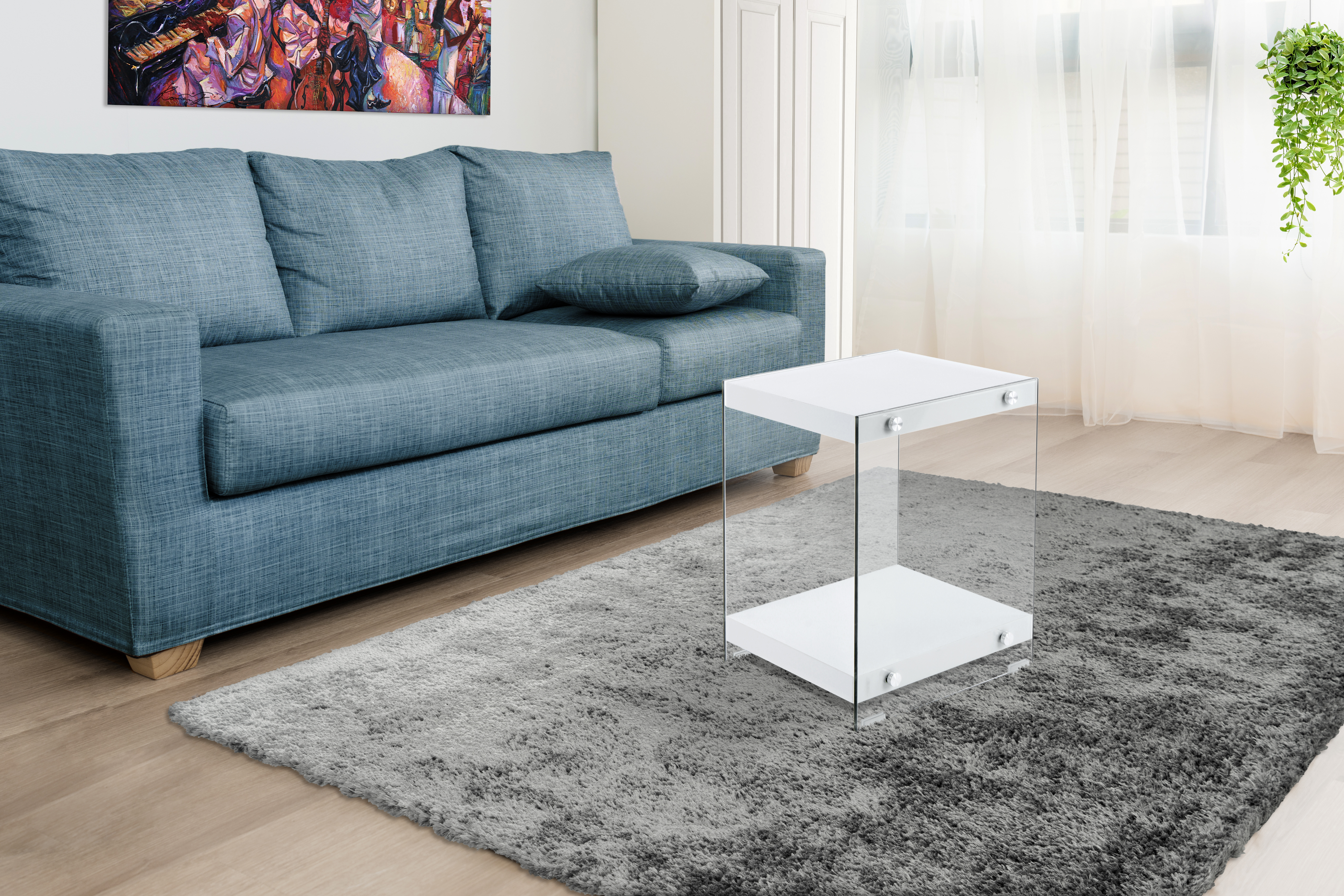Das moderne Design dieses Beistelltisches zeichnet sich durch die transparenten Glas-Seitenwände und die unifarbenen Ablageflächen aus. Gleichzeitig ist das Design unaufdringlich und kann in verschiedene Einrichtungsstile integriert werden. Der Beistelltisch ist Bestandteil einer Möbelserie, sodass Sie durch die Kombination mit weiteren Möbelstücken ein einheitliches, harmonisches Gesamtambiente im Raum schaffen können. Auf dem Beistelltisch können ideal Dinge platziert werden, die Sie gerne griffbereit haben möchten. Egal ob als Beistelltisch im Wohnzimmer, als Nachtschränken im Schlafzimmer oder als Ablage im Flur – der Tisch ist vielseitig einsetzbar und ein praktisches und zugleich dekoratives Möbelstück. Richten Sie sich mit Möbeln dieser Möbelserie in Ihrem Zuhause stilvoll ein und kombinieren Sie beispielsweise Beistelltisch und Regal miteinander. Die Tische können in ihrer tatsächlichen Farbgebung von den Bildern abweichen.