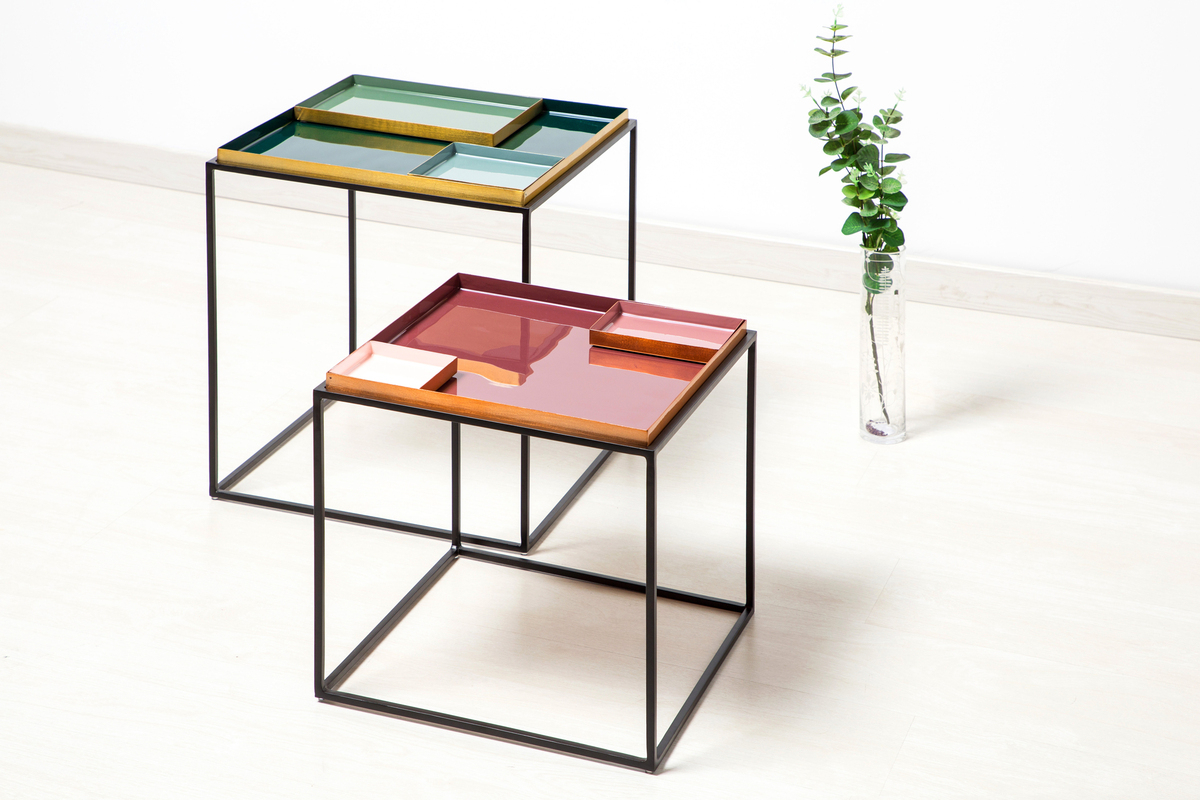 Dieses besondere Modell überzeugt durch die offene, würfelförmige Aufmachung und die modernen Farben. In das Metallgestell ist eine farbige, glatte Tischplatte mit erhöhtem Rand eingelassen, die durch zwei herausnehmbare Einsätze in unterschiedlichen Farben ergänzt wird. Sie können den Tisch als geteilte Fläche mit Einsätzen oder als ebene Fläche ohne Einsätze nutzen und ganz nach Ihren Bedürfnissen variieren. Ob zur Dekoration oder als nützliche flache Schalen – die Einsätze erfüllen ihren Zweck.