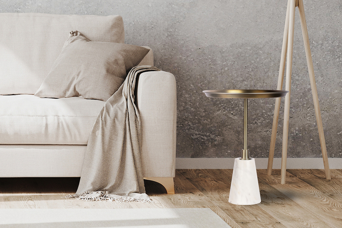 Edles Design und einzigartiger Charakter sind in diesem Beistelltisch vereint. Dieser besticht durch sein Zusammenspiel eingesetzter Materialien. Marmor, Eisen und Aluminium sorgen rufen ein hochwertiges Gesamtbild hervor und setzen Akzente. Dieser bedient sich der Tisch nicht nur als eigenständiges Deko-Objekt, sondern auch als Basis weiterer Einrichtungsgegenstände. Seine Kombinationsvielfalt ist beispiellos. Richtig eingesetzt, entfaltet er sein volles Potential und wird so zum Hingucker in der Gestaltung von Innenräumen.