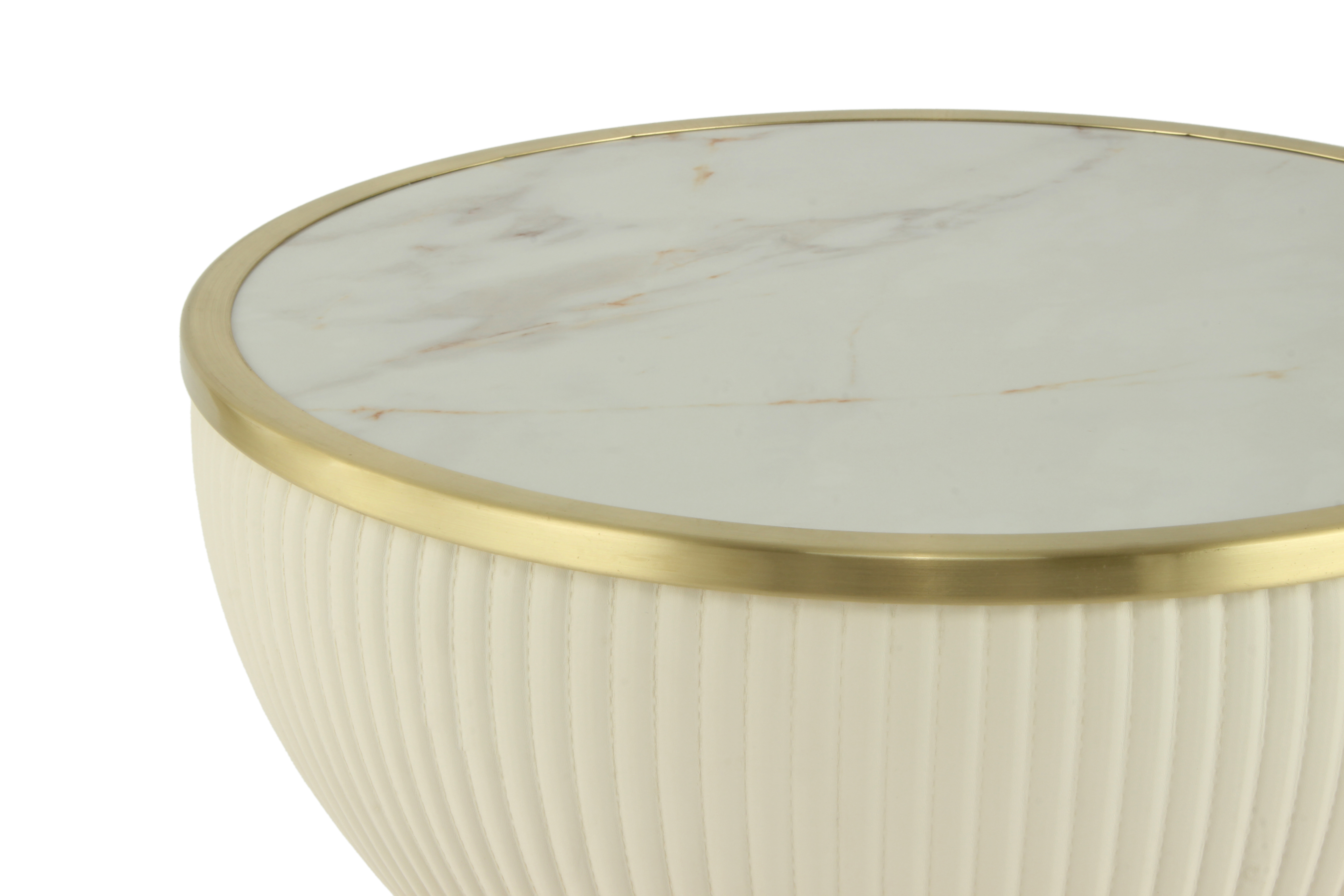 Durch sein Eisengestell, den luxuriösen PU-Bezug und der modernen gesinterten Steinplatte, ist dieser Beistelltisch ein stilvolles, dekoratives Ablagetischchen in jedem Zuhause. Der kleine Wohntisch hat eine glatte, breite Oberfläche durch seine robuste gesintete Steinplatte, die zum Platzieren und Präsentieren verschiedener Dekorationsgegenstände, Zeitschriften oder auch Getränken verwendet werden kann. Seine Stabilität verdankt dieser Beistelltisch dem robusten Eisengestell, dem langlebigen PU-Bezug und der widerstandsfähigen gesinterten Steinplatte. Sowohl Outdoor als auch Indoor eignet sich dieser kleine, dekorative Tisch durch sein modernes und stilvolles Aussehen als tolles Wohnaccessoire.