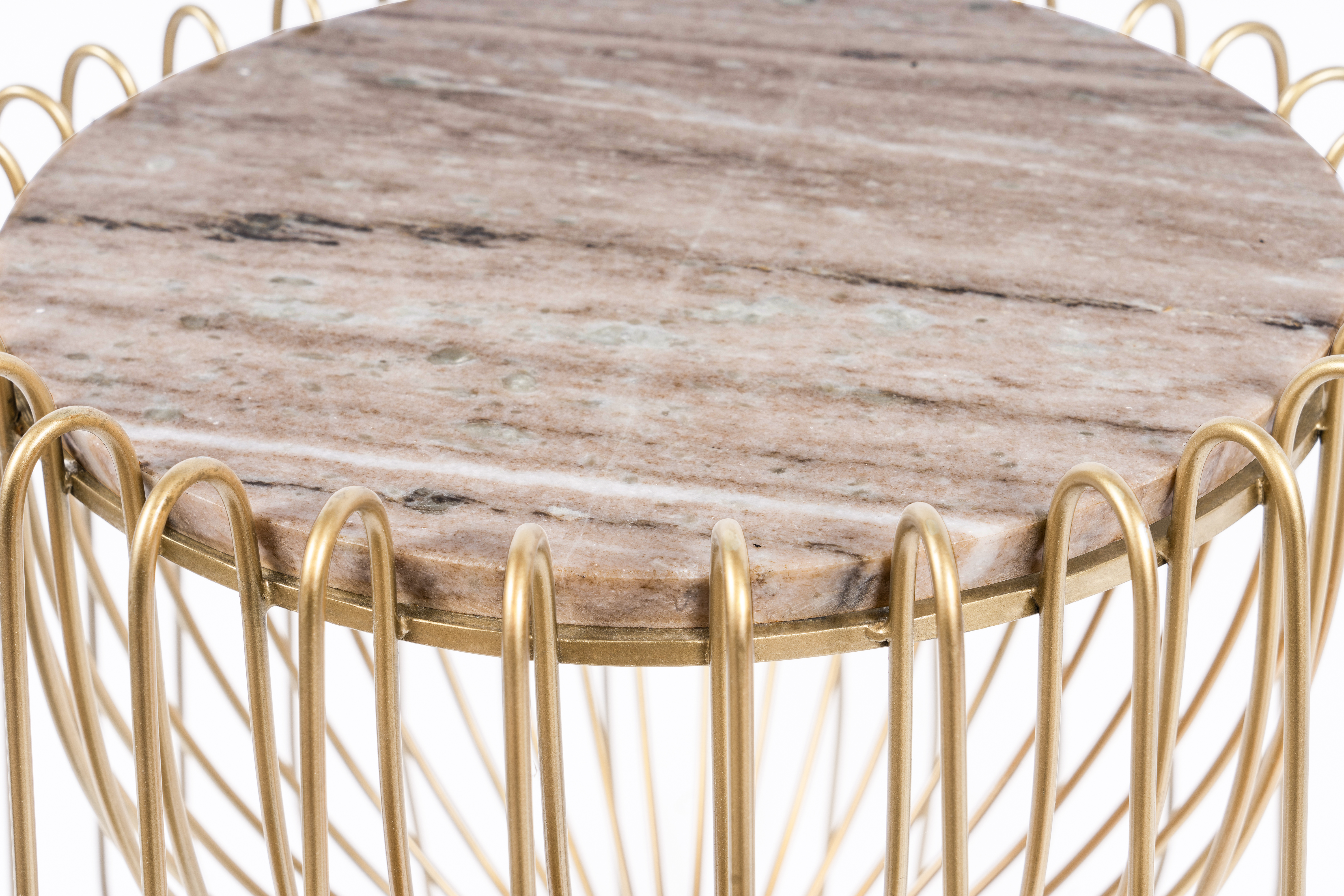 Der charaktervolle Marmortisch ist in filigraner Handarbeit entstanden und zählt zu den hochwertigen Möbelstücken, gefertigt aus hochwertigsten Materialien. Das auffällige Drahtmöbel-Design ist gekonnt verarbeitet und verleiht diesem stylischen Tisch eine elegante Note. Er eignet sich hervorragend als Ablagefläche für Dekorationsgegenstände, Zeitschriften oder Snacks. Daher ist der Beistelltisch ideal als neuer Couchtisch für Ihr Wohnzimmer geeignet. Holen Sie sich mit diesem Design-Möbel ein Stück modernen Flair in Ihr Heim!