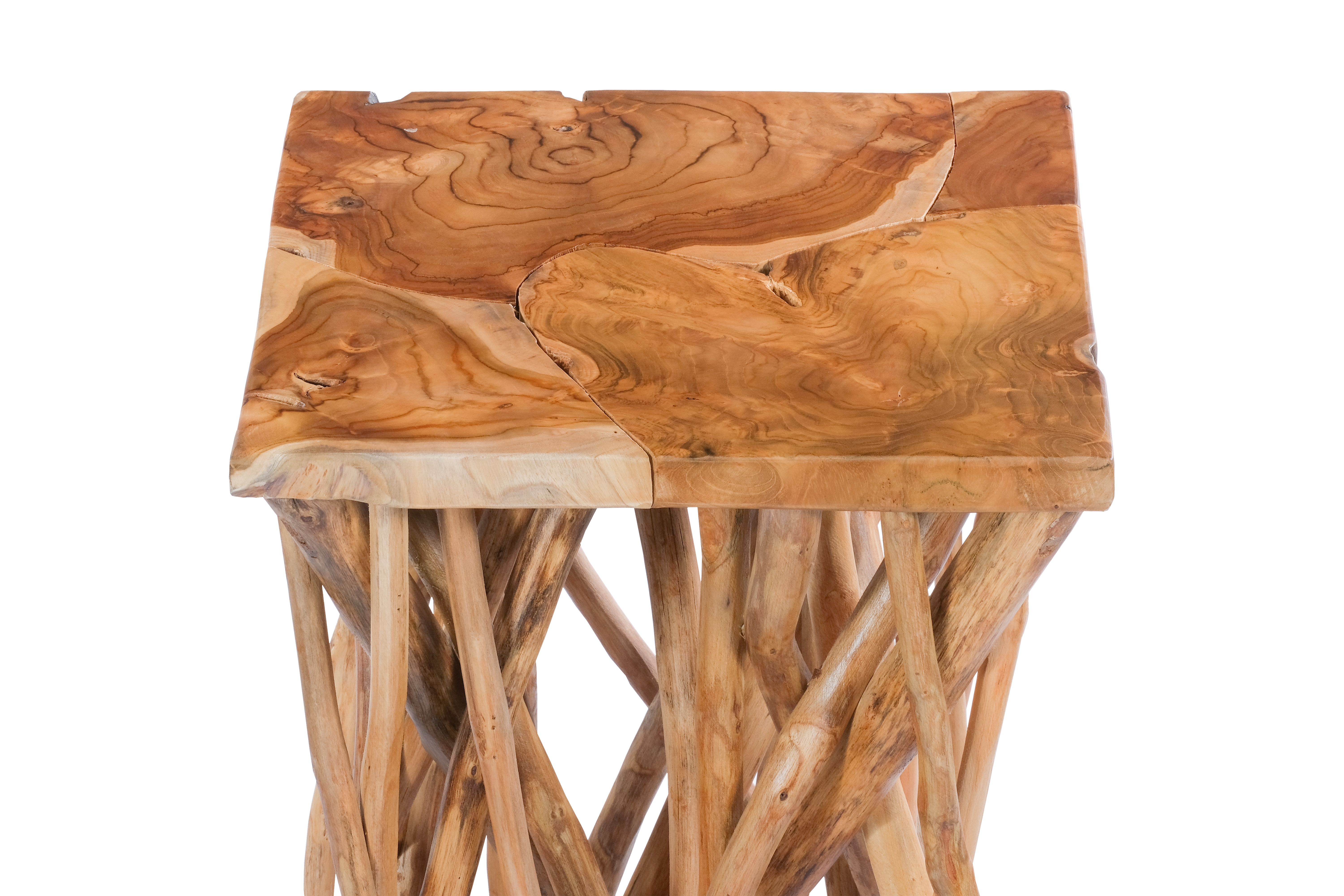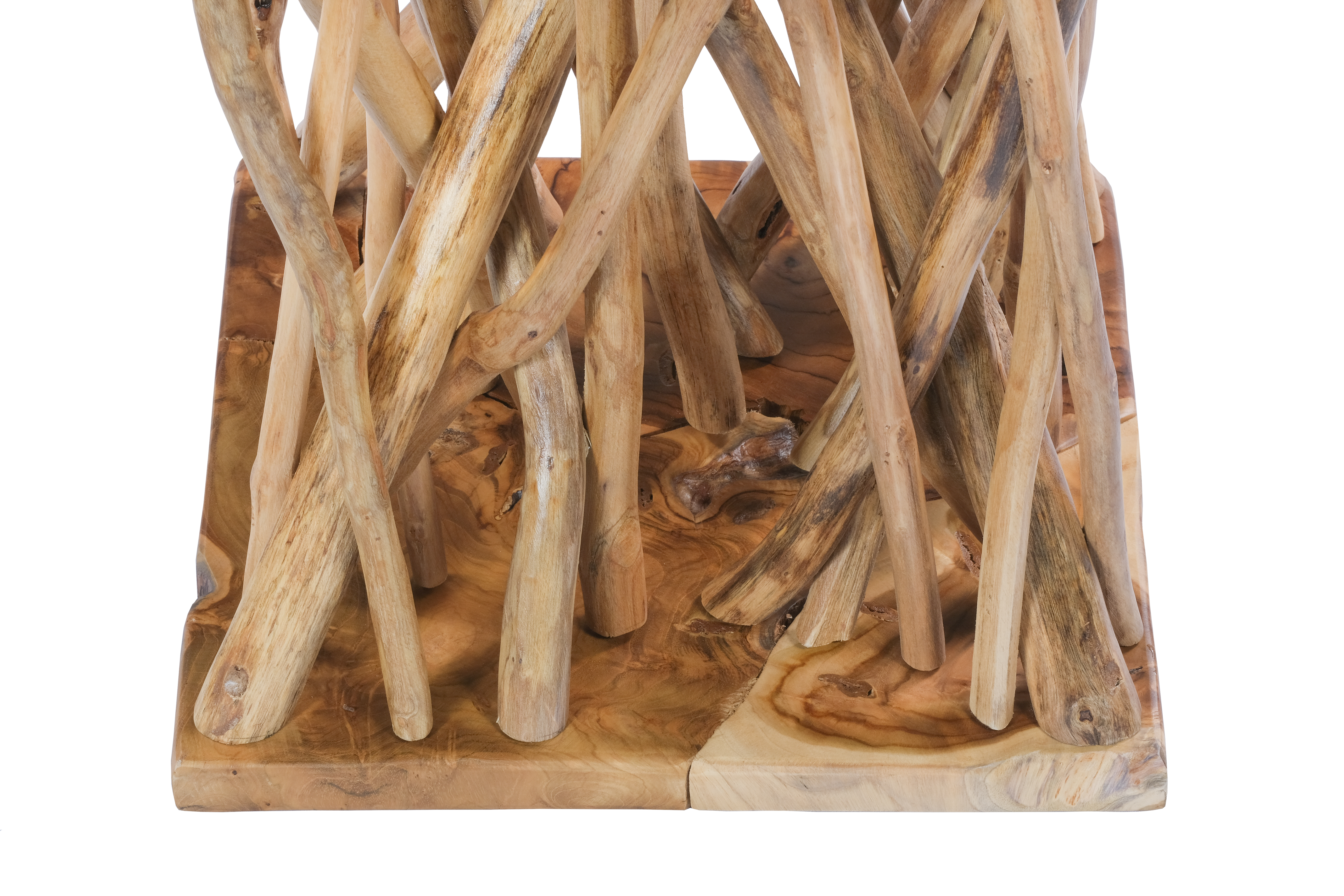 Dieser Beistelltisch ist das ideale Möbelstück in jeder modernen Wohnung. Als Ablagefläche im Flur oder als Beistelltisch im Wohnzimmer ist dieser Tisch sowohl praktisch als auch enorm dekorativ. Die Verwendung von Teakholz zeugt von hoher Qualität und Beständigkeit. Der Tisch wurde zudem in äußerst stabiler Bauweise errichtet. Die Tischbeine in verästeltem Design machen dieses Möbelstück einfach unverkennbar. Damit wird der Tisch automatisch zum Hingucker in Ihrem Zuhause. Mit diesem Beistelltisch werten Sie jeden Wohnraum auf. Das Material ist pflegeleicht und bringt einen gewissen Hauch von Luxus in Ihren Wohnraum. Mit diesem Beistelltisch erhalten Sie ein individuelles Naturprodukt. Es kann in Form und Abmessungen zu Abweichung kommen, sodass es Ihren neuen Tisch kein zweites Mal in gleicher Form gibt. Der Tisch kann in seiner tatsächlichen Farbgebung von den Bildern abweichen. Eine regelmäßige Reinigung mit einem feuchten Tuch wird empfohlen.