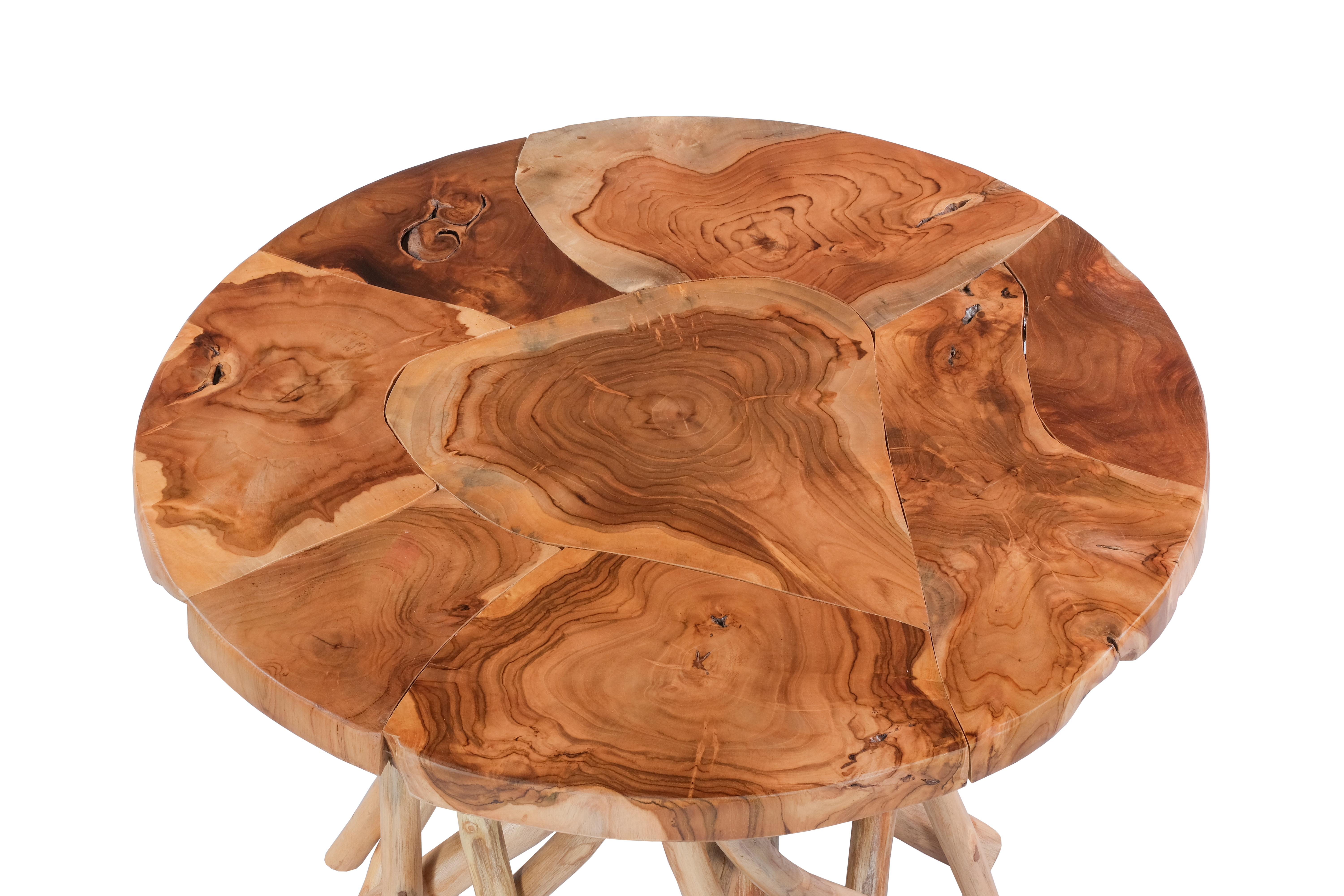 Dieser Beistelltisch ist das ideale Möbelstück in jeder modernen Wohnung. Als Ablagefläche im Flur oder als Beistelltisch im Wohnzimmer ist dieser Tisch sowohl praktisch als auch enorm dekorativ. Die Verwendung von Teakholz zeugt von hoher Qualität und Beständigkeit. Der Tisch wurde zudem in äußerst stabiler Bauweise errichtet. Die Tischbeine in verästeltem Design machen dieses Möbelstück einfach unverkennbar. Damit wird der Tisch automatisch zum Hingucker in Ihrem Zuhause. Mit diesem Beistelltisch werten Sie jeden Wohnraum auf. Das Material ist pflegeleicht und bringt einen gewissen Hauch von Luxus in Ihren Wohnraum. Mit diesem Beistelltisch erhalten Sie ein individuelles Naturprodukt. Es kann in Form und Abmessungen zu Abweichung kommen, sodass es Ihren neuen Tisch kein zweites Mal in gleicher Form gibt. Der Tisch kann in seiner tatsächlichen Farbgebung von den Bildern abweichen. Eine regelmäßige Reinigung mit einem feuchten Tuch wird empfohlen.