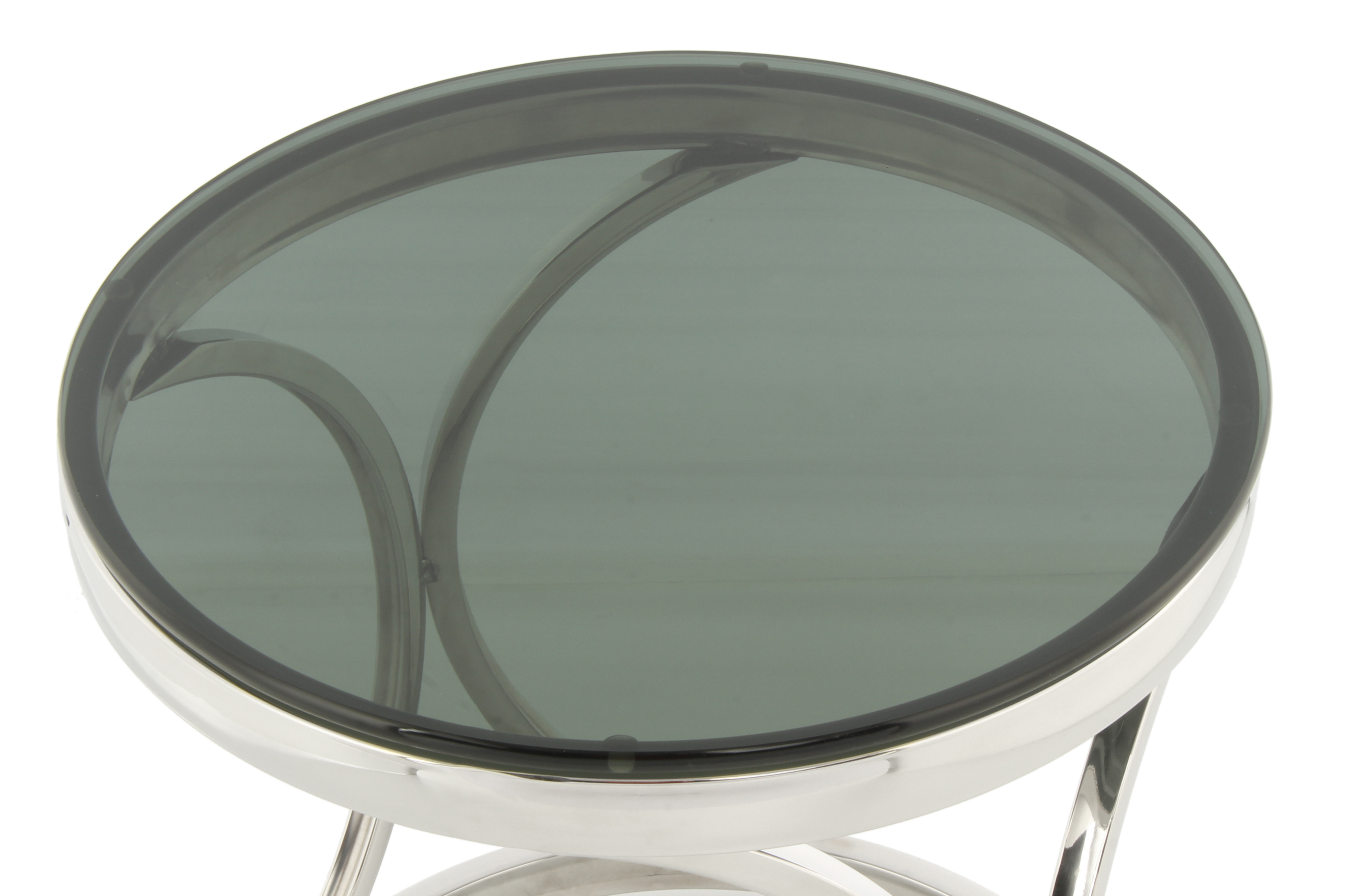 Die offene Gestaltung dieses Beistelltisches bringt ein modernes und einladendes Ambiente mit sich. Das Metallgestell ist in sich gedreht und verleiht dem Tisch seinen besonderen Look. Kombiniert mit der Tischplatte aus Glas ergibt sich ein attraktives Gesamtbild mit edlem Charakter. Besonders in luxuriösen Einrichtungen macht der Tisch eine gute Figur. Aber auch in klassischen und modernen Einrichtungen sorgt er für das gewisse Etwas. Durch die runde Grundform und die ebenfalls runde Tischplatte wirkt der Tisch sehr harmonisch. Die randlose Gestaltung der Tischplatte und die glatte Oberfläche ermöglichen ein einfaches Abwischen. Der Tisch kann in seiner tatsächlichen Farbgebung von den Bildern abweichen.