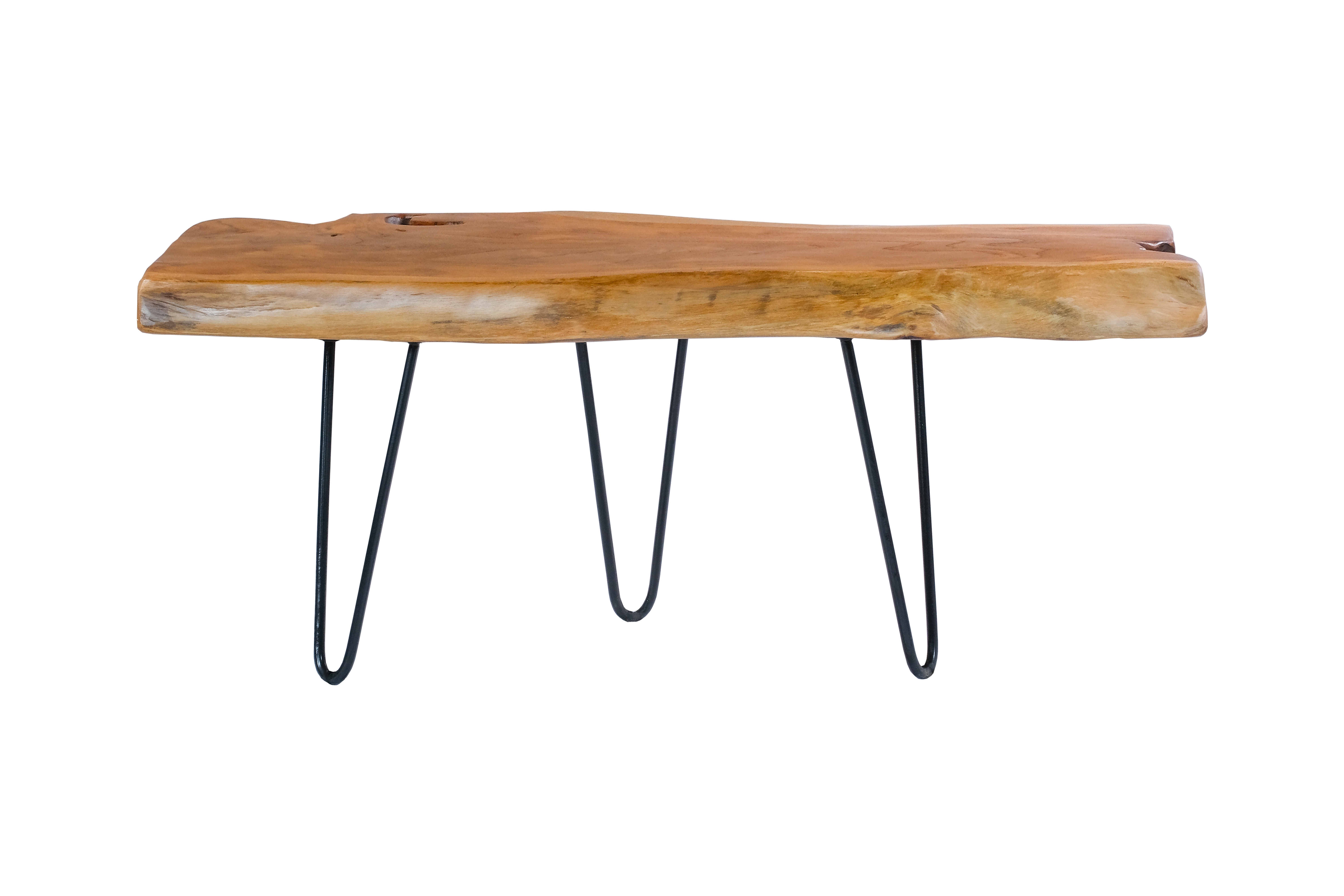 Dieser Beistelltisch ist das ideale Möbelstück in jeder modernen Wohnung. Als Ablagefläche im Flur oder als Beistelltisch im Wohnzimmer ist dieser Tisch sowohl praktisch als auch enorm dekorativ. Die Verwendung von Teakholz zeugt von hoher Qualität und Beständigkeit. Der Tisch wurde zudem in äußerst stabiler Bauweise errichtet. Die Kombination aus edler, länglicher Tischplatte und auffälligen Metallbeinen macht dieses Möbelstück unverkennbar. Durch diesen Tisch wird jeder Einrichtungsstil aufgewertet. Mit diesem Beistelltisch werten Sie jeden Wohnraum auf. Das Material ist pflegeleicht und bringt einen gewissen Hauch von Luxus in Ihren Wohnraum. Mit diesem Beistelltisch erhalten Sie ein individuelles Naturprodukt. Es kann in Form und Abmessungen zu Abweichung kommen, sodass es Ihren neuen Tisch kein zweites Mal in gleicher Form gibt. Der Tisch kann in seiner tatsächlichen Farbgebung von den Bildern abweichen. Eine regelmäßige Reinigung mit einem feuchten Tuch wird empfohlen.