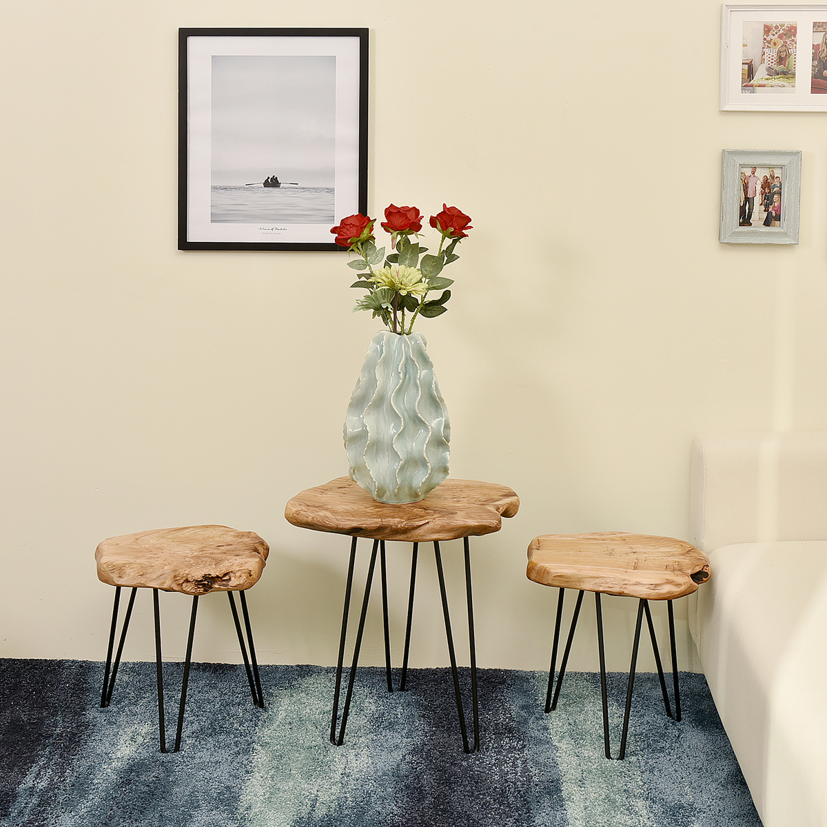 Mit diesem Beistelltisch erhalten Naturliebhaber die ideale Ablagefläche. Die Tischplatte besteht aus natürlichem Holz, welches mit Klarlack überzogen ist, um eventuelles Splittern zu vermeiden. Integrieren Sie das Möbelstück in rustikale oder klassische Einrichtungen oder in den angesagten Landhausstil und holen Sie sich ein Stück Natur in Ihr Zuhause. Durch die leicht seitlich abgespreizten Metallbeine hat das Tischchen einen stabilen Stand. Die Tischbeine bilden dabei einen tollen Kontrast zu dem Naturholz. Schaffen Sie in Verbindung mit kuscheligen Teppichen oder metallischen Lampen ein uriges Ambiente. Mit Dekoration aus Holz greifen Sie das Material des Tisches erneut auf und schaffen ein harmonisches Gesamtbild. Mit diesem Beistelltisch erhalten Sie ein individuelles Naturprodukt. Es kann in Form und Abmessungen zu Abweichung kommen, sodass es Ihren neuen Tisch kein zweites Mal in gleicher Form gibt. Der Tisch kann in seiner tatsächlichen Farbgebung von den Bildern abweichen. Eine regelmäßige Reinigung mit einem feuchten Tuch wird empfohlen.