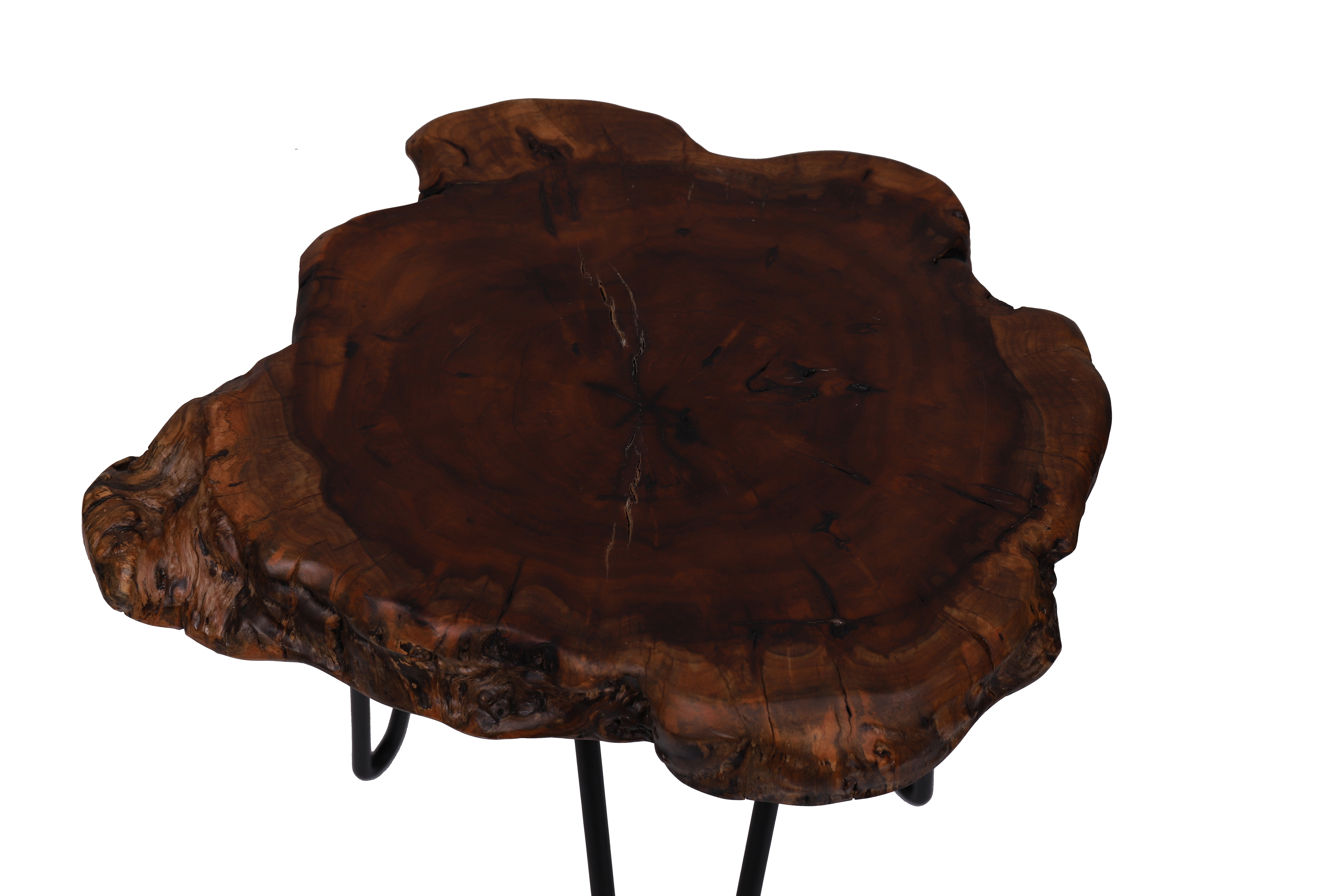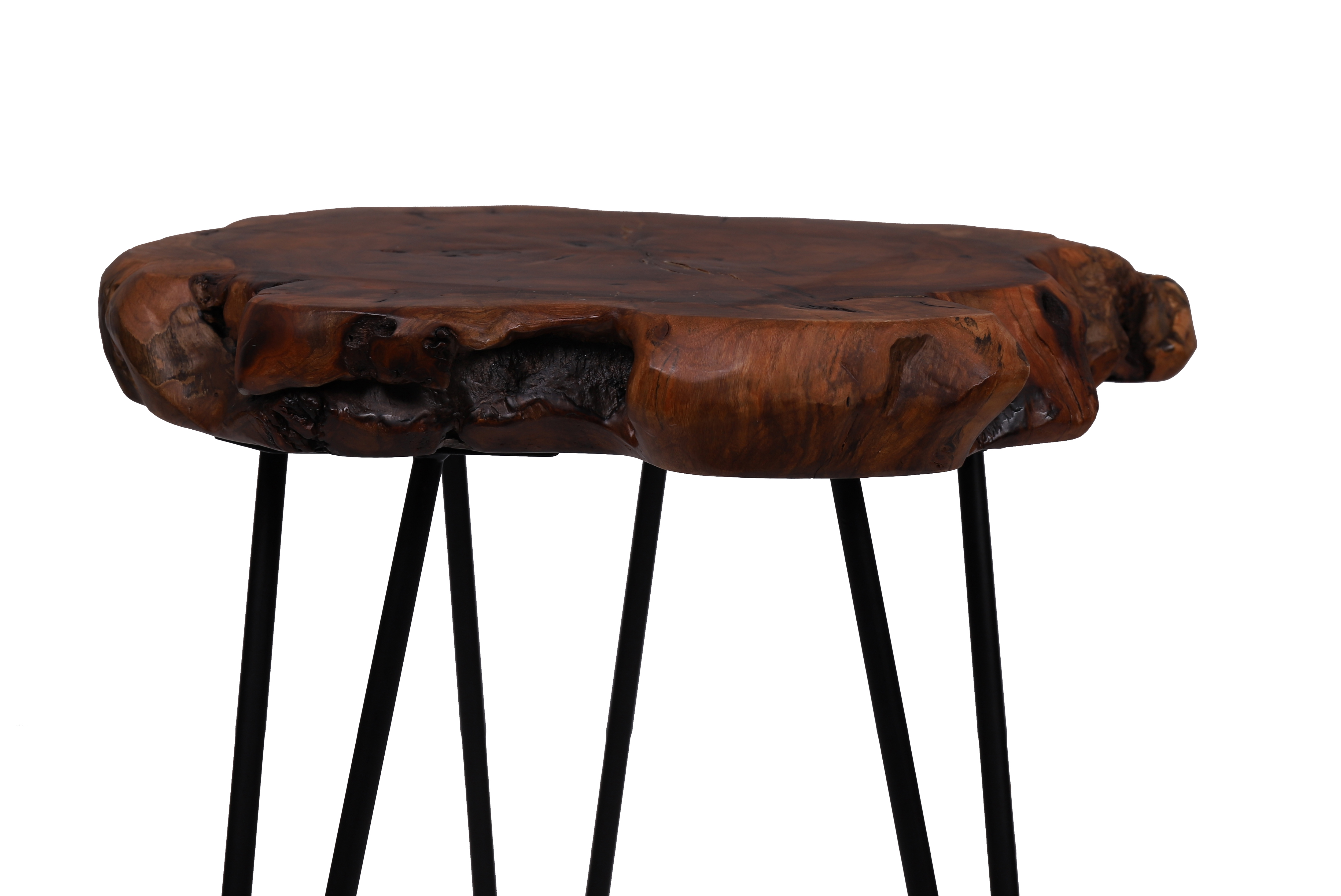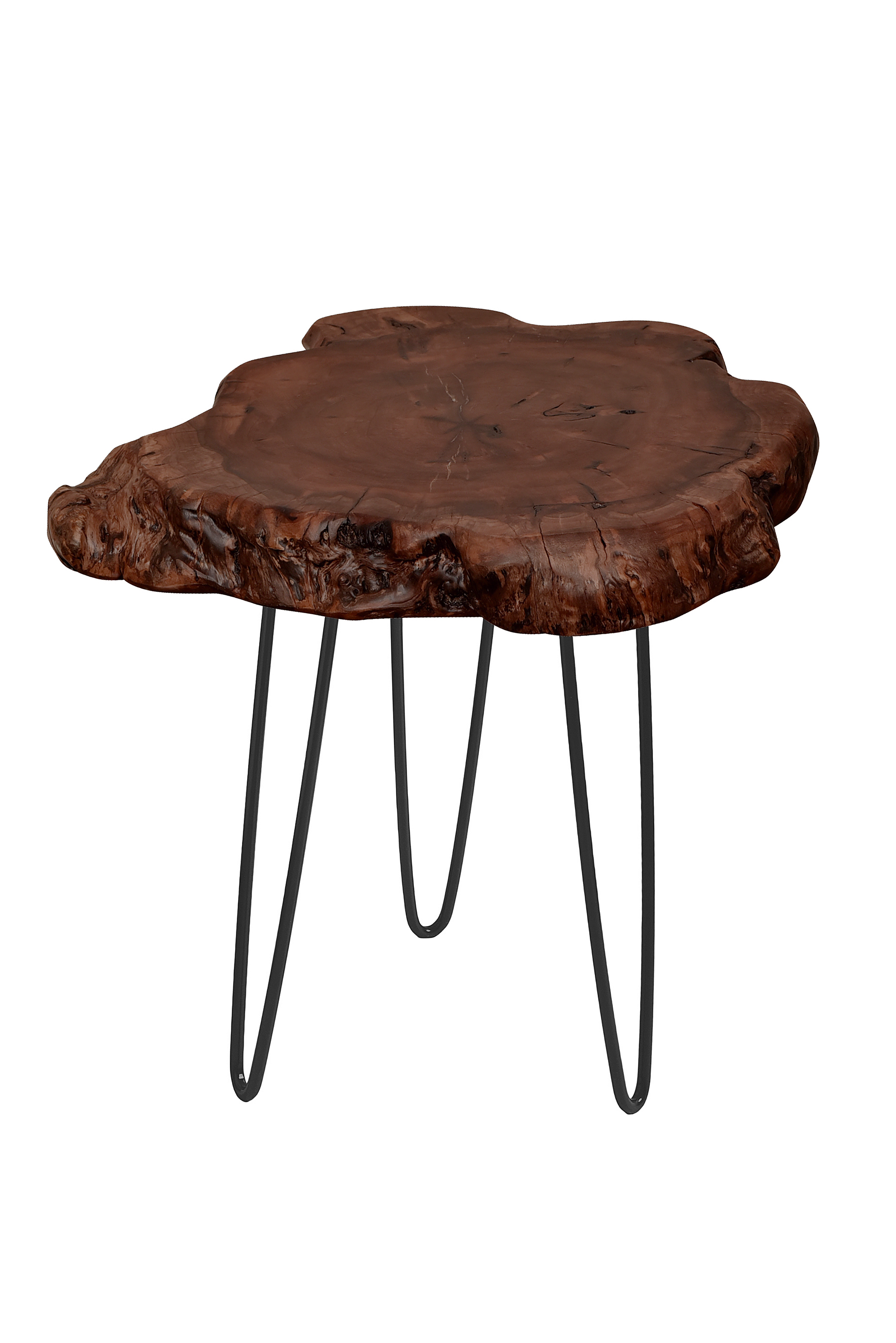 Mit diesem Beistelltisch erhalten Naturliebhaber die ideale Ablagefläche. Die Tischplatte besteht aus natürlichem Holz, welches mit Klarlack überzogen ist, um eventuelles Splittern zu vermeiden. Integrieren Sie das Möbelstück in rustikale oder klassische Einrichtungen oder in den angesagten Landhausstil und holen Sie sich ein Stück Natur in Ihr Zuhause. Durch die leicht seitlich abgespreizten Metallbeine hat das Tischchen einen stabilen Stand. Die Tischbeine bilden dabei einen tollen Kontrast zu dem Naturholz. Schaffen Sie in Verbindung mit kuscheligen Teppichen oder metallischen Lampen ein uriges Ambiente. Mit Dekoration aus Holz greifen Sie das Material des Tisches erneut auf und schaffen ein harmonisches Gesamtbild. Mit diesem Beistelltisch erhalten Sie ein individuelles Naturprodukt. Es kann in Form und Abmessungen zu Abweichungen kommen, sodass es Ihren neuen Tisch kein zweites Mal in gleicher Form gibt. Der Tisch kann in seiner tatsächlichen Farbgebung von den Bildern abweichen. Eine regelmäßige Reinigung mit einem feuchten Tuch wird empfohlen.