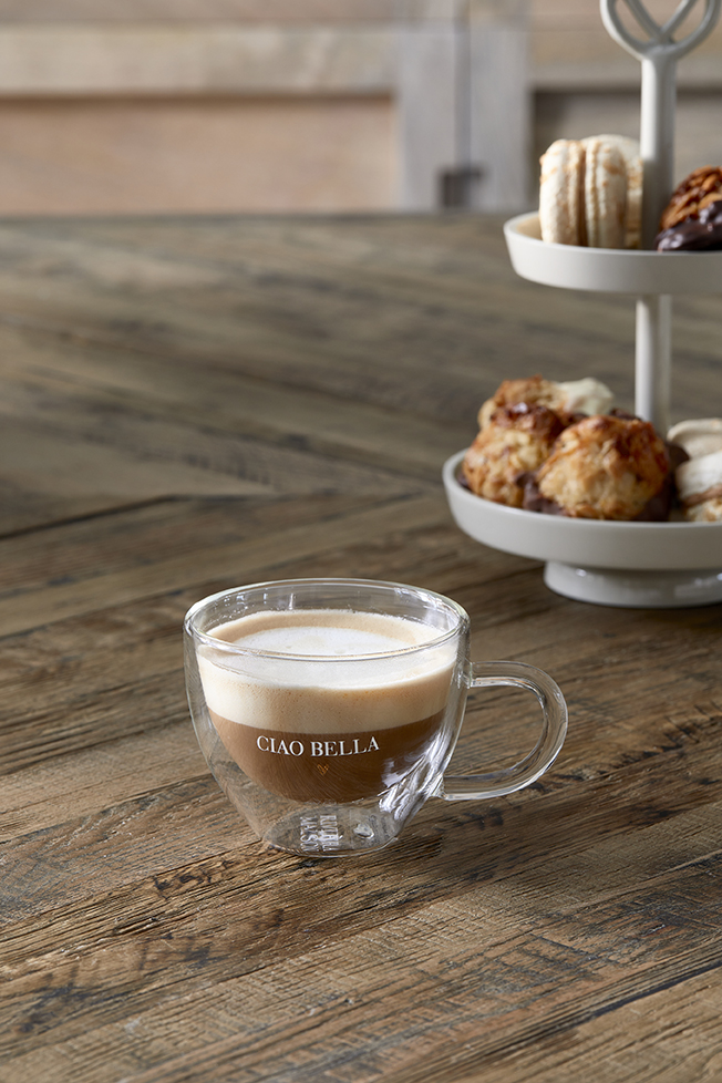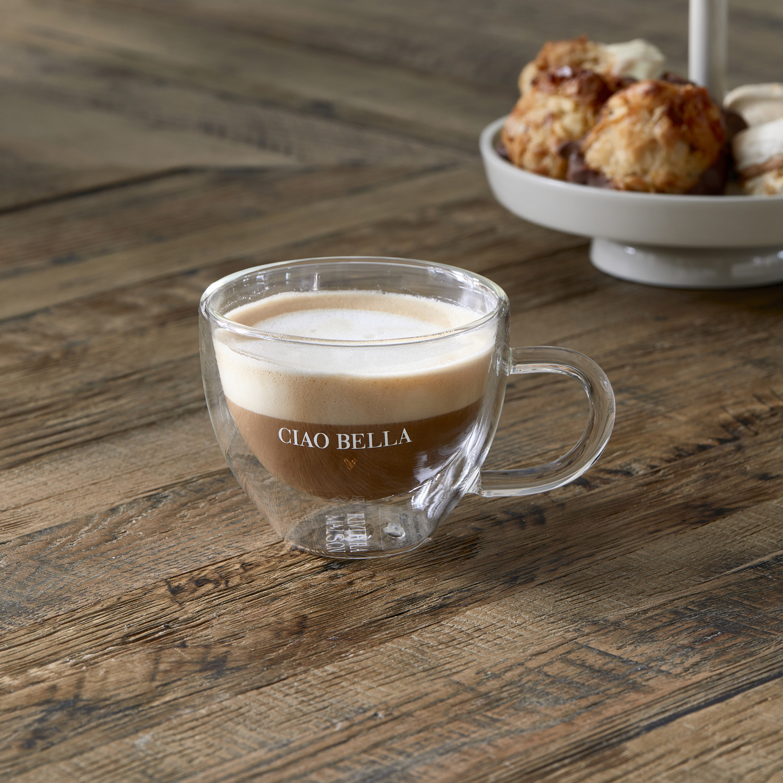 Dank der Doppelwandigkeit des Ciao Bella Double Wall Glass M bleibt der Kaffee oder Tee besonders lange heiß. Das doppelwandige Glas ist reich verziert mit einem Herz und dem italienischen Schriftzug "ciao bella", was so viel wie "schöner Tag" bedeutet.