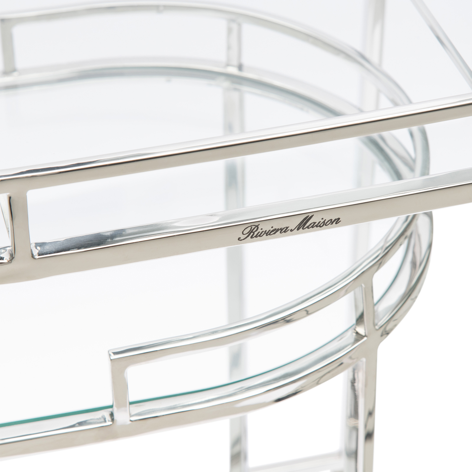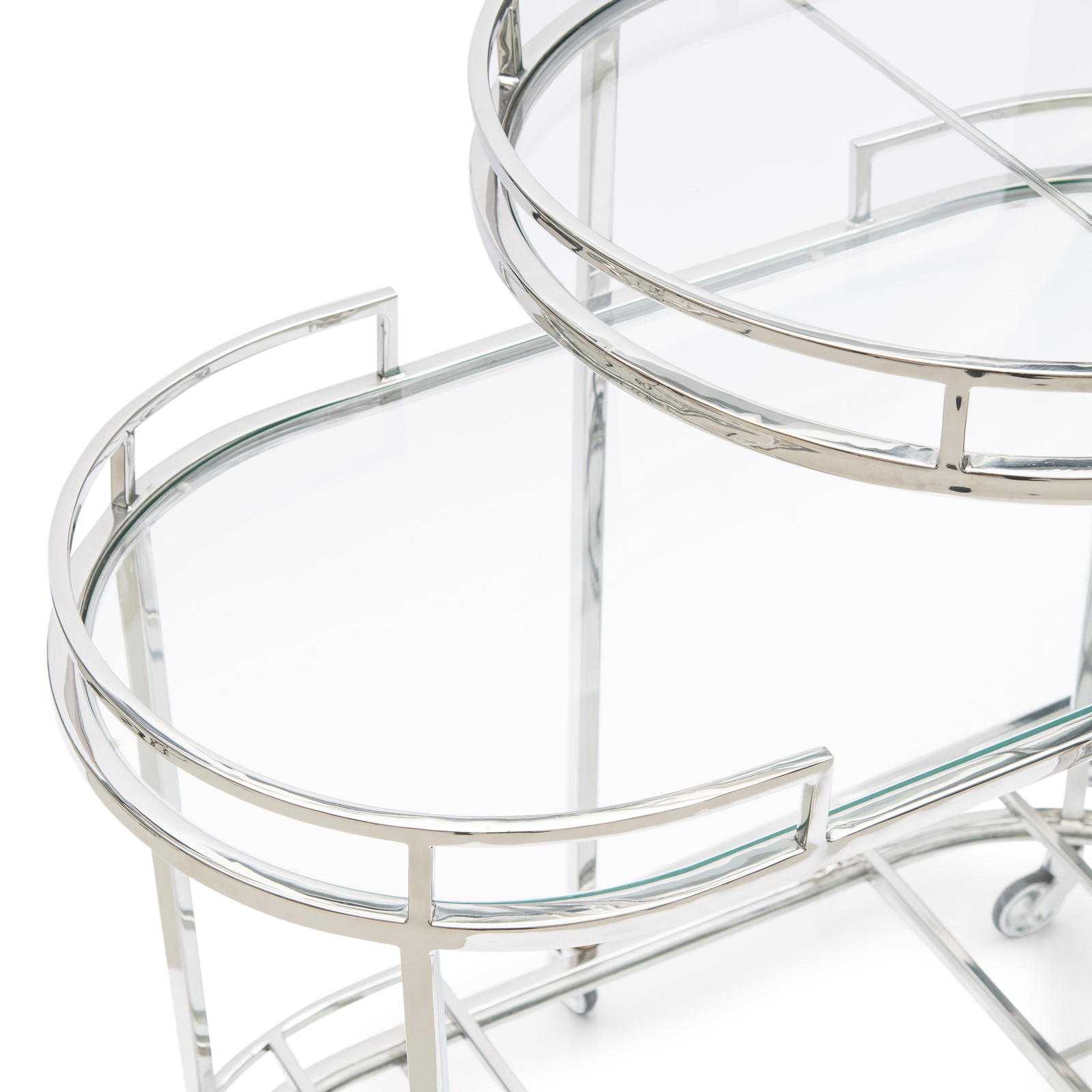 Das Crosby Street Bar Cart ist ein edles Set aus zwei Beistelltischen, die sowohl zusammen als auch einzeln genutzt werden können. Dank der Räder schieben Sie die Tische problemlos übereinander oder schieben Sie sie als Tablett an die Couch. Ideal für die feinsten Gläser, Karaffen und besten Getränke. Die ovalen Tischplatten sind aus Glas, das Gestell aus Edelstahl gefertigt.