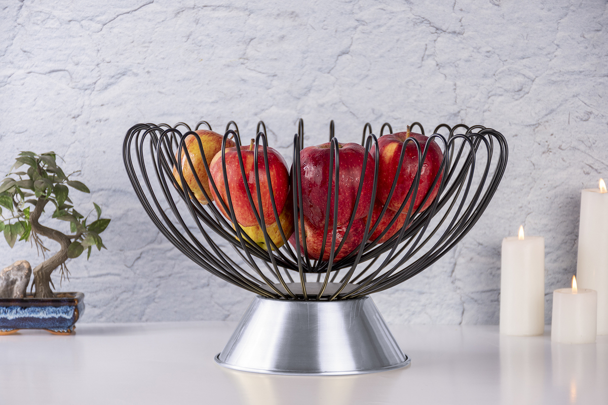 Diese Schale ist ein absoluter Alleskönner. Das Stabgitter-Design punktet mit seinem asketischen Erscheinungsbild. Als Obstkorb setzt sie frisches Obst und Gemüse gekonnt in Szene und verleitet förmlich zum Zugreifen. Frische Brötchen und Krustenbrot können stilsicher beim gemeinsamen Frühstück angereicht werden. Die Nutzung als Dekoration für die Innengestaltung von Wohnräumen gibt weiteren kreativen Spielraum. Ob mit Lichterkette, Steinen und Blüten im Frühling oder Kastanien und Farbspiel aus gefallenen Blättern im Herbst, der Korb beweist sich zu jeder Jahreszeit als Alleskönner. Gefertigt in Handarbeit, besteht das Gefäß aus hundertprozentigem Eisen. Ein Qualitätsmerkmal, welches höchsten Ansprüchen genügt. Angeboten in zwei Größen, unterscheidet es sich zusätzlich mit einem luxuriösen Finish aus goldenen oder silbernen Akzenten am Fuß. In Kombination mit dem luftdurchlässigen Design verhilft dieser, Lebensmitteln zu längerer Frische, da es das Gefäß dezent vom Boden hebt.