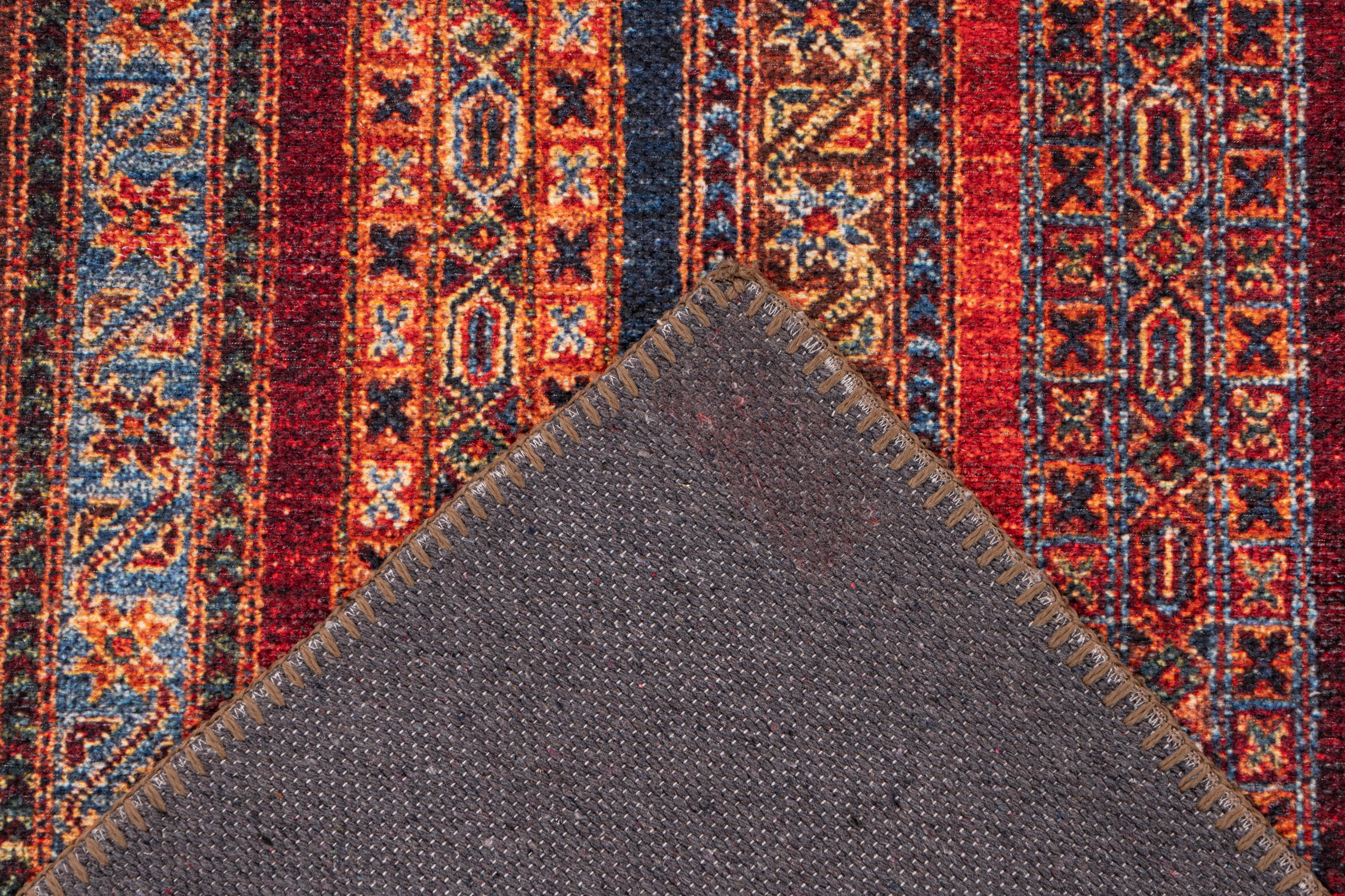 | Besonderheiten: | Flachgewebeteppich, Baumwollrücken, orientalisches Muster in Streifen laufend |