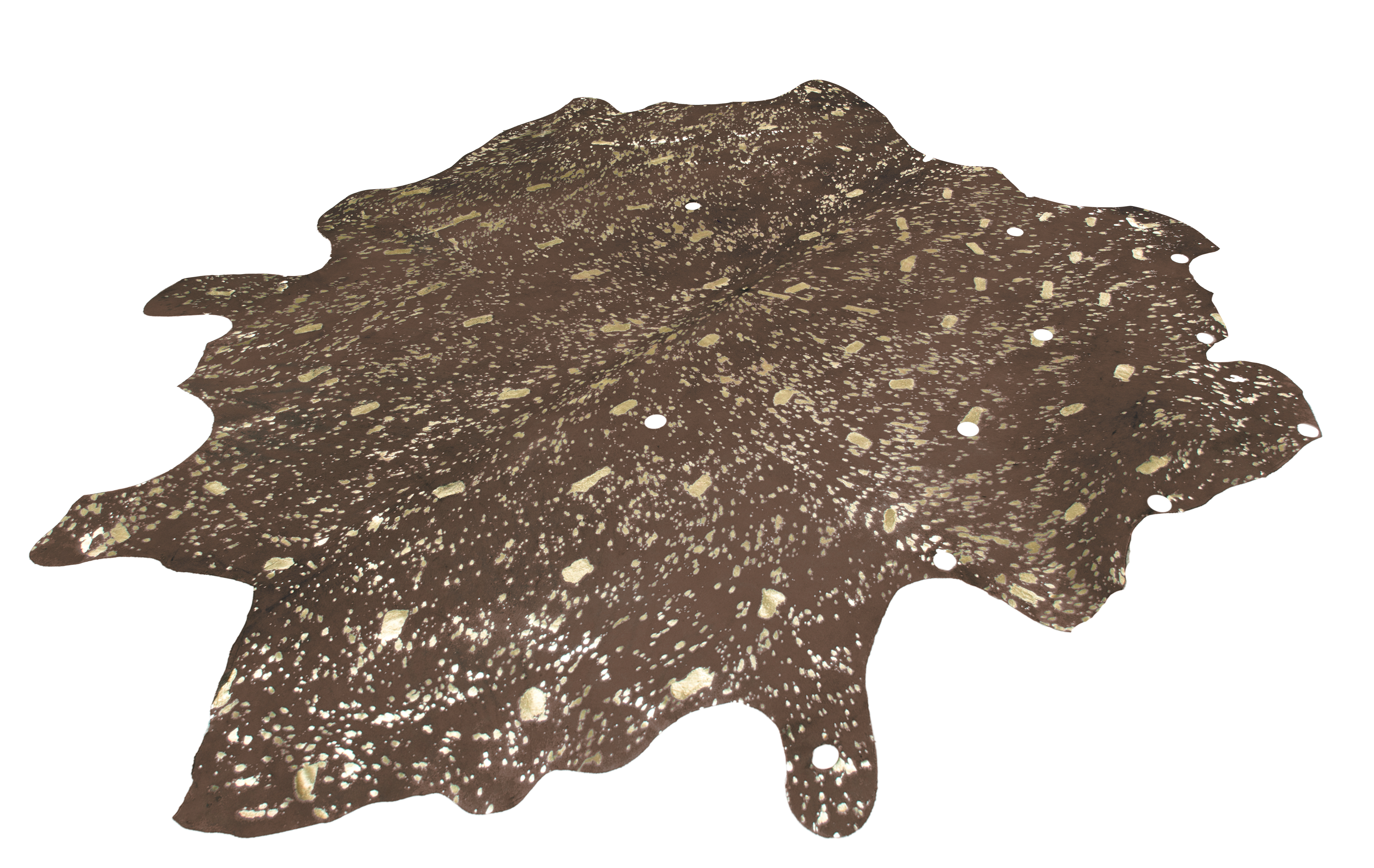 Dieser Naturteppich wurde aus echtem Rindsleder gefertigt und erhält seinen besonderen Charakter durch die moderne Einfärbung, edle metallische Akzente sowie die natürliche Kontur. Stilvolle Ausstanzungen, die in der Form und Größe variieren, verleihen dem Teppich eine einzigartige Optik. Schlichte, minimalistisch eingerichtete Räume können durch dieses Teppichmodell besonders gut aufgewertet werden. Durch das leichte Gewicht des flachen Flors kann das Modell nicht nur als Bodenbelag, sondern auch als Wandteppich oder Sitzauflage verwendet werden. So können Sie Ihr Zuhause ganz nach Ihren Vorstellungen einrichten und den Teppich in seiner Nutzung flexibel variieren. Besonders gut passt das Leder zu anderen natürlichen Materialien wie Holz oder Rattan. Der Gemütlichkeitsfaktor wird durch die Kombination mit schönen Kissen oder Sitzkissen aus Naturmaterialien verstärkt und bringt eine Wohlfühlatmosphäre in den gesamten Raum. Sie erhalten ein einzigartiges Unikat, das durch das Naturmaterial in Beschaffenheit, Struktur, Form und Farbe bis zu 30 % abweichen kann. Das natürliche Fell ist gefärbt und kann nach einiger Zeit und bei hoher Beanspruchung gegebenenfalls an Haaren verlieren und leicht abfärben. Ebenso könnte sich die Metallicfolie unter Umständen ablösen. Dies ist dem Naturprodukt und der Beschaffenheit des Fells geschuldet und kein Produktionsfehler.