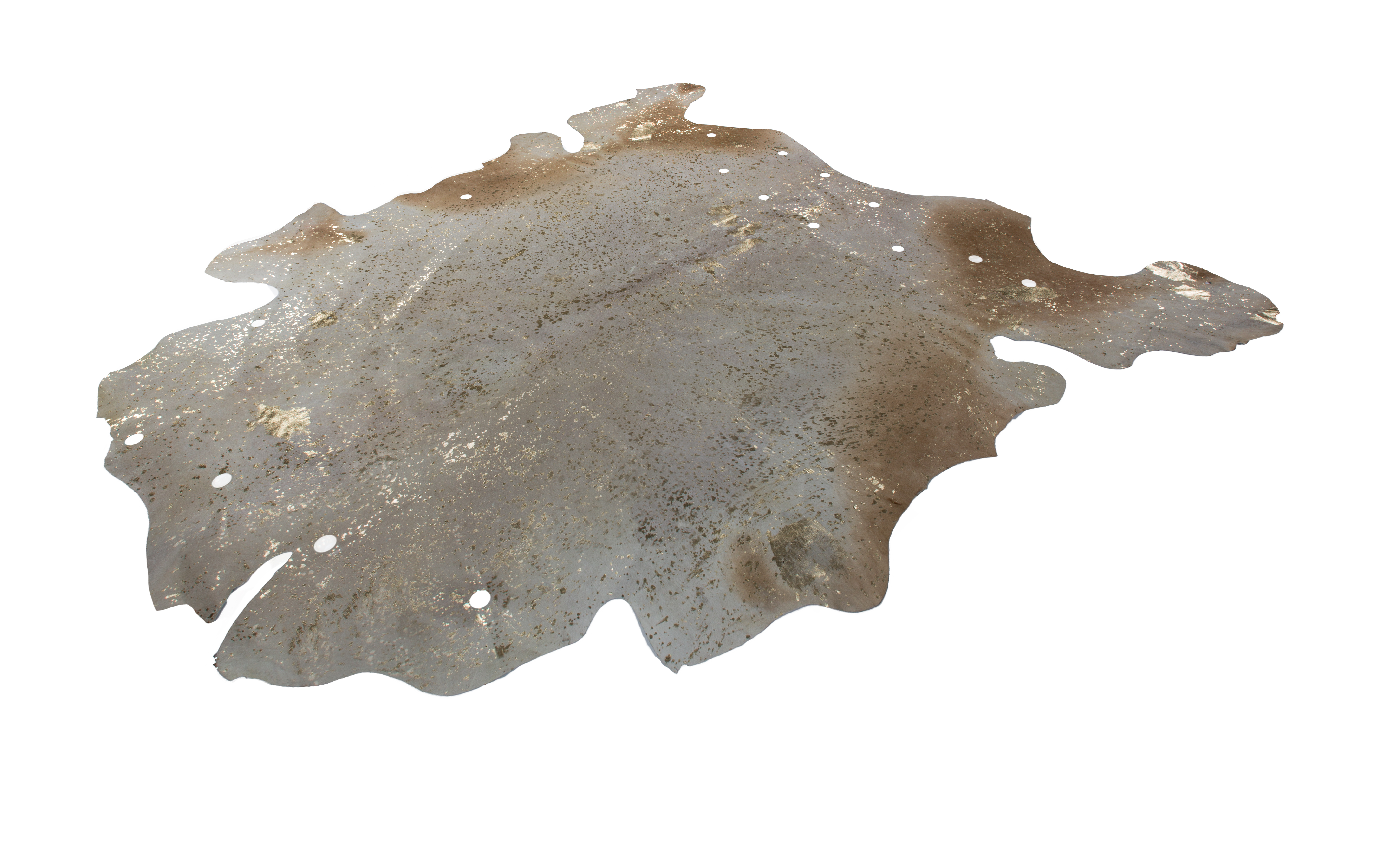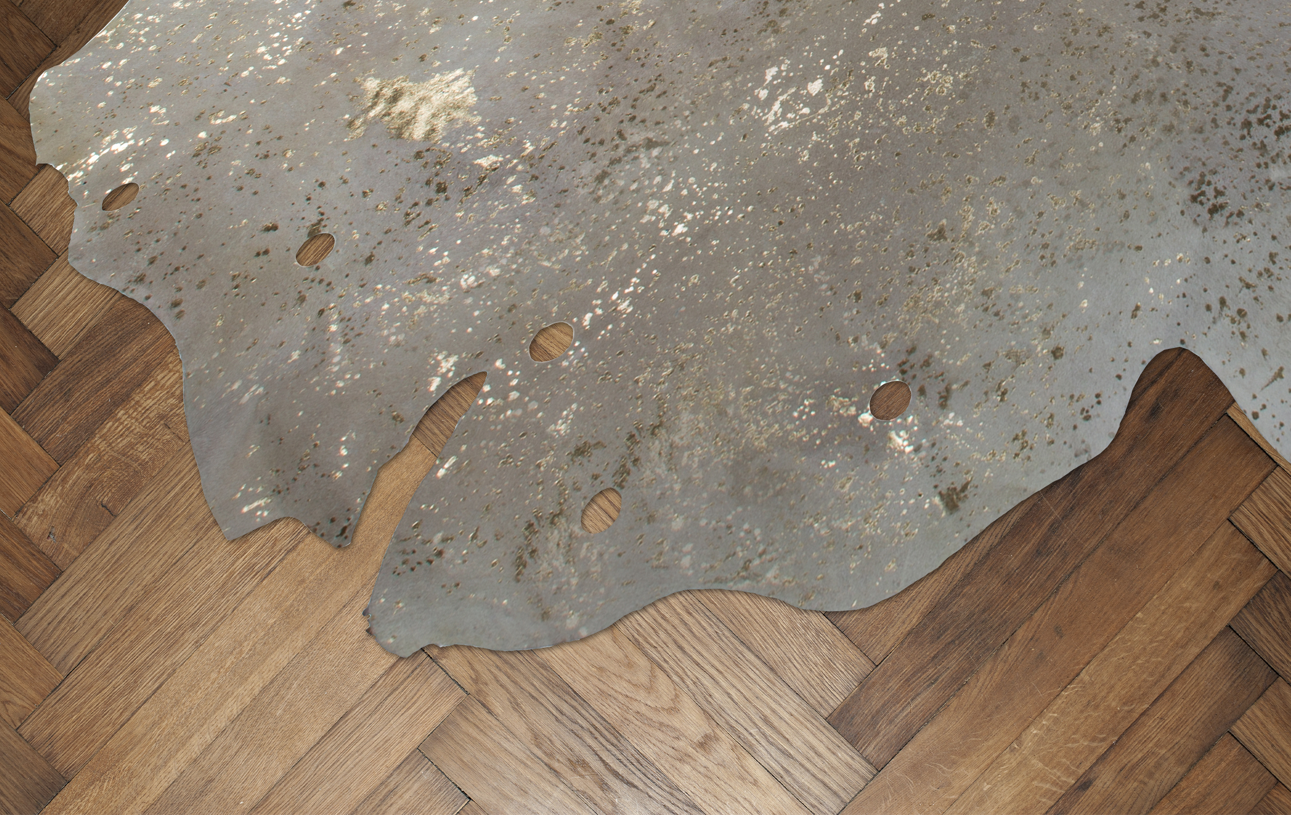 Dieser Naturteppich wurde aus echtem Rindsleder gefertigt und erhält seinen besonderen Charakter durch die moderne Einfärbung, edle metallische Akzente sowie die natürliche Kontur. Stilvolle Ausstanzungen, die in der Form und Größe variieren, verleihen dem Teppich eine einzigartige Optik. Schlichte, minimalistisch eingerichtete Räume können durch dieses Teppichmodell besonders gut aufgewertet werden. Durch das leichte Gewicht des flachen Flors kann das Modell nicht nur als Bodenbelag, sondern auch als Wandteppich oder Sitzauflage verwendet werden. So können Sie Ihr Zuhause ganz nach Ihren Vorstellungen einrichten und den Teppich in seiner Nutzung flexibel variieren. Besonders gut passt das Leder zu anderen natürlichen Materialien wie Holz oder Rattan. Der Gemütlichkeitsfaktor wird durch die Kombination mit schönen Kissen oder Sitzkissen aus Naturmaterialien verstärkt und bringt eine Wohlfühlatmosphäre in den gesamten Raum. Sie erhalten ein einzigartiges Unikat, das durch das Naturmaterial in Beschaffenheit, Struktur, Form und Farbe bis zu 30 % abweichen kann. Das natürliche Fell ist gefärbt und kann nach einiger Zeit und bei hoher Beanspruchung gegebenenfalls an Haaren verlieren und leicht abfärben. Ebenso könnte sich die Metallicfolie unter Umständen ablösen. Dies ist dem Naturprodukt und der Beschaffenheit des Fells geschuldet und kein Produktionsfehler.
