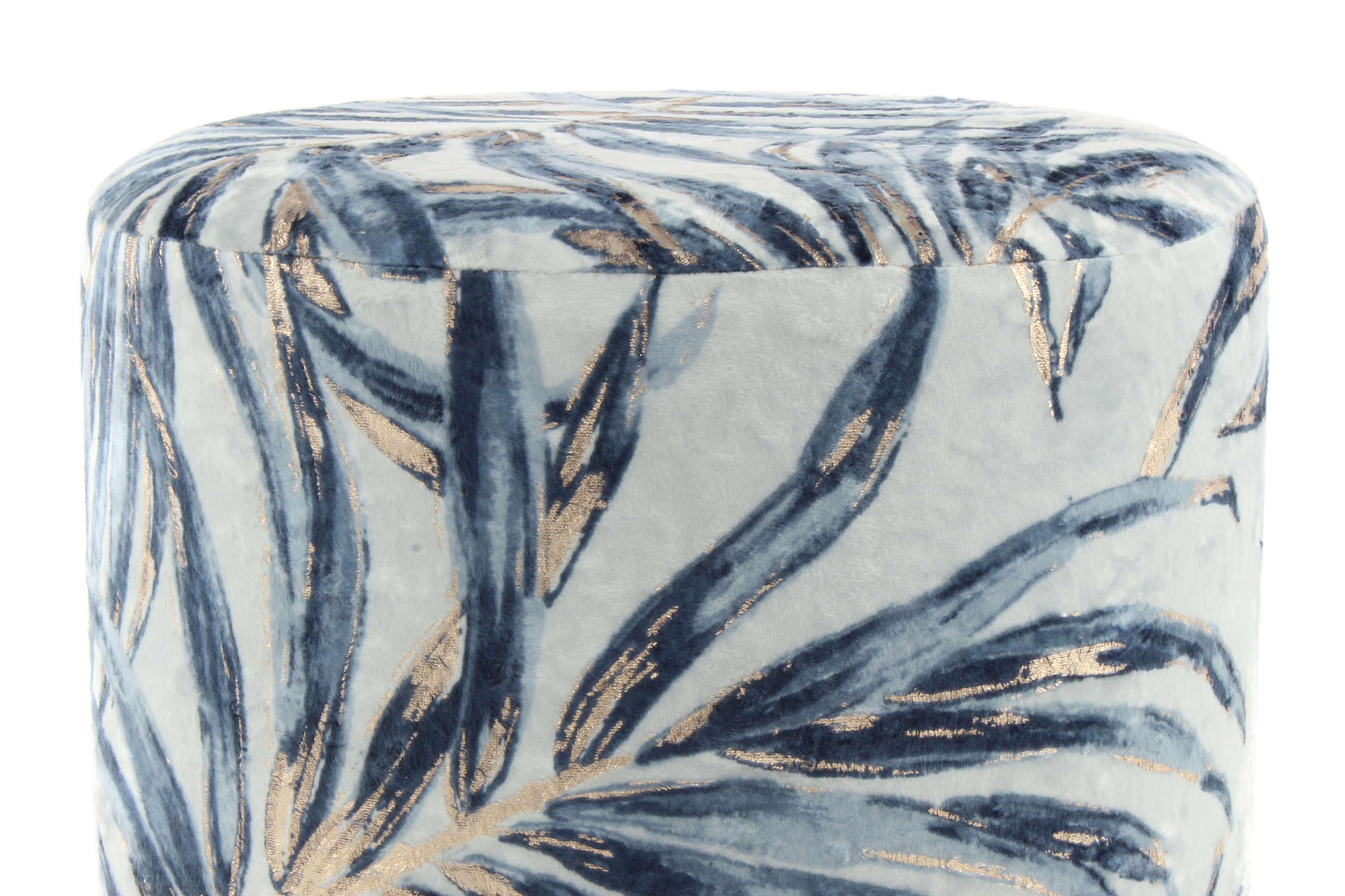 Dieser Hocker vereint eine moderne runde Form mit einer stillvollen floralen Gestaltung. Die glamouröse Optik wird durch den samtweichen Stoffbezug mit glanzvollen metallischen Verzierungen intensiviert.