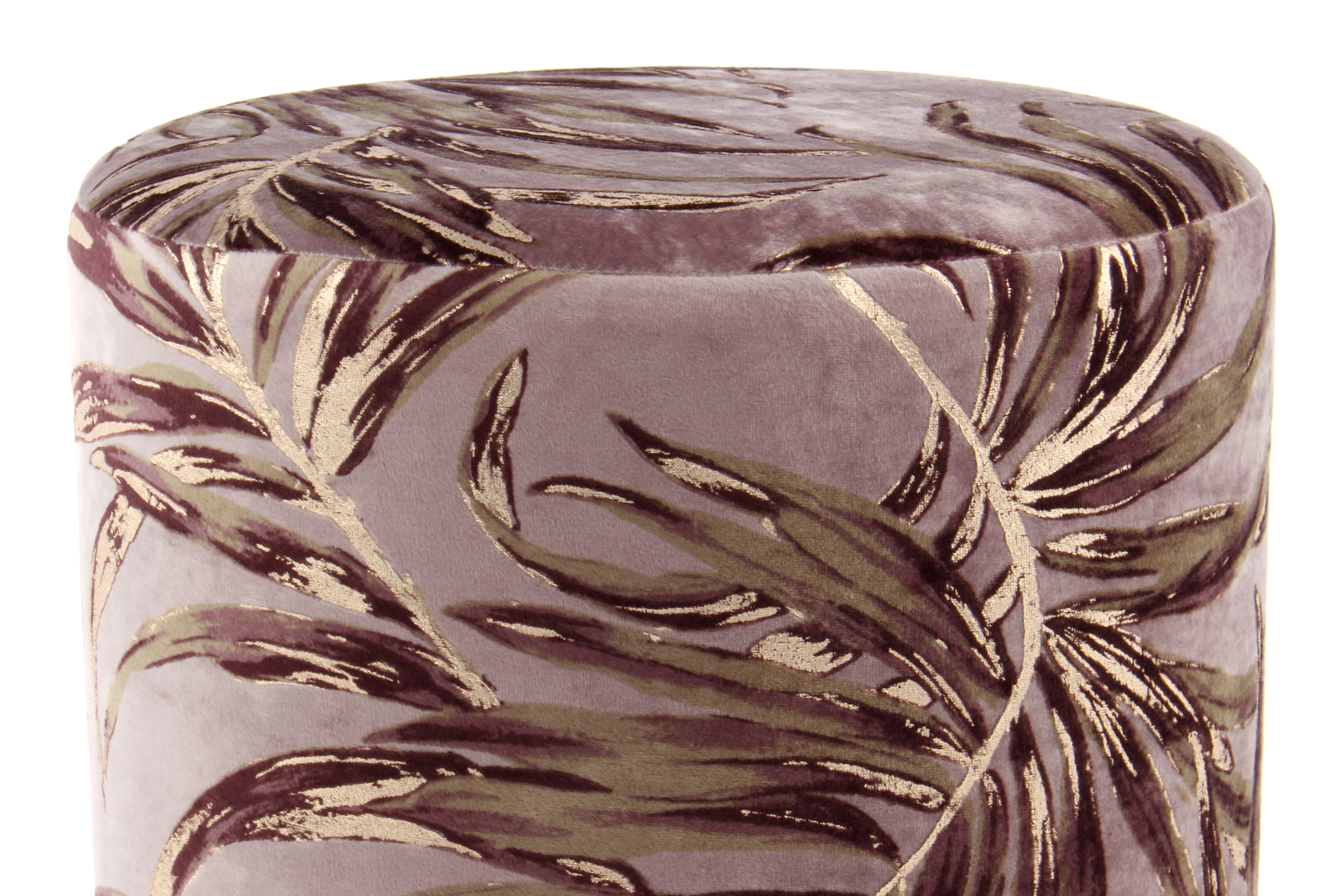 Dieser Hocker vereint eine moderne runde Form mit einer stillvollen floralen Gestaltung. Die glamouröse Optik wird durch den samtweichen Stoffbezug mit glanzvollen metallischen Verzierungen intensiviert.