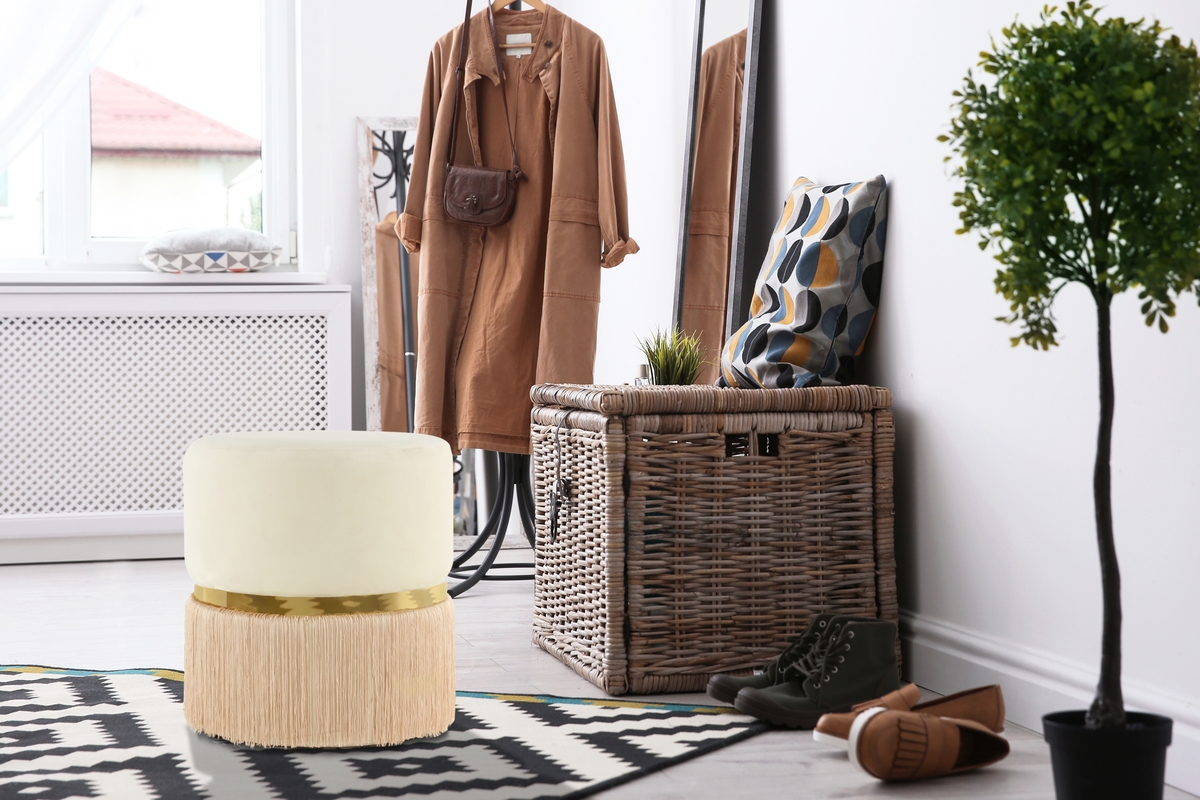 Dieser Hocker ist nicht nur optisch, sondern auch haptisch eine gute Wahl. Die moderne Runde Form mit schlichtem, samtweichem Bezug wird durch Fransen im unteren Bereich stilvoll aufgepeppt. Durch einen eleganten Ring aus Metall entsteht ein harmonischer Übergang zwischen der samtigen Sitzfläche und den langen Fransen.