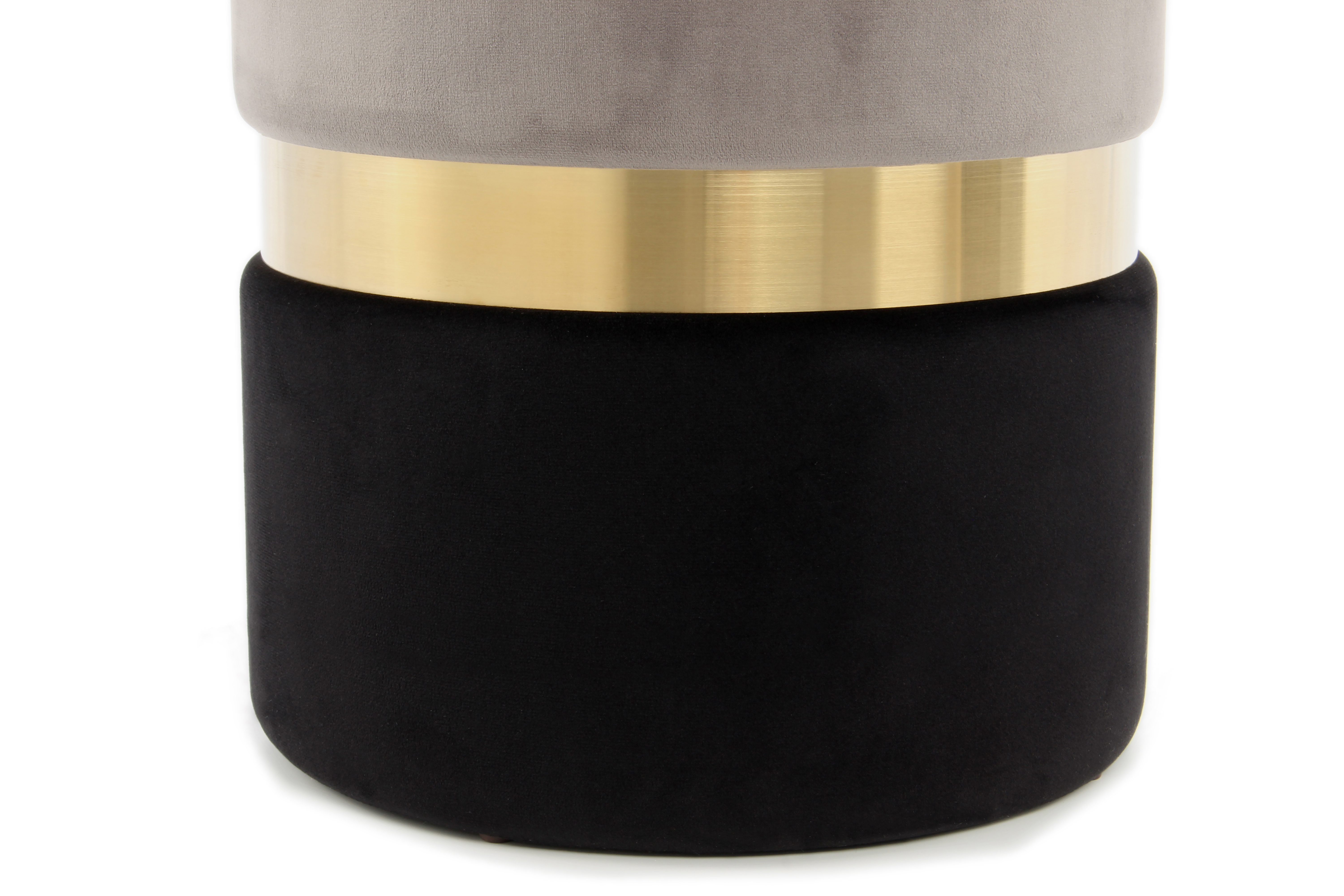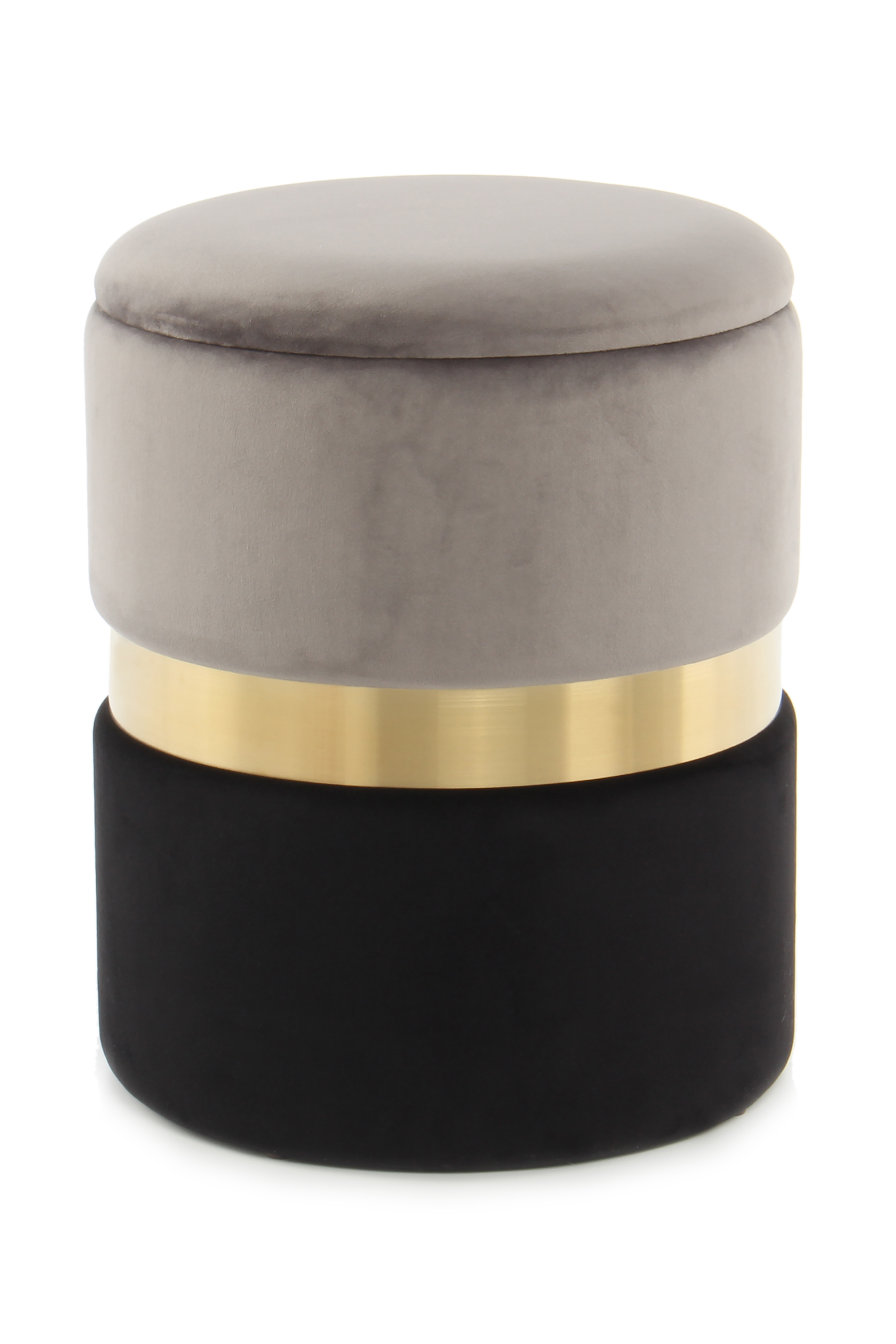 Mit diesem Set erhalten Sie zwei Hocker in unterschiedlichen Größen, aber gleichem Design. Die moderne zweifarbige Gestaltung erhält durch einen edlen Ring aus Metall einen glamourösen Charakter. Die beiden Farben werden durch den Ring optisch voneinander getrennt und bilden dennoch eine harmonische Einheit. Durch den samtweichen Bezug aus Stoff und die runde Form wirken die Hocker bereits optisch weich.