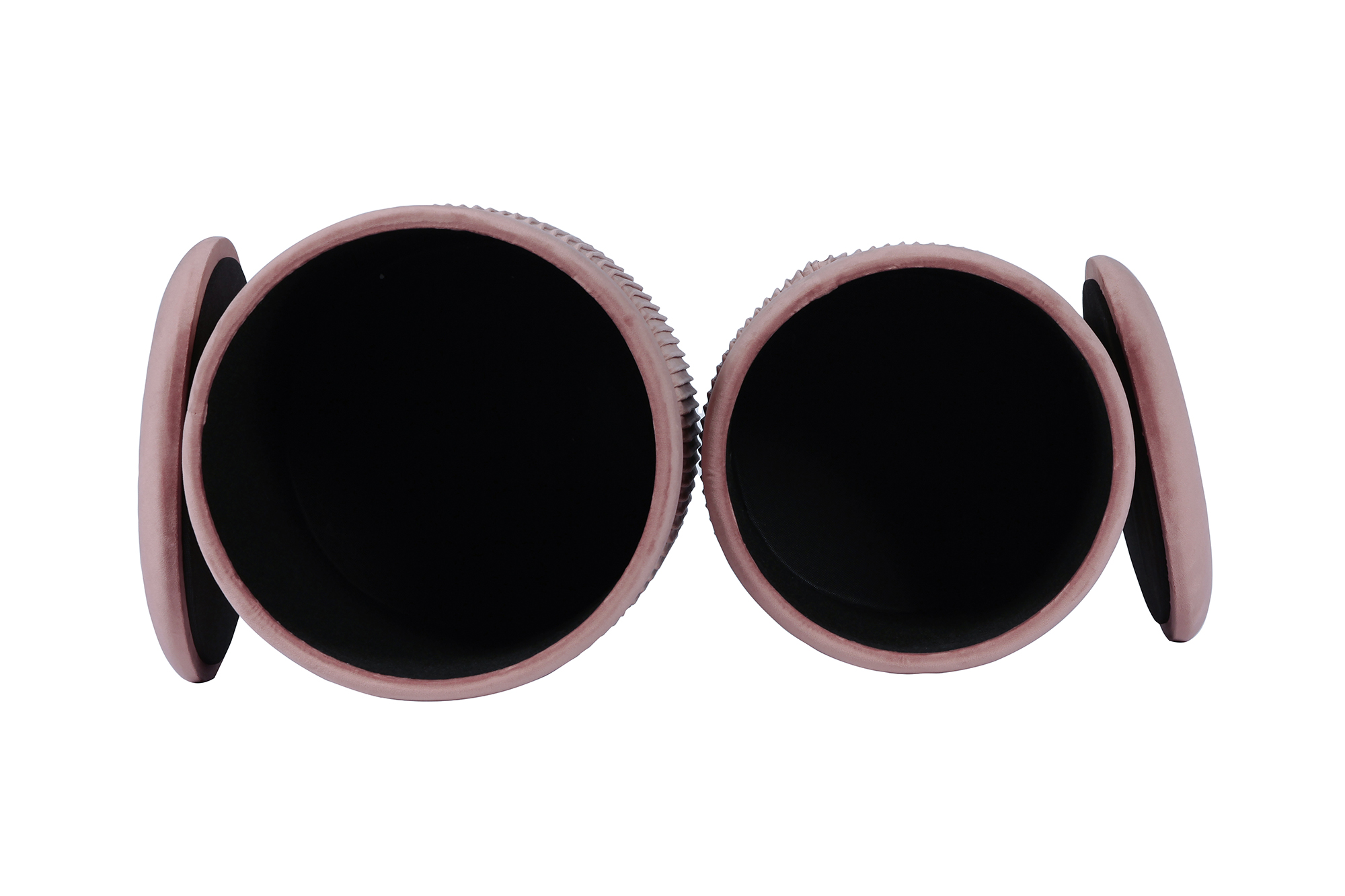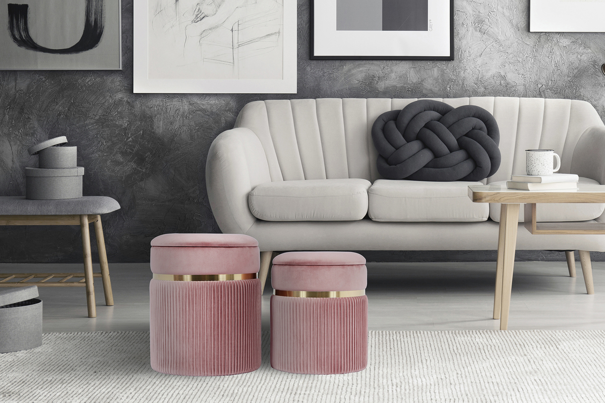 Mit diesem Set erhalten Sie zwei Hocker in unterschiedlichen Größen, aber gleichem Design. Die zeitlose Gestaltung erhält durch einen edlen Ring aus Metall einen glamourösen Charakter. Die beiden Stoffmuster werden durch den Ring optisch voneinander getrennt und bilden eine harmonische Einheit. Durch den samtweichen Bezug aus Stoff und die runde Form wirken die Hocker bereits optisch weich.