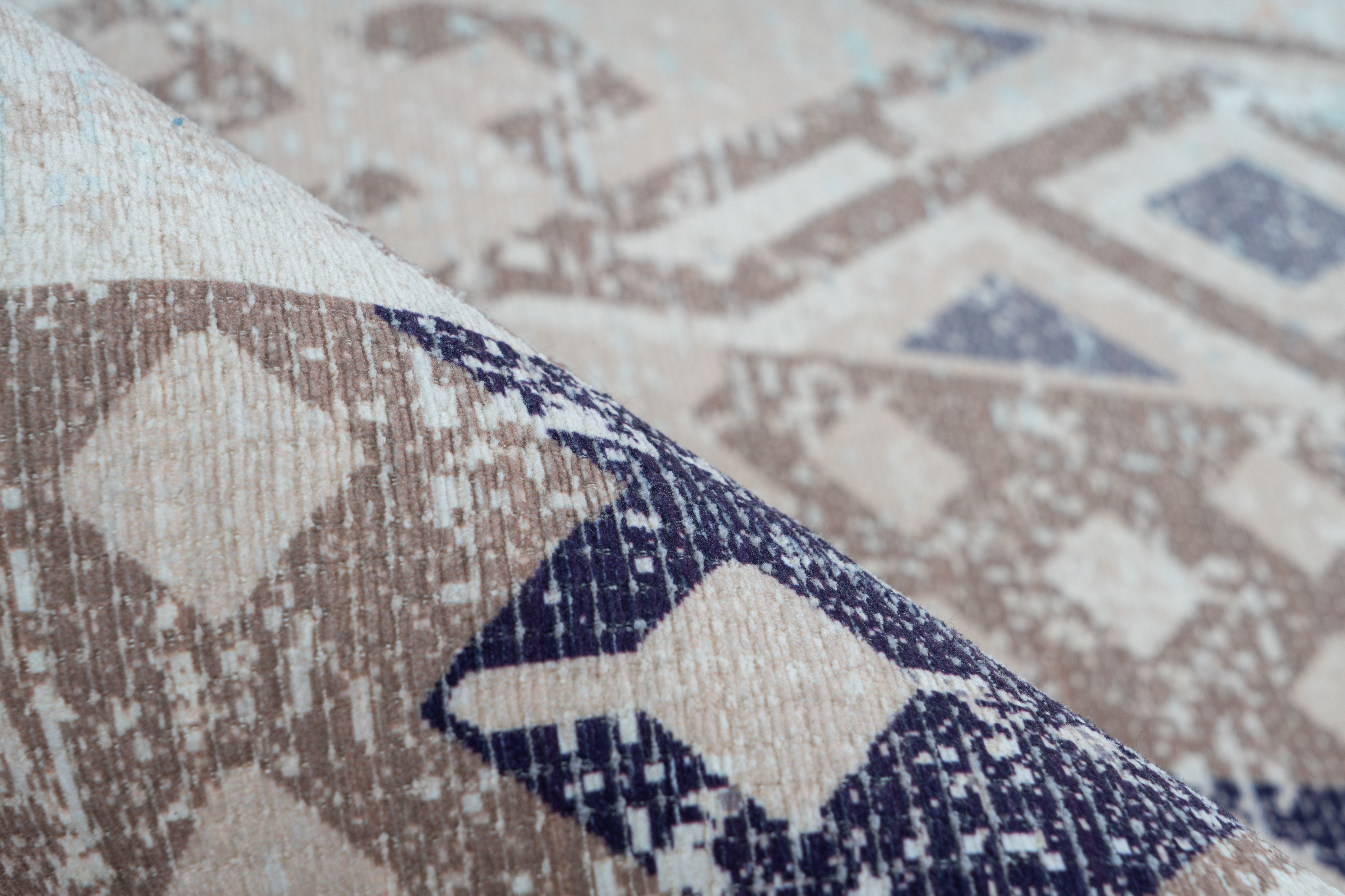 Dieser Teppich mit flachem Flor wird durch das geprintete Vintage-Design zum Blickfang in jedem Wohnbereich. Das Muster vereint einen attraktiven Ethno-Style mit für den Vintage-Stil typischen Verwaschungen und sorgt so für einen besonderen Look. Durch die Kombination mit attraktiven Wohnaccessoires wie Sitzpoufs oder Sofakissen im Vintage-Stil können Sie das Einrichtungskonzept verstärken und Ihren ganz individuellen Style einbringen. Zu modernen, schlichten Möbeln, beispielsweise aus Holz, lässt sich das attraktive Design optimal kombinieren, denn dort kommt er besonders gut zur Geltung. Die Vielseitigkeit des Teppichs macht ihn zu einem Allrounder, der in nahezu jedem Wohnstil seinen Platz finden kann. Die Pflegeleichtigkeit des flachen Flors ist ein weiterer Pluspunkt des Modells. Er kann auch in Räumen mit Fußbodenheizung eingesetzt werden. Verstärkt ist der Flor mit einem Rücken aus Canvas.