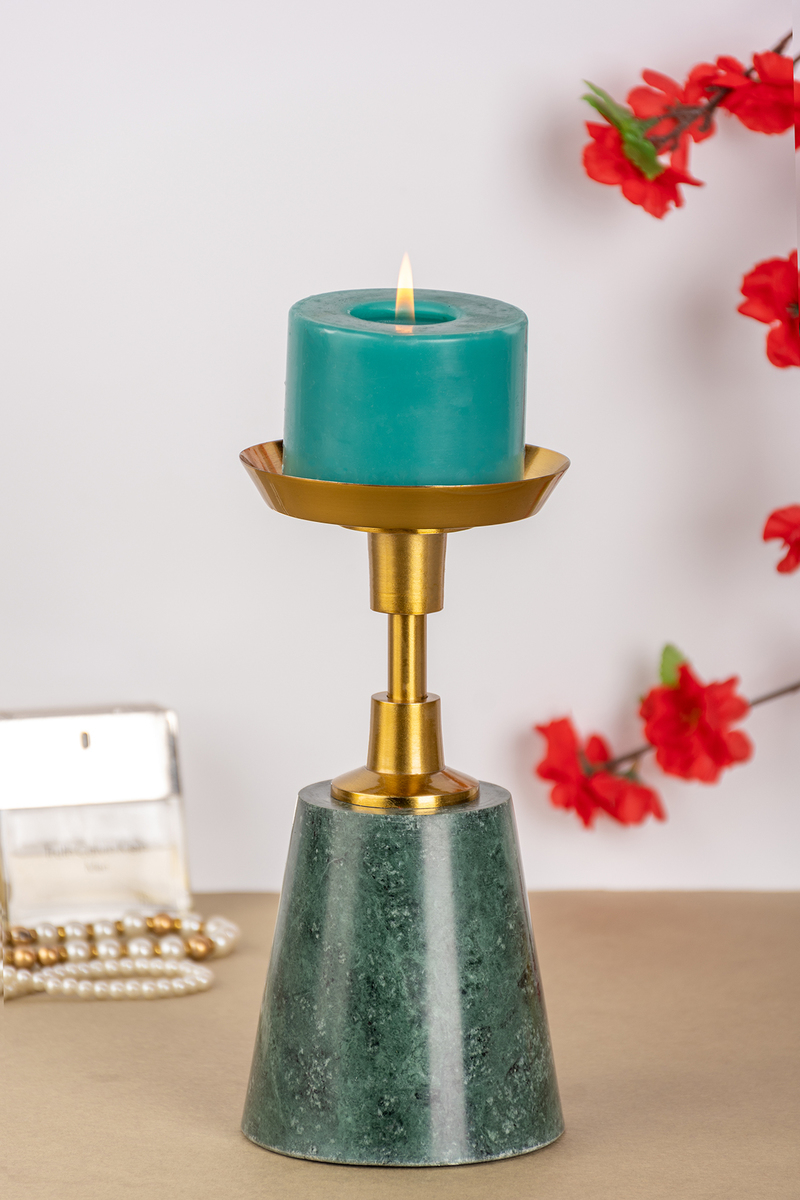 Dieser attraktive Kerzenhalter rückt alle Räumlichkeiten in das richtige Licht. Stilsicher und attraktiv vereint er gekonnt unterschiedliche Elemente zu einem luxuriösen Finish, ohne aufgedeckt zu wirken. Der Kerzenständer schafft dies durch seine Beschaffenheiten welche sich aus den hochwertigen Materialien Marmor und Eisen zusammensetzen. Das hervortretende Erscheinungsbild überträgt er spielend auf seine Umgebung. Der festliche gedeckte Tisch oder das alleinstehende Regal versetzt mit seinem Kerzenschein in ein gewisses Ambiente. Hervorzuheben sind die hochwertigen Materialien, die verarbeitet wurden. Der in Handarbeit gefertigte Kerzenhalter ist hervorragend verarbeitet. Der Marmorfuß und der aus Aluminium bestehende Halter passen einander hervorragend an. Im Lieferumfang sind keine Kerzen enthalten.