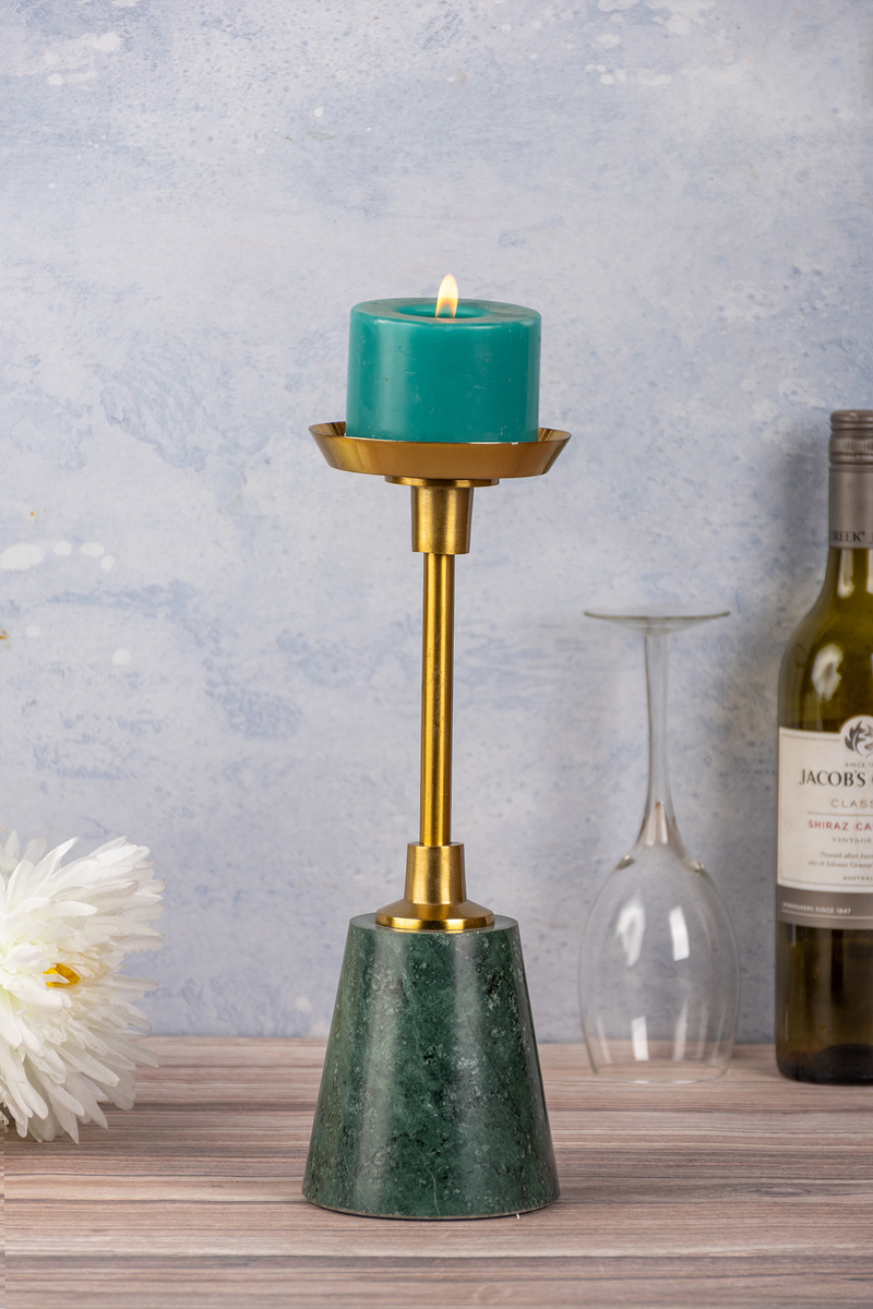 Dieser attraktive Kerzenhalter rückt alle Räumlichkeiten in das richtige Licht. Stilsicher und attraktiv vereint er gekonnt unterschiedliche Elemente zu einem luxuriösen Finish, ohne aufgedeckt zu wirken. Der Kerzenständer schafft dies durch seine Beschaffenheiten welche sich aus den hochwertigen Materialien Marmor und Eisen zusammensetzen. Das hervortretende Erscheinungsbild überträgt er spielend auf seine Umgebung. Der festliche gedeckte Tisch oder das alleinstehende Regal versetzt mit seinem Kerzenschein in ein gewisses Ambiente. Hervorzuheben sind die hochwertigen Materialien, die verarbeitet wurden. Der in Handarbeit gefertigte Kerzenhalter ist hervorragend verarbeitet. Der Marmorfuß und der aus Aluminium bestehende Halter passen einander hervorragend an. Im Lieferumfang sind keine Kerzen enthalten.
