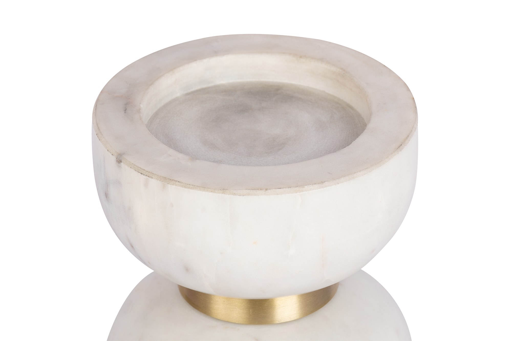 Bei diesem edlen Kerzenhalter bekommt jeder leuchtende Augen – dafür sorgt neben dem Kerzenlicht auch das stilvolle Design. Handgefertigt aus stabilem Marmor brilliert der dekorative Kerzenhalter durch die charakteristische Maserung. Diese begründet die andauernde Faszination von Marmor und erhebt jedes Stück zu einem wunderschönen Unikat. Der mittig thronende Metallring in Gold verleiht der Optik eine luxuriöse Eleganz, die jeden Einrichtungsstil mächtig aufwertet. Vor allem auf herrlich geschmückten Festtafeln begeistert der edle Kerzenhalter in verschiedenen Varianten und setzt auf einzigartige Weise warmes Kerzenlicht in Szene.