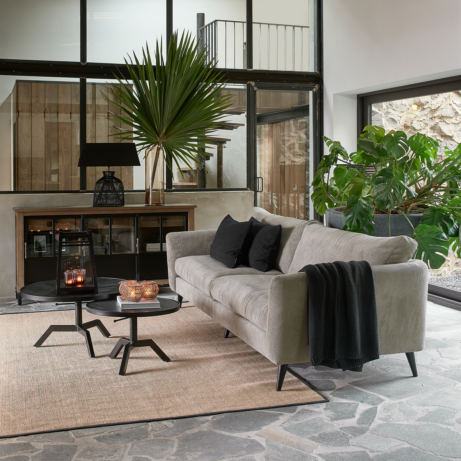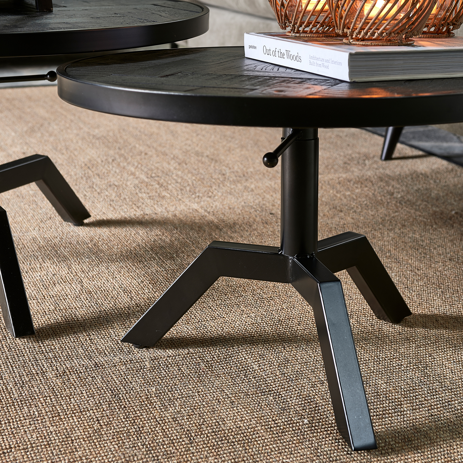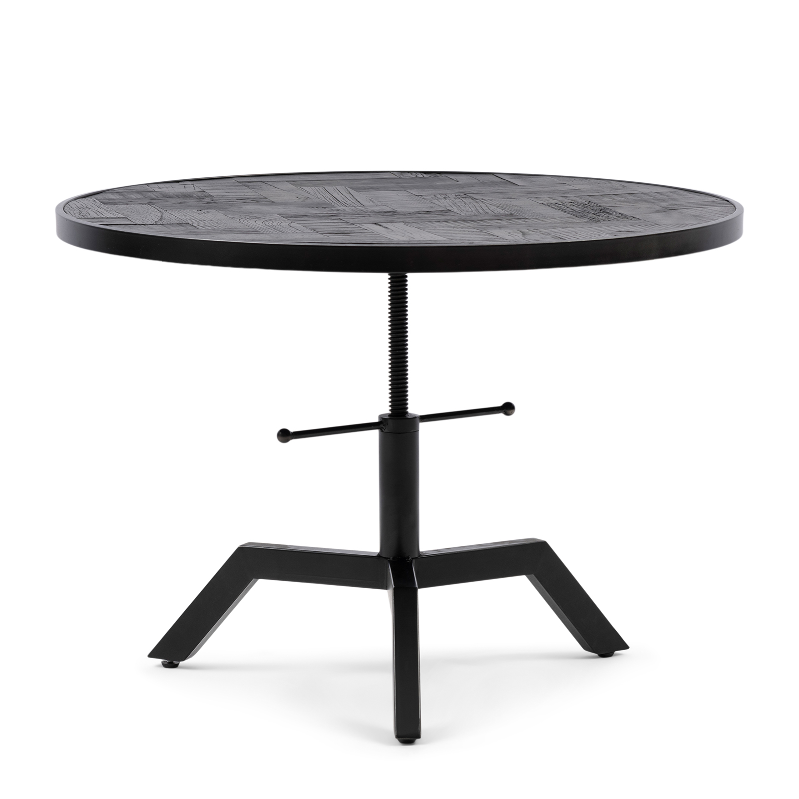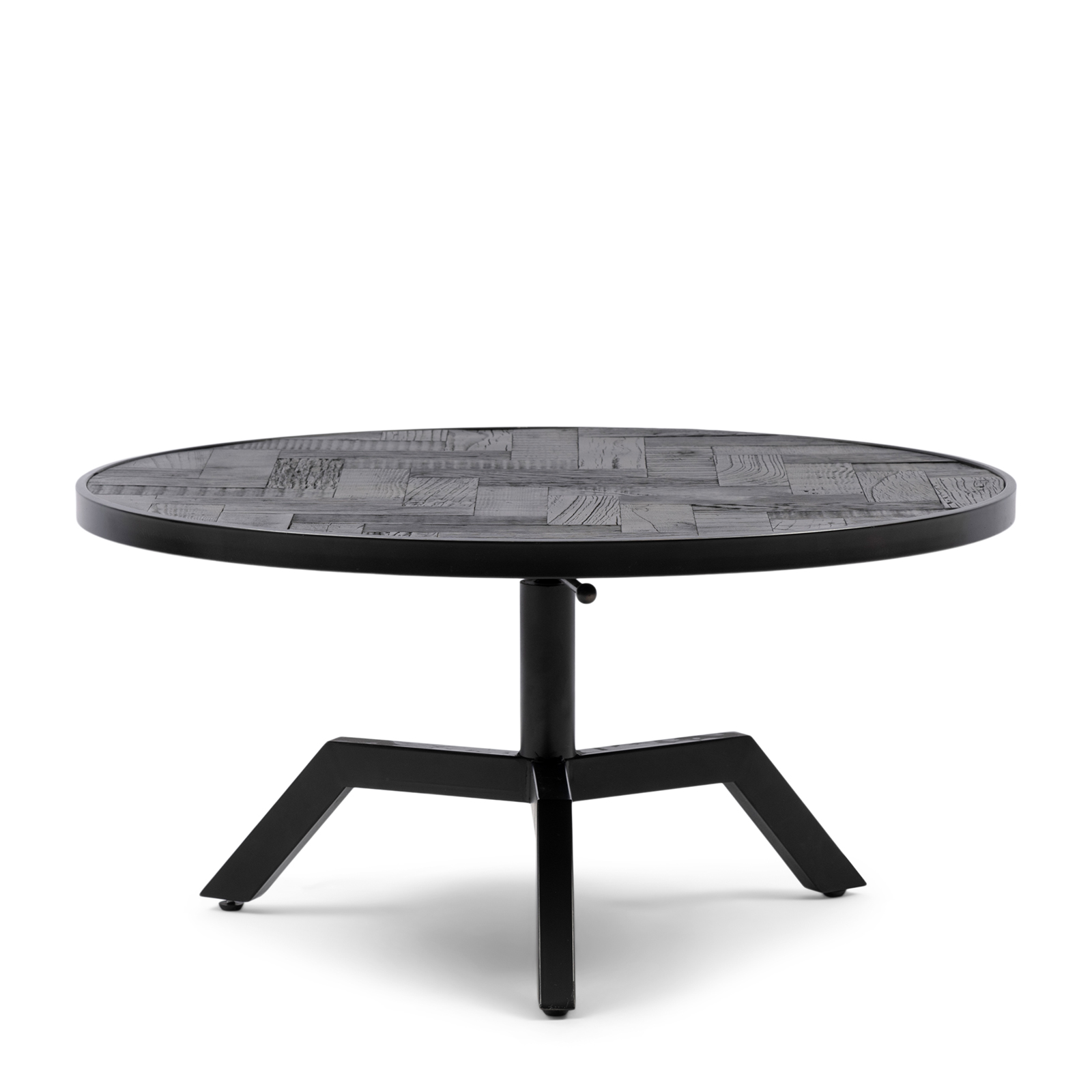 Die Platte dieses Couchtisches springt direkt ins Auge. Wunderschön eingearbeitet, mit verschiedenen Holzarten. Das Gestell und der Rand der Platte sind aus schwarzem Metall gefertigt. Der Tisch ist höhenverstellbar und passt hervorragend in eine industrielle Einrichtung. Es sind zwei Größen erhältlich.