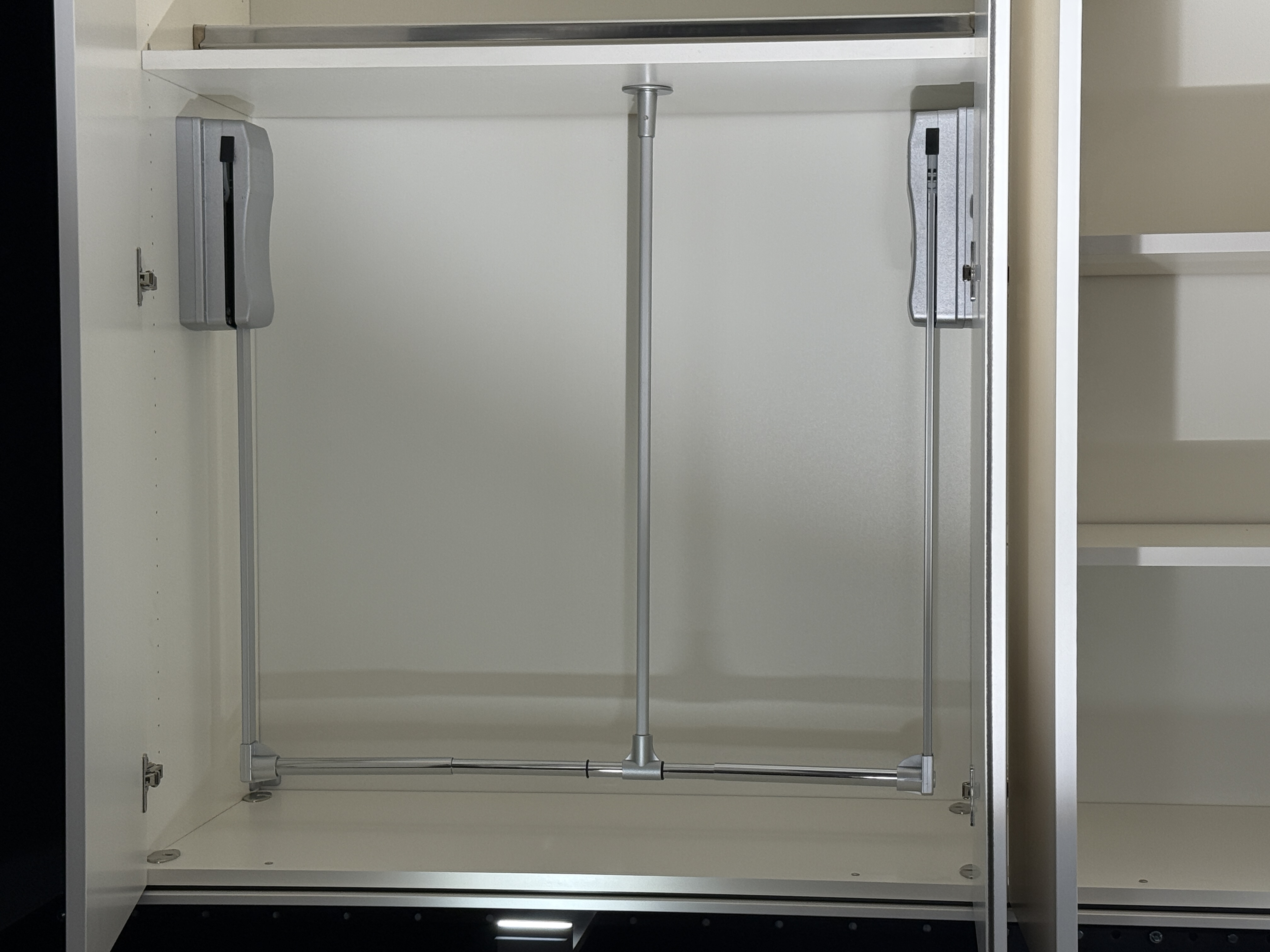 Der linke und rechte Bereich bieten viel Platz zum Aufhängen langer Kleidung wie Mäntel, Kleider oder Blusen. Im mittleren Segment findest du mehrere Einlegeböden für Pullover, Taschen oder gefaltete Wäsche sowie praktische Schubfächer für kleinere Accessoires. Zusätzlich sorgt ein ausziehbarer Hosenauszug für Ordnung und schnellen Zugriff – ideal für den Alltag.