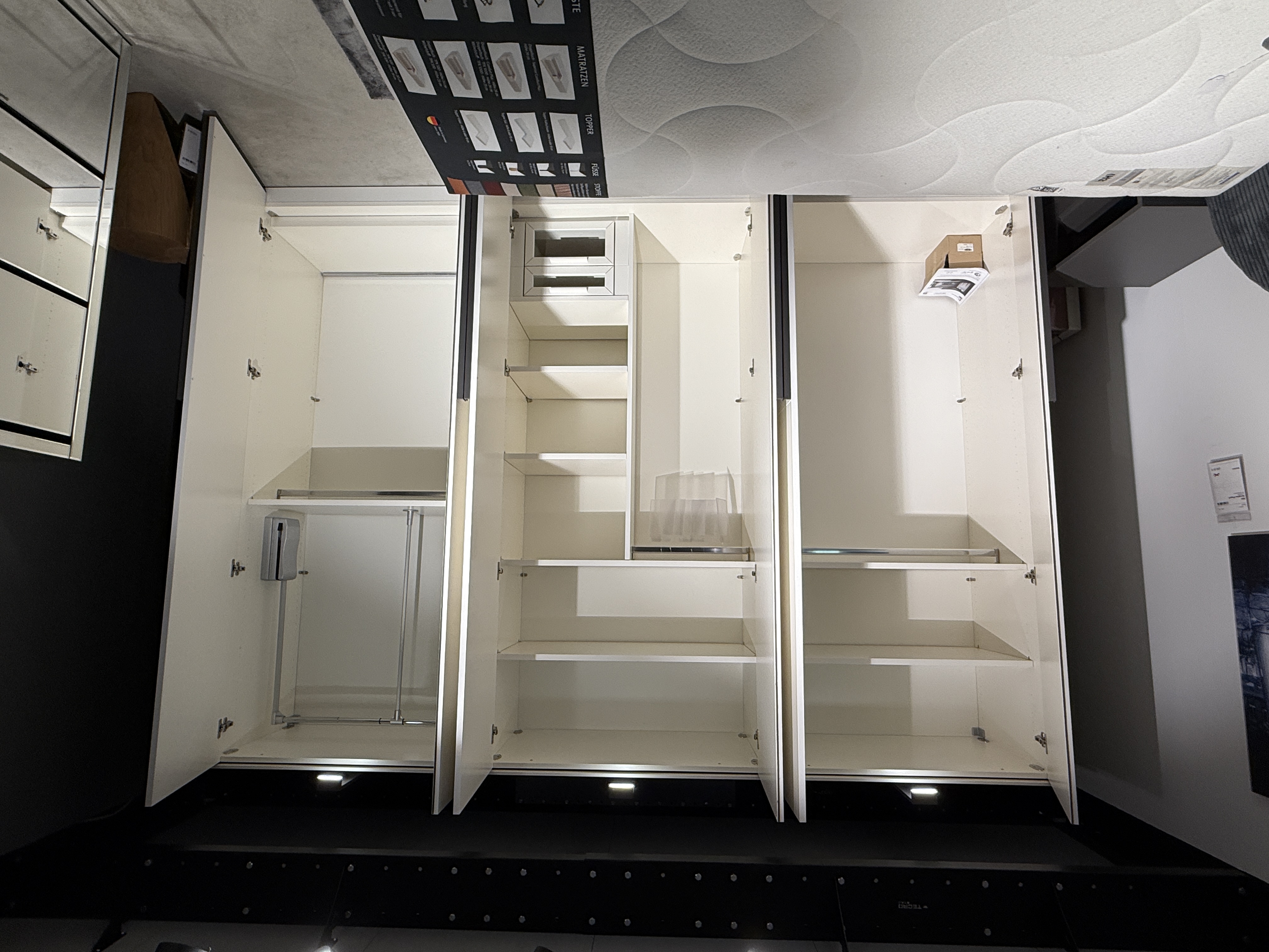 Jeder Bereich ist mit einer eigenen LED-Leuchte ausgestattet, die für perfekte Sicht sorgt und das Innere des Schranks stilvoll in Szene setzt – ob morgens beim Aussuchen des Outfits oder abends beim Verstauen.