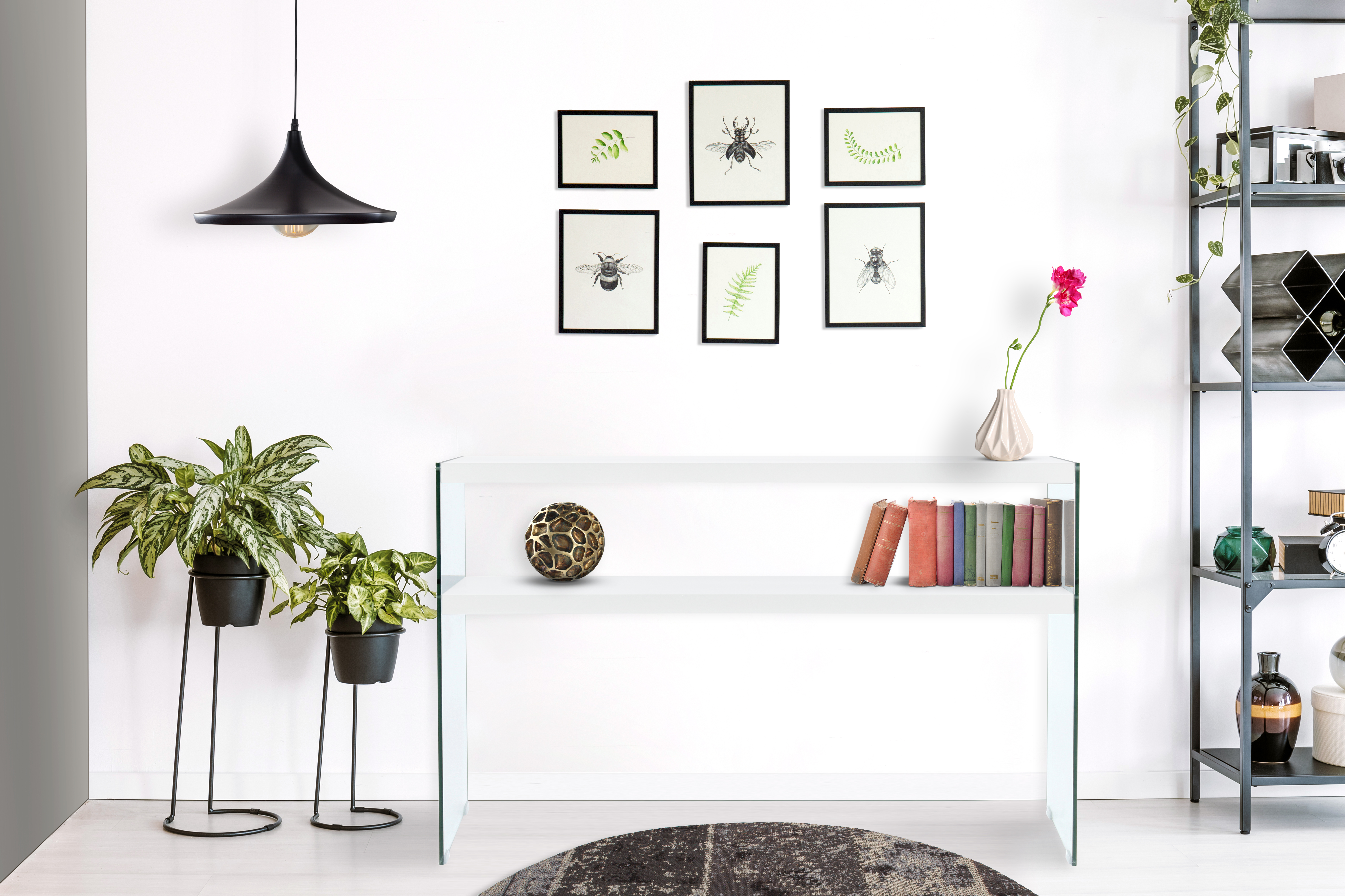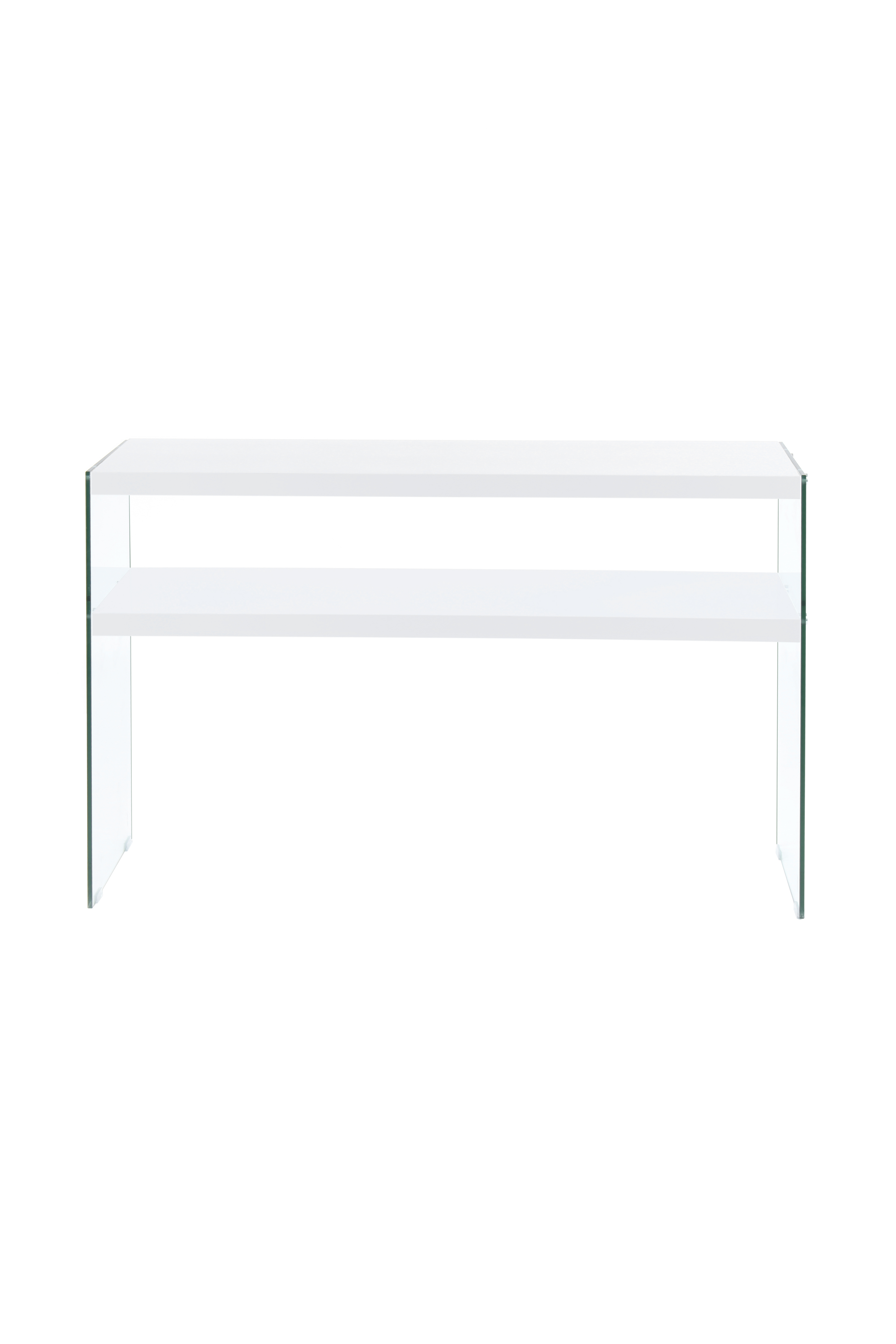 Das moderne Design dieses Konsolentisches zeichnet sich durch die transparenten Glas-Seitenwände und die unifarbenen Ablageflächen aus. Gleichzeitig ist das Design unaufdringlich und kann in verschiedene Einrichtungsstile integriert werden. Der Konsolentisch ist Bestandteil einer Möbelserie, sodass Sie durch die Kombination mit weiteren Möbelstücken ein einheitliches, harmonisches Gesamtambiente im Raum schaffen können.