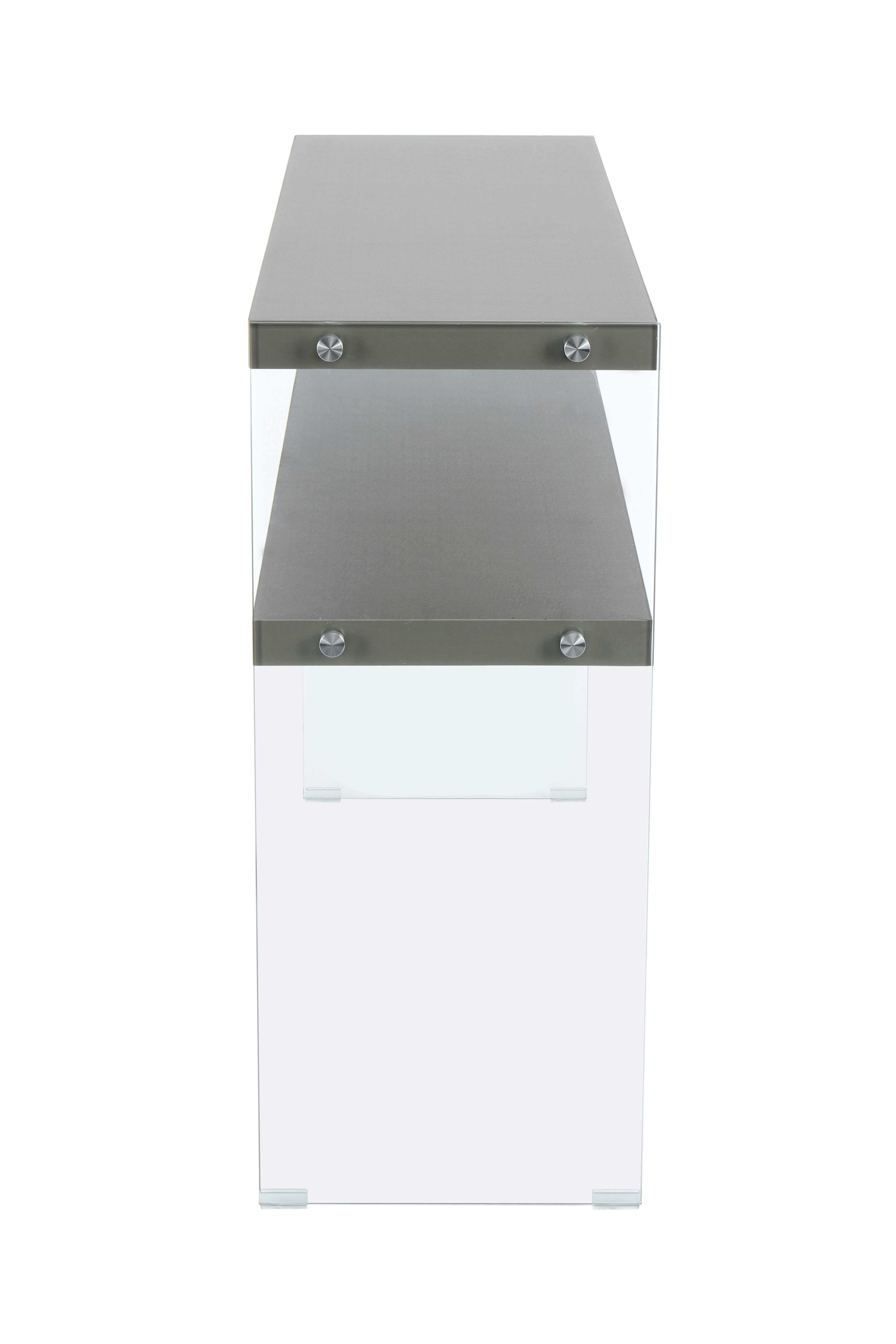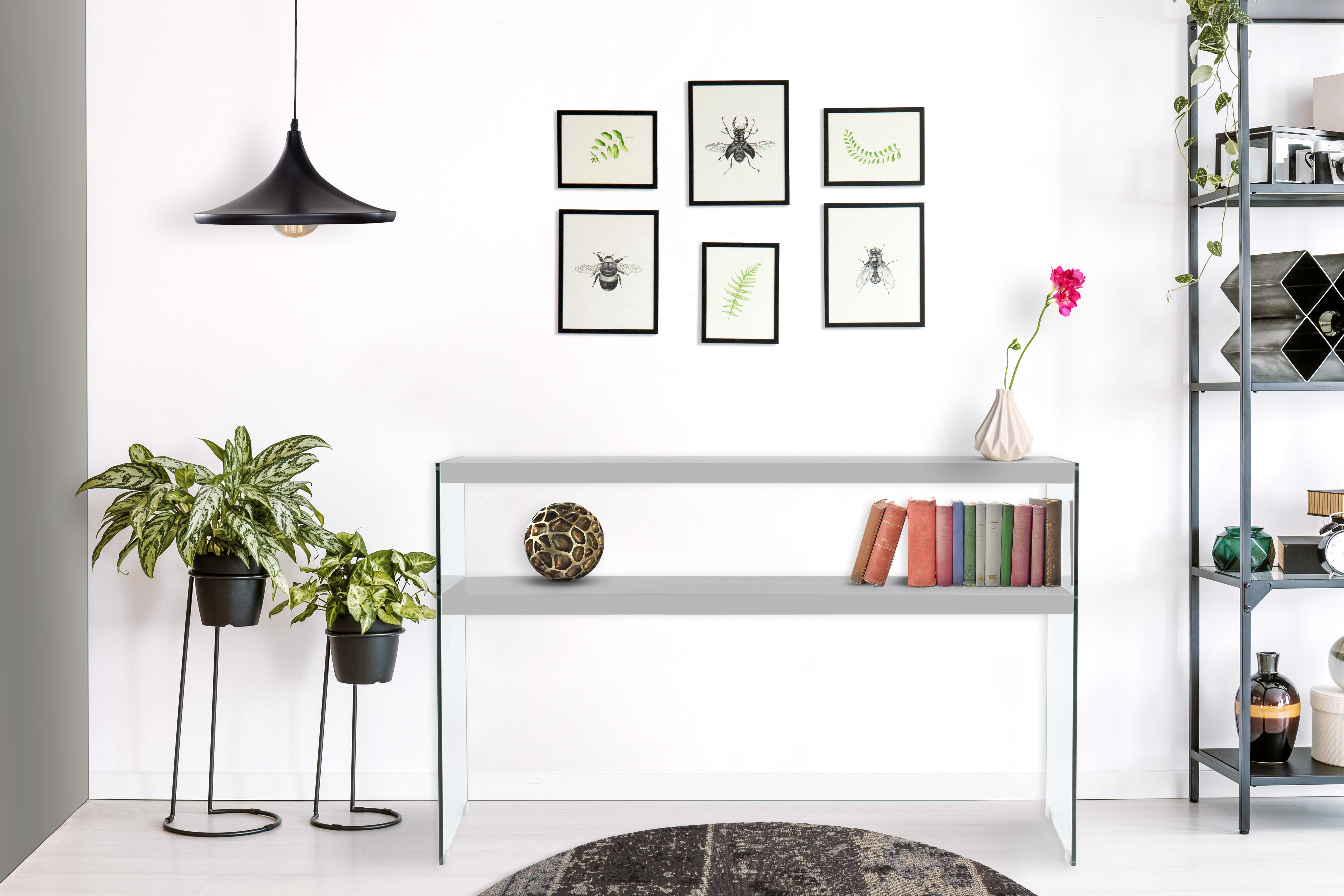 Das moderne Design dieses Konsolentisches zeichnet sich durch die transparenten Glas-Seitenwände und die unifarbenen Ablageflächen aus. Gleichzeitig ist das Design unaufdringlich und kann in verschiedene Einrichtungsstile integriert werden. Der Konsolentisch ist Bestandteil einer Möbelserie, sodass Sie durch die Kombination mit weiteren Möbelstücken ein einheitliches, harmonisches Gesamtambiente im Raum schaffen können. Auf dem Konsolentisch können ideal Dinge platziert werden, die Sie gerne griffbereit haben möchten. Egal ob als Tisch im Wohnzimmer oder als Ablage im Flur – der Tisch ist vielseitig einsetzbar und ein praktisches und zugleich dekoratives Möbelstück. Durch die schmale Form kann er einfach an der Wand platziert werden und benötigt auch in kleinen und engen Räumen nur wenig Platz. Richten Sie sich mit Möbeln dieser Möbelserie in Ihrem Zuhause stilvoll ein und kombinieren Sie beispielsweise Konsolentisch und Regal miteinander. Das Möbelstück kann in seiner tatsächlichen Farbgebung von den Bildern abweichen.