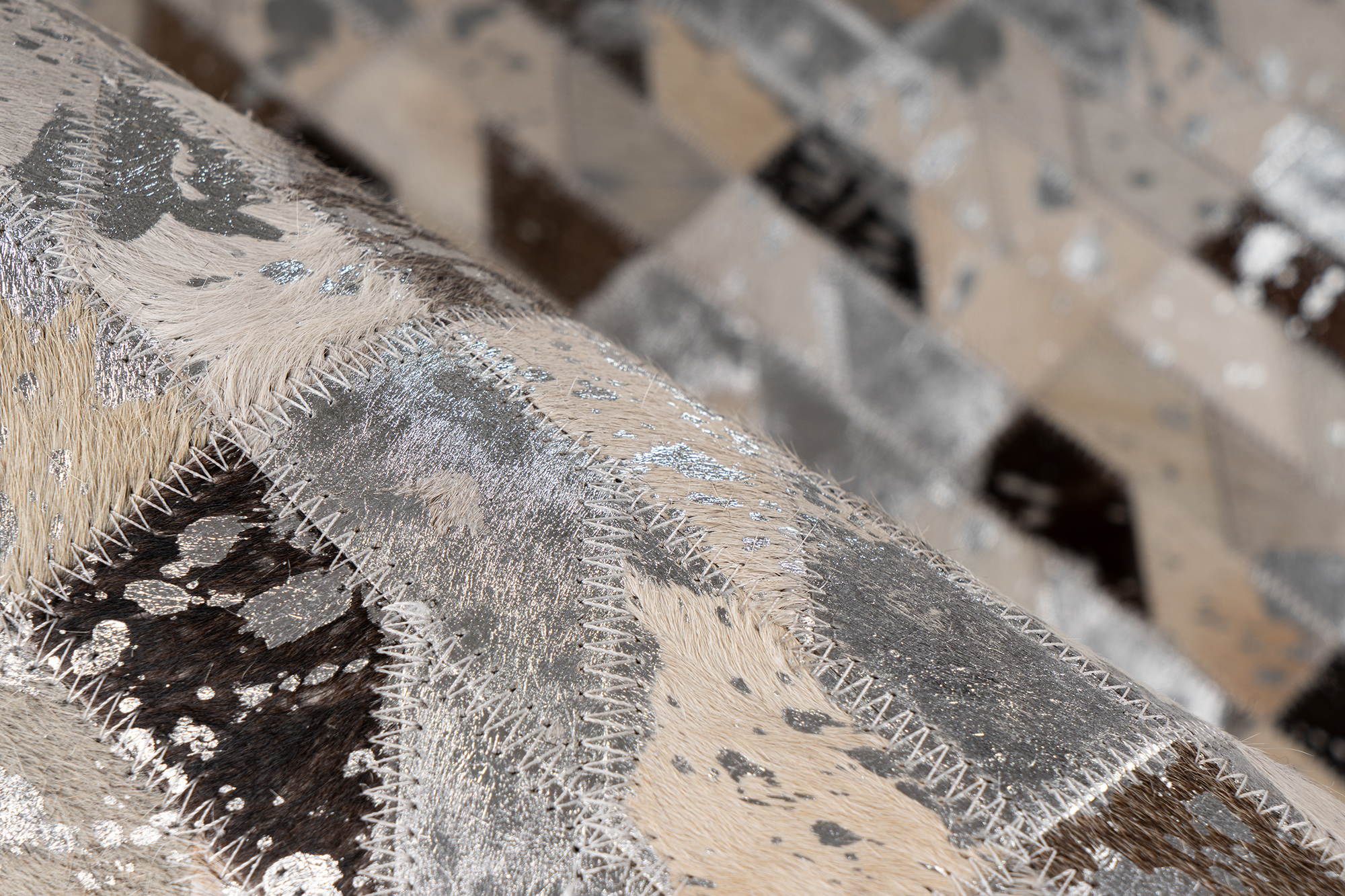 Mit seiner charmanten Erscheinung wertet dieser Teppich Innenräume im Handumdrehen auf. Die zusammen genähten Lederstücke sorgen für eine einzigartige Lederoptik und fügen sich so zu einem Unikat zusammen. Das entstehende Gesamtbild hat Charakter dank der unterschiedlichen Nuancen des Materials. Stilvoll und unaufdringlich unterstreicht diese Einmaligkeit eines jeden Stückes die Individualität des Besitzers. Die angewandte Kunst hat bereits seit der Antike bestand und tritt nun in modernen Gewandt erneut in Erscheinung, um zu begeistern. Handgefertigt aus hundertprozentigem echtem Leder überzeugt das natürliche Material durch Langlebigkeit. Unterstützend ist die reichhaltige Auswahl an Größen und Mustern, welche für keinerlei Wünsche offenlässt. Neben Schrittschalldämmung ist die Nutzung auf Fußbodenheizungen problemlos möglich. Aufgrund der Verwendung natürlicher Materialien kann die Farbgebung von Bildern abweichen. Gegebenenfalls kann das natürliche Fell nach einiger Zeit und bei hoher Beanspruchung an Haaren verlieren. Ebenso könnte sich die Metallicfolie an einigen Stellen ablösen. Dies ist der natürlichen Beschaffenheit des Materials geschuldet und kein Produktionsfehler oder Qualitätsmangel.