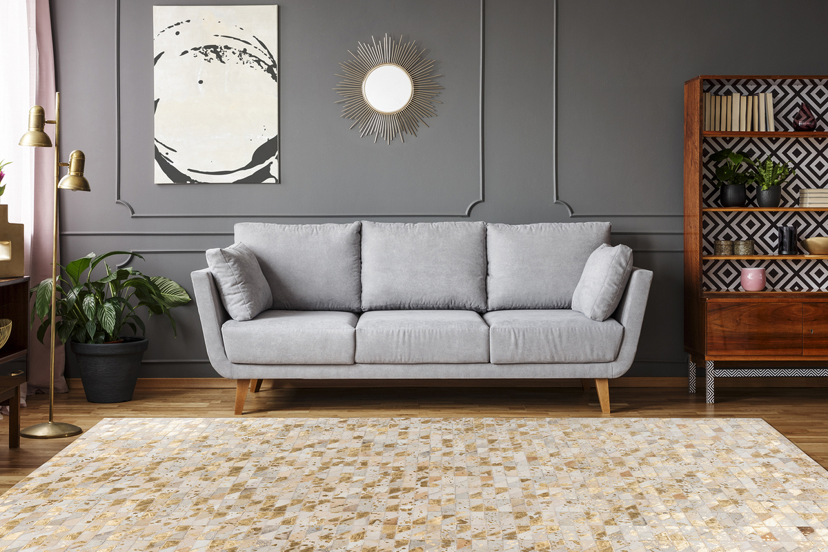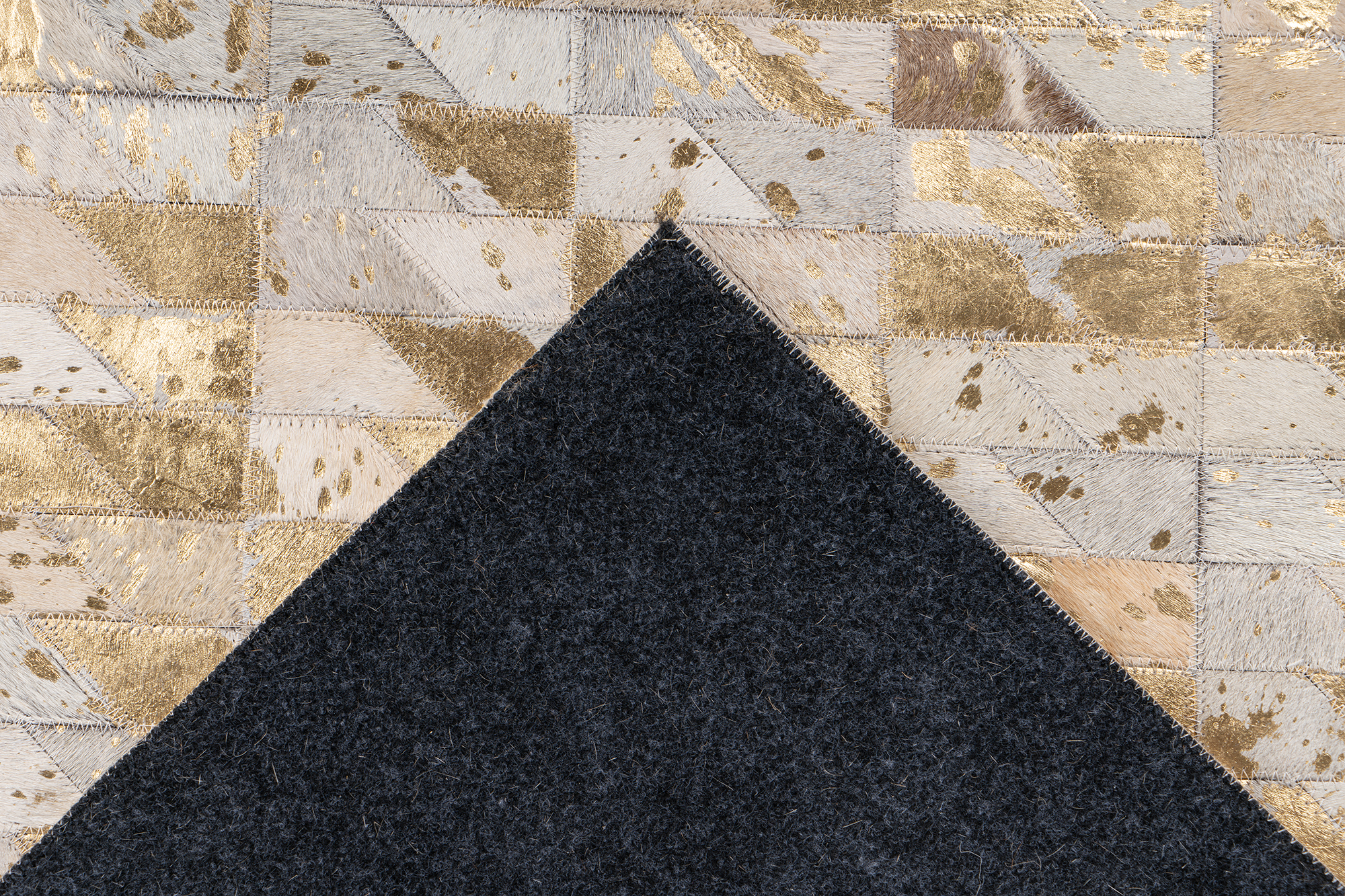 Mit seiner charmanten Erscheinung wertet dieser Teppich Innenräume im Handumdrehen auf. Die zusammen genähten Lederstücke sorgen für eine einzigartige Lederoptik und fügen sich so zu einem Unikat zusammen. Das entstehende Gesamtbild hat Charakter dank der unterschiedlichen Nuancen des Materials. Stilvoll und unaufdringlich unterstreicht diese Einmaligkeit eines jeden Stückes die Individualität des Besitzers. Die angewandte Kunst hat bereits seit der Antike bestand und tritt nun in modernen Gewandt erneut in Erscheinung, um zu begeistern. Handgefertigt aus hundertprozentigem echtem Leder überzeugt das natürliche Material durch Langlebigkeit. Unterstützend ist die reichhaltige Auswahl an Größen und Mustern, welche für keinerlei Wünsche offenlässt. Neben Schrittschalldämmung ist die Nutzung auf Fußbodenheizungen problemlos möglich. Aufgrund der Verwendung natürlicher Materialien kann die Farbgebung von Bildern abweichen. Gegebenenfalls kann das natürliche Fell nach einiger Zeit und bei hoher Beanspruchung an Haaren verlieren. Ebenso könnte sich die Metallicfolie an einigen Stellen ablösen. Dies ist der natürlichen Beschaffenheit des Materials geschuldet und kein Produktionsfehler oder Qualitätsmangel.