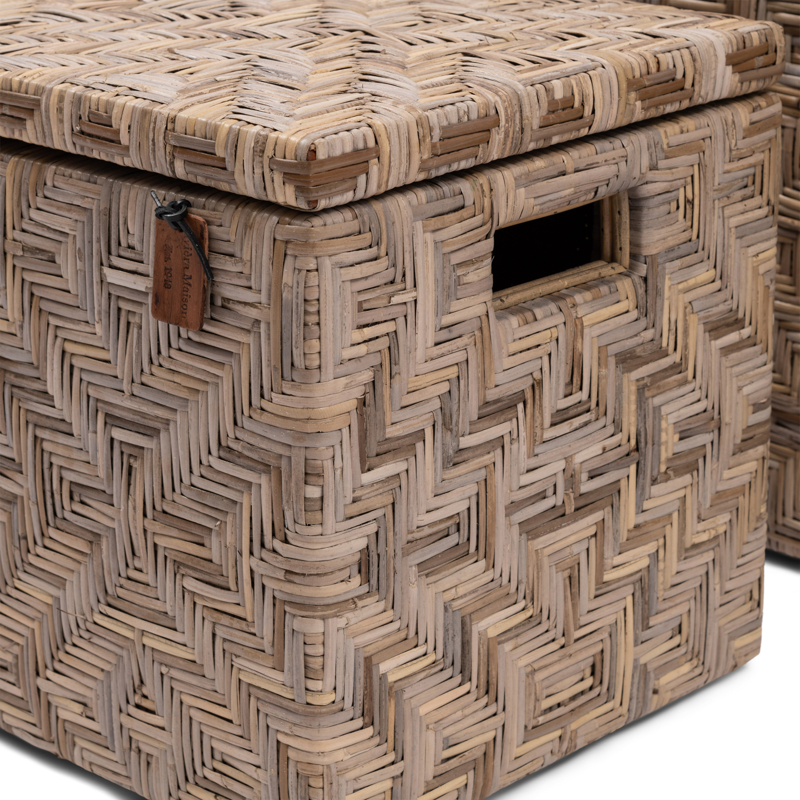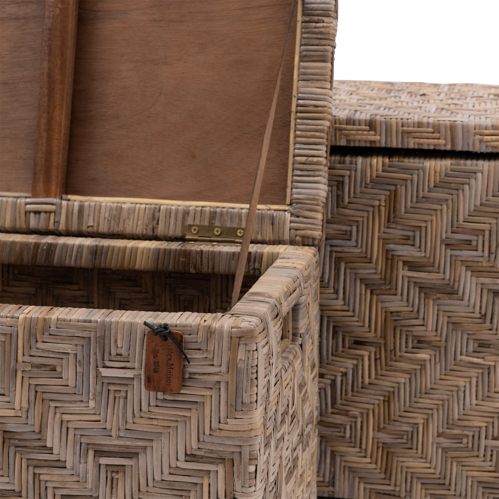 Für diese Port Barton Trunk wird ganz besonderes Lasio-Rattan mit einem wunderschönen Glanz verwendet. Das Rattan ist handgeflochten und jeder Strang hat seine ganz eigene einzigartige Farbe. So entstehen überall auf der Kiste unterschiedliche Farbschattierungen. Diese Kiste ist als Set, aber auch einzeln in zwei verschiedenen Formaten erhältlich.