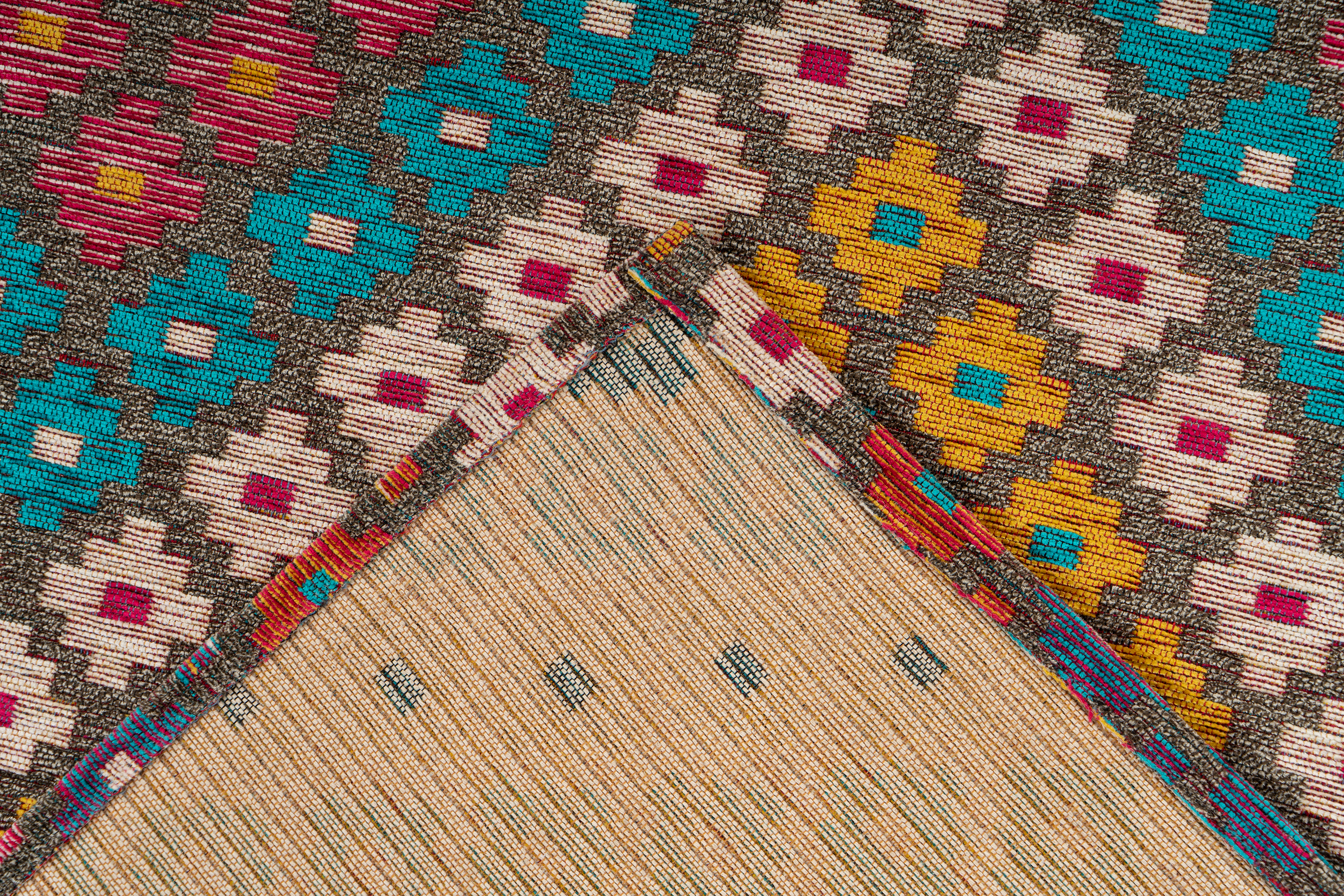 Der Flachflorteppich überzeugt durch sein buntes und modernes Design. Verleihen Sie Ihrem Zuhause einen einzigartigen Look, über den Gäste noch lange staunen. Die modischen Muster und Farben werten jeden Einrichtungsstil noch weiter auf und dienen als farbenfroher Blickfang. Verstärken Sie die Intensität der Farben durch Kissen oder andere Dekoration. Die verwendeten Materialien lassen Sie lange Freude an Ihrem neuen Teppich haben und durch den flachen Flor punktet Ihr buntes Lieblingsstück mit seiner optimalen Pflegeleichtigkeit. Außerdem besticht der farbenfrohe Teppich durch sein geringes Eigengewicht, wodurch er problemlos neu platziert und in Szene gesetzt werden kann. Auch bei einer Wohnung mit Fußbodenheizung können sie sich an diesem farbenfrohen Dekostück erfreuen. Durch Veränderung des Lichteinfallwinkels oder die Streichrichtung des Flors kann es zu Veränderungen der Farbnuancen kommen, er bleibt aber trotzdem schön bunt und farbenfroh.