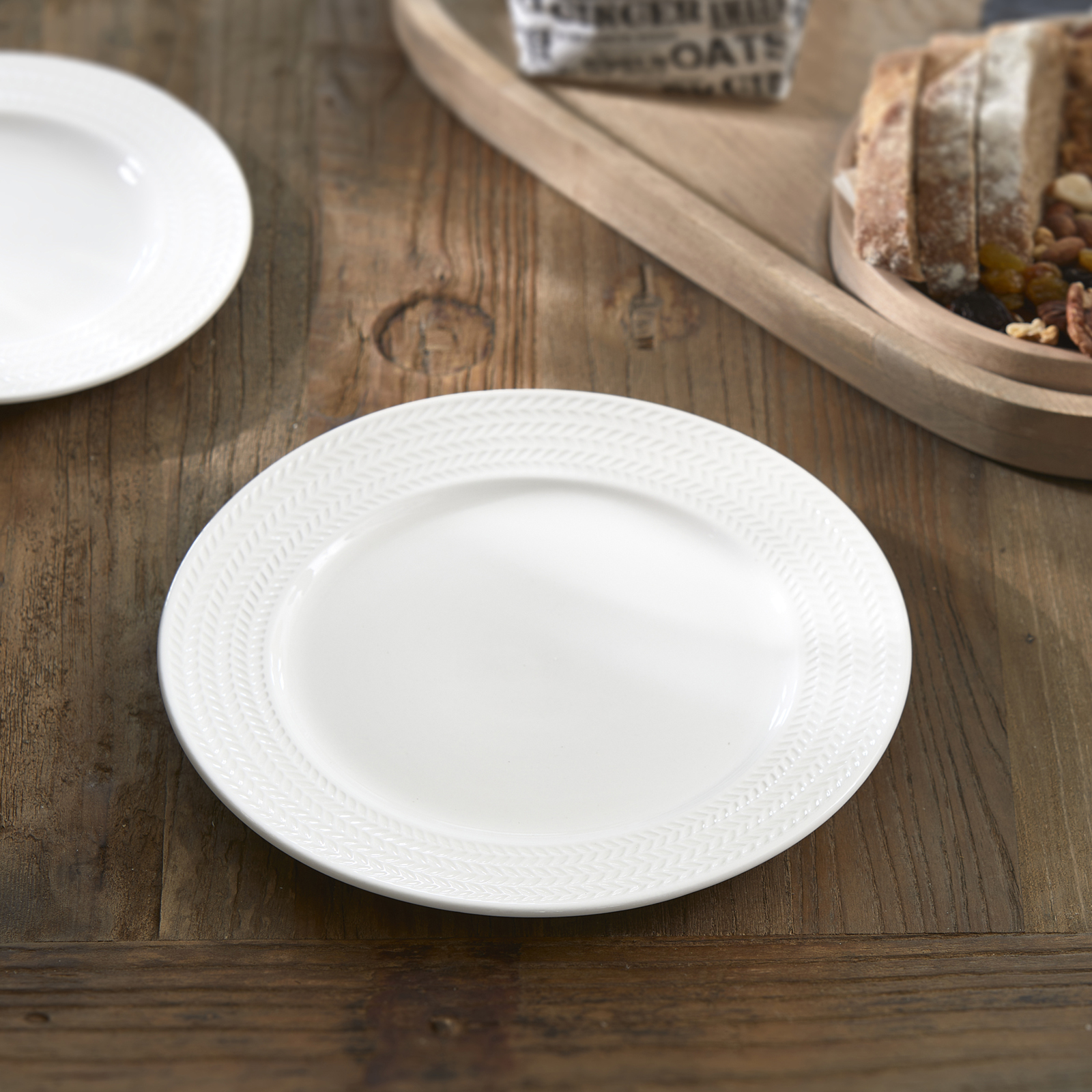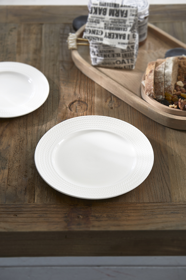 Der schön gewebte Zierrand dieses RM Bellecôte-Speisetellers fällt sofort ins Auge. Schlicht, so scheint es, aber das Fischgrätenmuster macht tatsächlich Eindruck. Es gibt noch mehr Geschirrteile aus dieser Serie, die zusammen einen festlichen Eindruck auf dem Tisch hinterlassen.