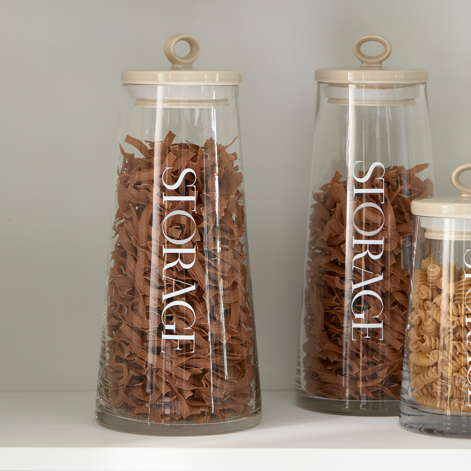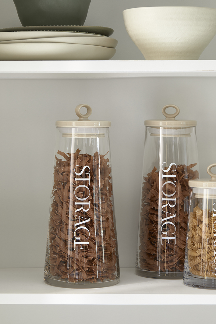 In der Küche kann man nie zu viele Vorratsgläser haben. Ein gutes Beispiel für einen schönen und praktischen Vorratstopf ist dieser RM Loft Vorratstopf Größe L. Der Topf ist aus klarem Glas in Form eines Kegels gefertigt. So können Sie den Inhalt gut sehen. Verschlossen wird der Topf mit einem hübschen Deckel aus heller, taupefarbener Keramik.