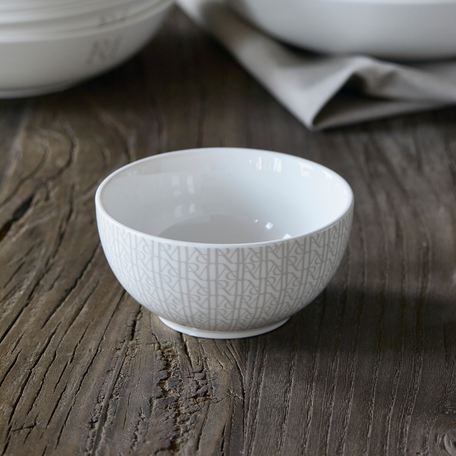 Eine kleine Schale, die sich für viele Dinge verwenden lässt, das ist die RM Monogram Schale small. Die weiße Porzellanschale ist mit einem Allover-Print des neuen Rivièra Maison-Logos verziert. Zierlich, fröhlich, auf dem Kopf und aufrecht.