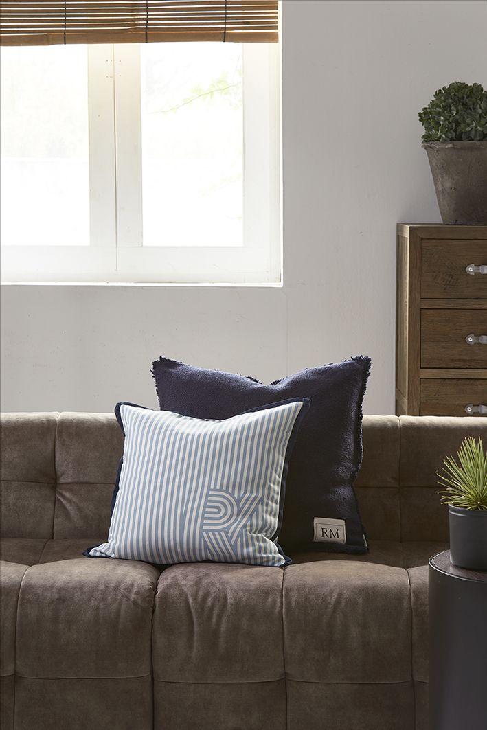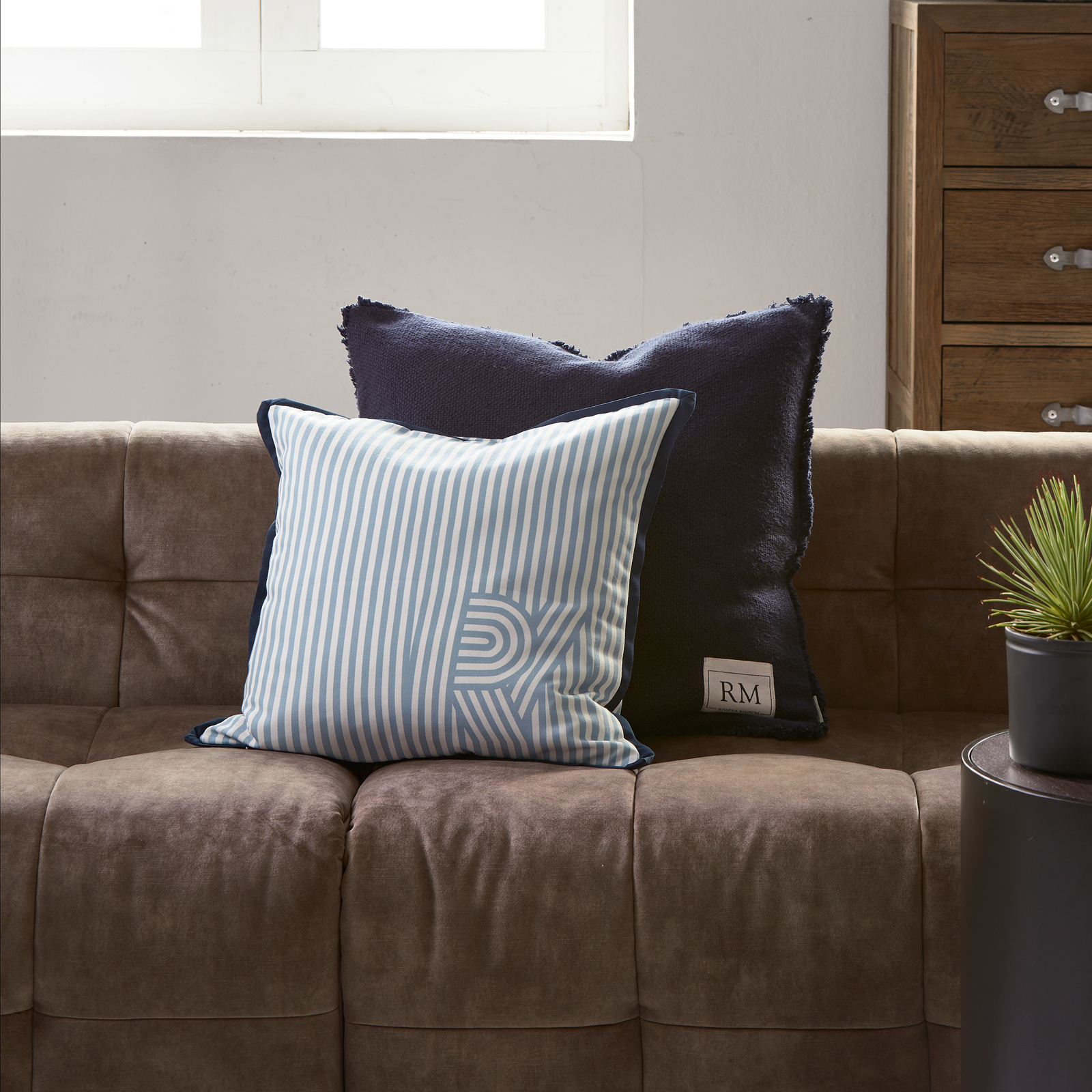 Der leichte Kissenbezug RM Monterosso Pillow Cover 50x50 zeigt eine gestreifte Bordüre in Ockertönen. Die Buchstaben RM sind ebenfalls auf den Bezug gestickt. Die verspielte Paspel mit Fransen rundet das neutrale Kissen ab. Die Rückseite des Bezuges ist einfarbig.