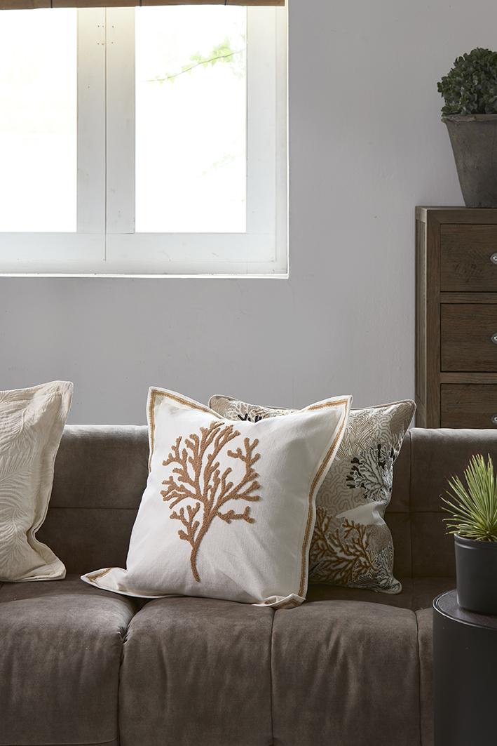 Der RM Nebulla Pillow Cover 50x50 ist ein Kissenbezug, der so schnell nicht langweilig werden wird. Die Vorderseite zeigt nämlich eine schöne Dekoration aus Korallen, die mit verschiedenen Techniken auf den Bezug gebracht wurde. Der Bezug in Türkis, Gold, Weiß und Schwarz ist aus Baumwolle gefertigt, hat eine runde Paspel und eine schlichte Rückseite.