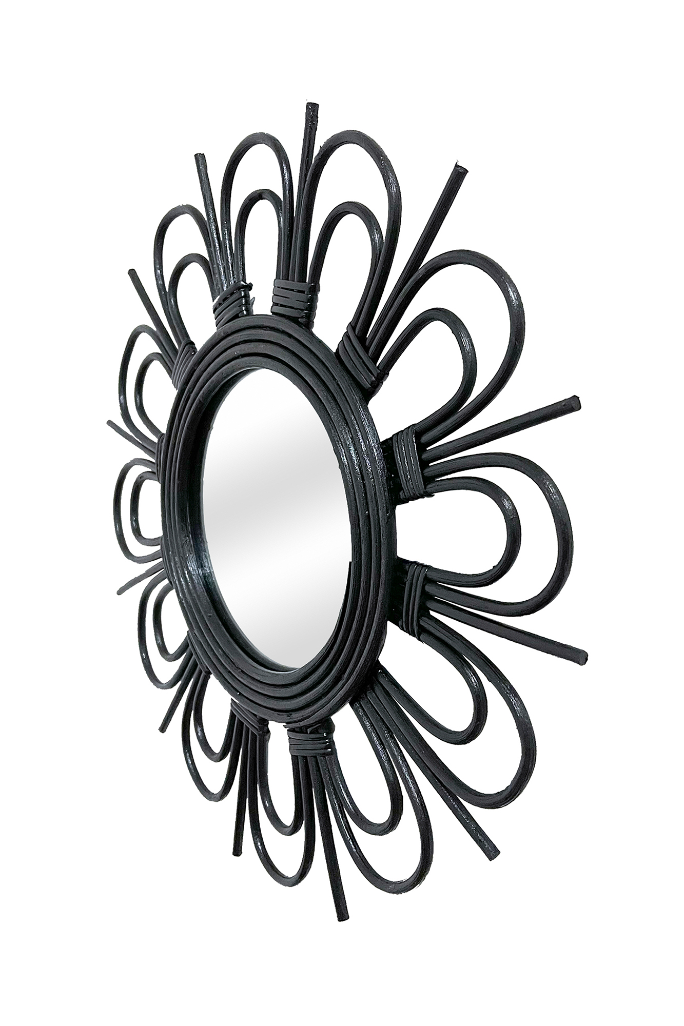 Dieser ausgefallene Wandspiegel beweist, dass "anders" gut sein kann. Denn mit seinem Rahmen aus Rattan wird der runde Spiegel zu einem echten Eyecatcher in jedem Zimmer. Ob nun in Form einer Blume oder eines Sterns, so verschönert er Ihre Räume. Dabei ist er auch noch so einfach und flexibel zu montieren, denn das leichte Gewicht trägt fast jede Wand. Der runde Wandspiegel ist daher genauso für kleine Räume geeignet, welche er aufwertet und optisch vergrößert. Das natürliche Design von Rattan lockert das Gesamtbild wiederum auf. So sorgen Sie mit wenigen Griffen für mehr Ästhetik in Ihrem Zuhause. Wie wäre es beispielsweise mit dem schicken Spiegel im Vorraum oder über der Anrichte im Schlafzimmer? Auch im Wohnzimmer sorgt das Modell mit Rattan für Highlights. Verwirklichen Sie einfach Ihre individuellen Wohnideen, denn die Spiegel lassen sich auch stilvoll nebeneinander anordnen.