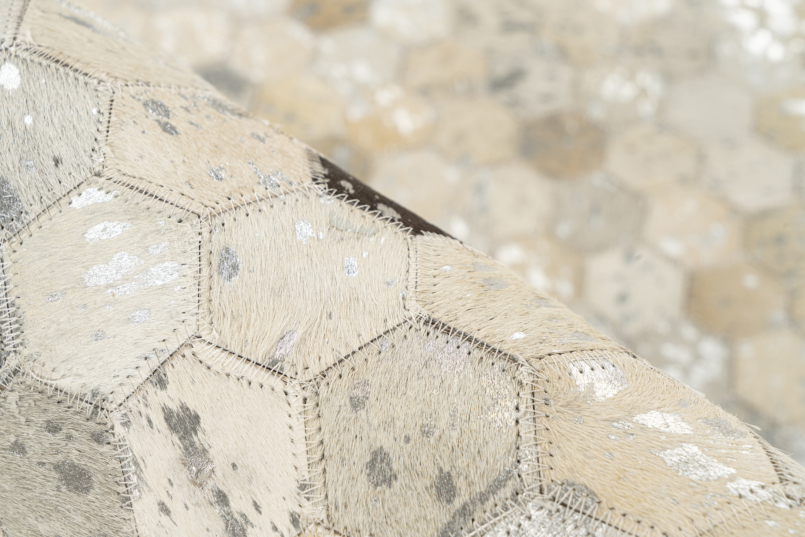 Der hochwertig verarbeitete Ravi Teppich ist in jeweils drei verschiedenen Farben und Größen erhältlich und fällt durch sein besonderes Design und die natürlichen Materialien auf. Die metallischen Effekte machen den ansprechenden Kurzflorteppich aus Rindleder zu einem Blickfang in jedem Zimmer. Spezifikationen: • erhältliche Farben: Silber-Grau / Gold-Grau • Florhöhe: ca. 8mm • Material: 100% Rindleder / Rücken 100% Wolle • Größe: 80cm x 150cm / 120cm x 170cm / 160cm x 230cm