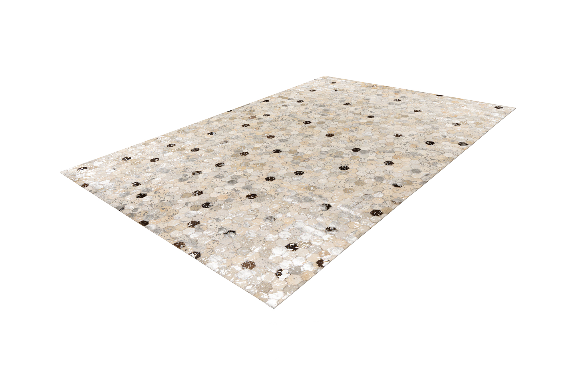 Der handgefertigte Teppich Ravi ist ein wahres Unikat. Kein Teppich ist wie der andere, da es sich bei den benutzten Materialien um rein natürliche Felle handelt. Der 8mm Kurzflorteppich ist zwar sehr kurz und deshalb einfach zu reinigen, aber dennoch hält er gut warm, da auf der Unterseite natürliche Wolle eingearbeitet wurde. Ein einzigartiges Stück für Ihr Heim! Spezifikationen: • Farbe: Creme / Schwarz • Florhöhe: ca. 8mm • Material: 100% Rindleder, Rücken 100% Wolle • Größe: 80cm x 150cm / 120cm x 170cm / 160cm x 230cm