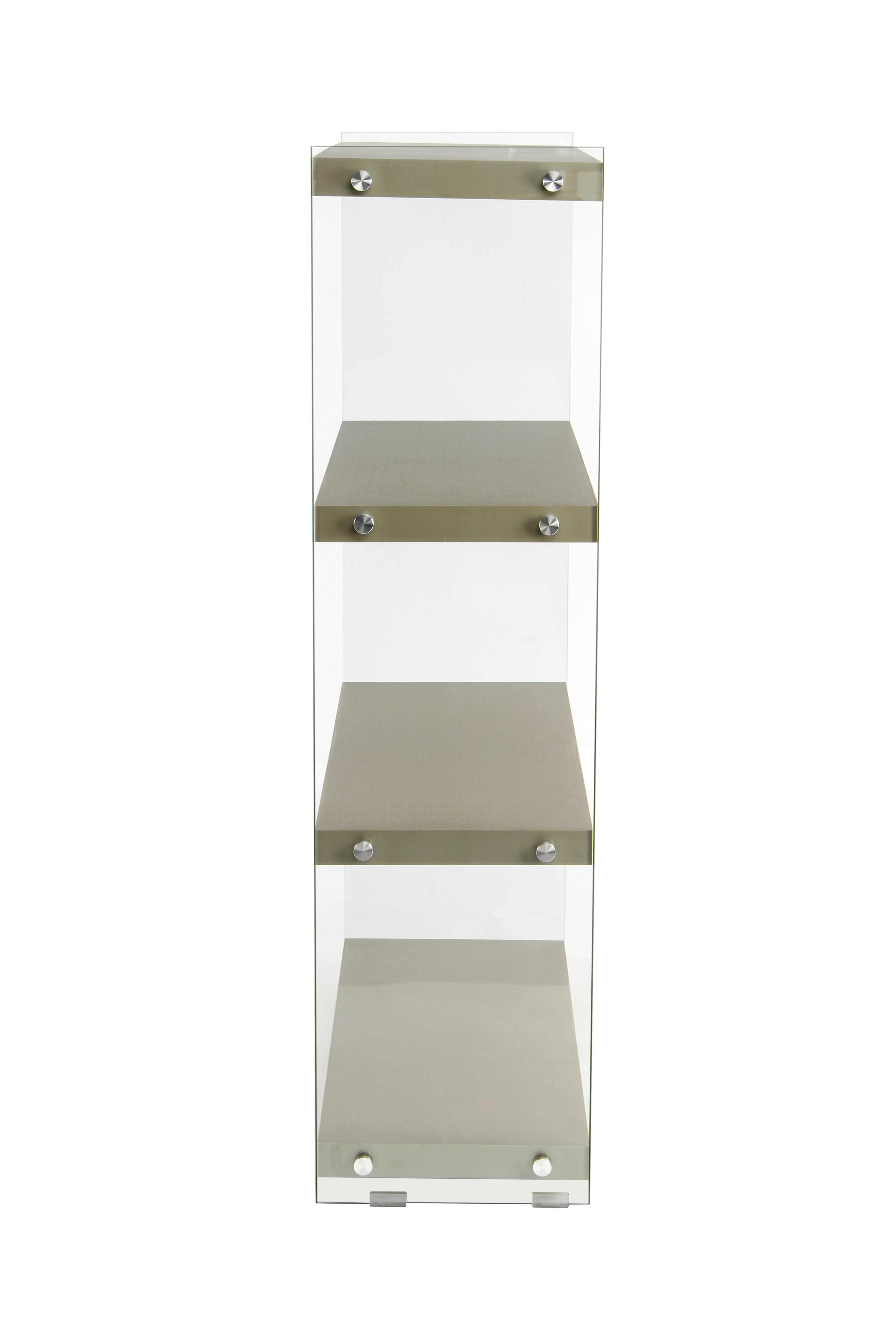 Das moderne Design dieses Regals zeichnet sich durch die transparenten Glas-Seitenwände und die unifarbenen Ablageflächen aus. Gleichzeitig ist das Design unaufdringlich und kann in verschiedene Einrichtungsstile integriert werden. Das Regal ist Bestandteil einer Möbelserie, sodass Sie durch die Kombination mit weiteren Möbelstücken ein einheitliches, harmonisches Gesamtambiente im Raum schaffen können. In dem Regal können ideal verschiedene Dinge platziert werden, wie beispielsweise Bücher, DVDs oder Dekoration. Egal ob als Wohnzimmerregal, Stauraum im Schlafzimmer oder als Ablage im Flur – das Regal ist vielseitig einsetzbar und ein praktisches und zugleich dekoratives Möbelstück. Durch die schmale Form kann es einfach an der Wand platziert werden und benötigt auch in kleinen und engen Räumen nur wenig Platz. Richten Sie sich mit Möbeln dieser Möbelserie in Ihrem Zuhause stilvoll ein und kombinieren Sie beispielsweise Regal und Beistelltisch miteinander. Das Regal kann in seiner tatsächlichen Farbgebung von den Bildern abweichen.