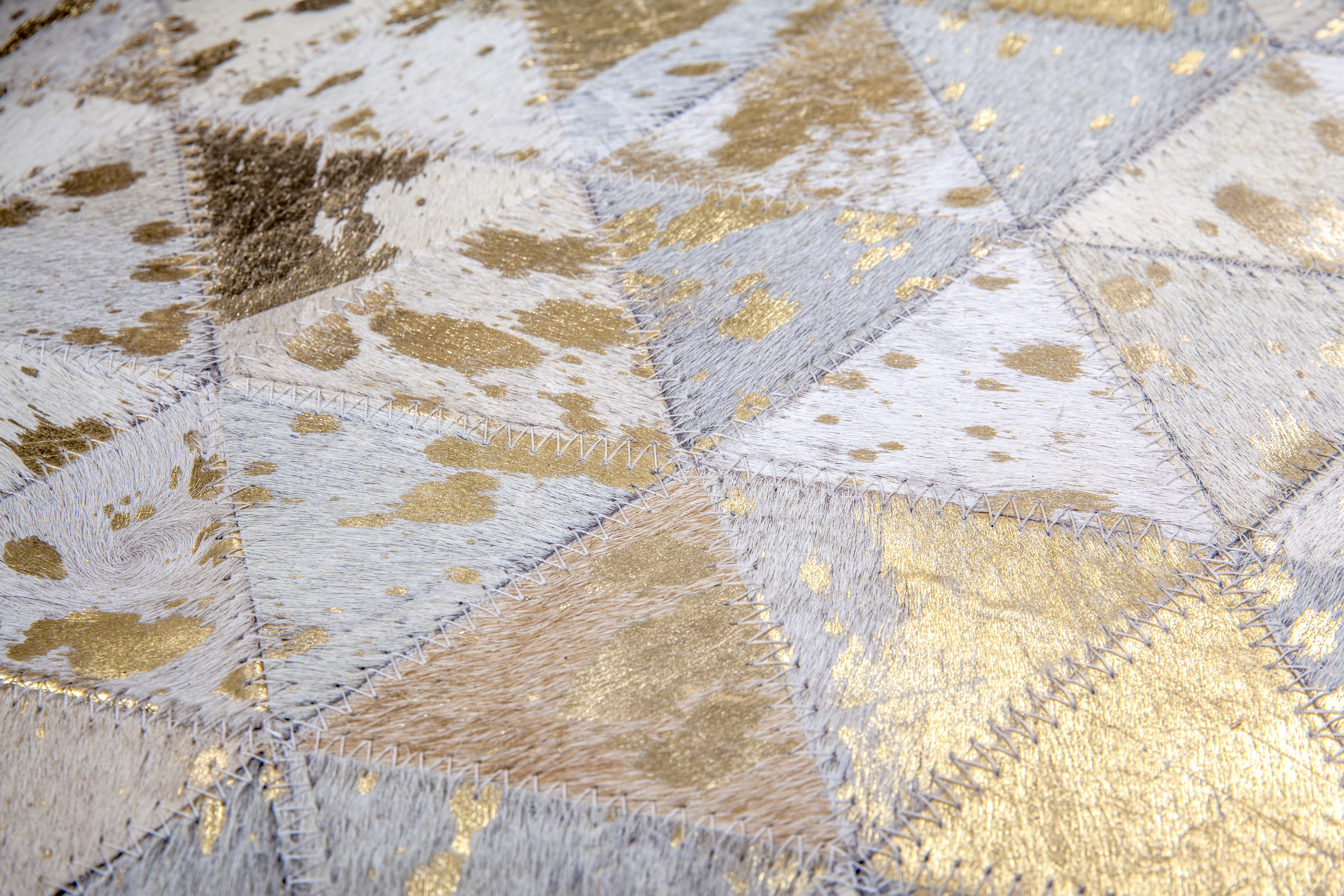 Metallische Applikationen auf echtem Leder mit weichem Haar zeichnen diesen Teppich aus. Holen Sie sich den individuellen Hingucker nach Hause und Ihre Besucher werden staunen. Basis des Lederteppichs im Patchwork-Design bilden verschiedene Nuancen eines Farbtons. Die aufgedruckte metallische Folie ist der besondere Clou des Teppichs, setzt Akzente und lässt den Teppich strahlen. Es gibt keine identischen Tierfelle. Ebenso ist jeder einzelne dieser Lederteppiche durch natürliche Abweichungen in Größe, Farbgebung, Muster und Struktur einzigartig. Die Unikate werden durch das Folien-Dekor in bunten Farben, Gold oder Silber abgerundet. Aus dem Naturmaterial Leder wurde in liebevoller Handarbeit ein hochwertiger Teppich hergestellt, der neben seiner Widerstandsfähigkeit und Robustheit auch dadurch glänzt, dass er lichtecht und einfach zu reinigen ist. Weicher Filz schließt die Unterseite des Lederteppichs ab und unterstützt die Wärmeisolierung und Geräuschdämmung. Auch Räume mit Fußbodenheizungen sind für den Teppich kein Problem. In Kombination mit attraktiven Lederkissen, platziert auf Ihrer Couch oder dekorativ auf Stühlen, schaffen Sie ein gelungenes Gesamtkonzept. Das natürliche Fell kann nach einiger Zeit und bei hoher Beanspruchung gegebenenfalls an Haaren verlieren. Ebenso könnte sich der Foliendruck an einigen Stellen lösen. Dies ist dem Naturprodukt geschuldet und kein Qualitätsmangel oder Produktionsfehler.