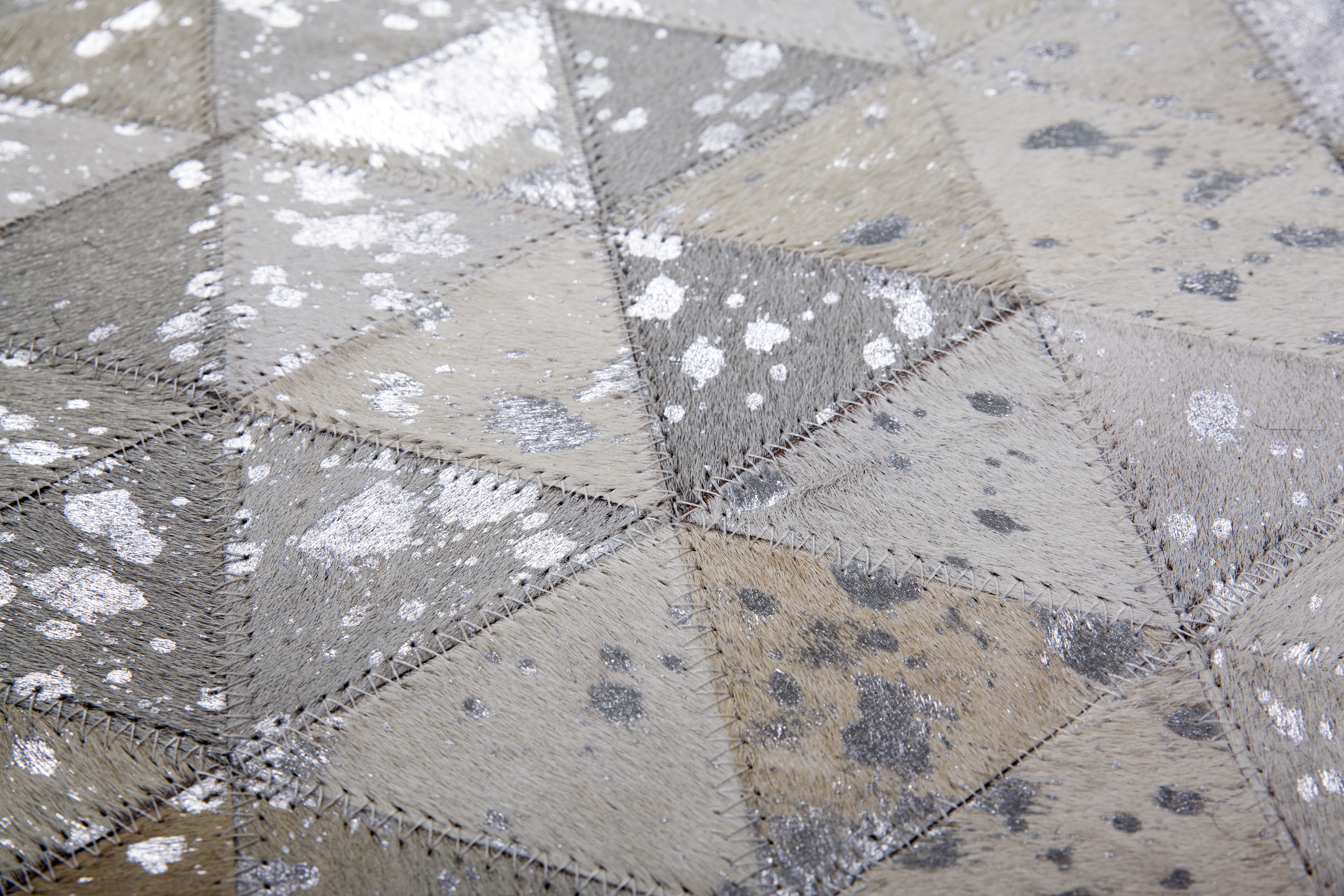 Metallische Applikationen auf echtem Leder mit weichem Haar zeichnen diesen Teppich aus. Holen Sie sich den individuellen Hingucker nach Hause und Ihre Besucher werden staunen. Basis des Lederteppichs im Patchwork-Design bilden verschiedene Nuancen eines Farbtons. Die aufgedruckte metallische Folie ist der besondere Clou des Teppichs, setzt Akzente und lässt den Teppich strahlen. Es gibt keine identischen Tierfelle. Ebenso ist jeder einzelne dieser Lederteppiche durch natürliche Abweichungen in Größe, Farbgebung, Muster und Struktur einzigartig. Die Unikate werden durch das Folien-Dekor in bunten Farben, Gold oder Silber abgerundet. Aus dem Naturmaterial Leder wurde in liebevoller Handarbeit ein hochwertiger Teppich hergestellt, der neben seiner Widerstandsfähigkeit und Robustheit auch dadurch glänzt, dass er lichtecht und einfach zu reinigen ist. Weicher Filz schließt die Unterseite des Lederteppichs ab und unterstützt die Wärmeisolierung und Geräuschdämmung. Auch Räume mit Fußbodenheizungen sind für den Teppich kein Problem. In Kombination mit attraktiven Lederkissen, platziert auf Ihrer Couch oder dekorativ auf Stühlen, schaffen Sie ein gelungenes Gesamtkonzept. Das natürliche Fell kann nach einiger Zeit und bei hoher Beanspruchung gegebenenfalls an Haaren verlieren. Ebenso könnte sich der Foliendruck an einigen Stellen lösen. Dies ist dem Naturprodukt geschuldet und kein Qualitätsmangel oder Produktionsfehler.