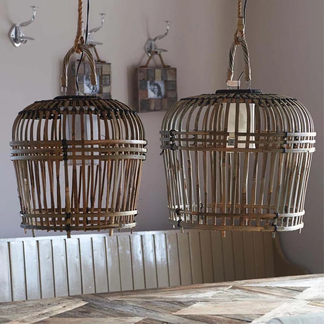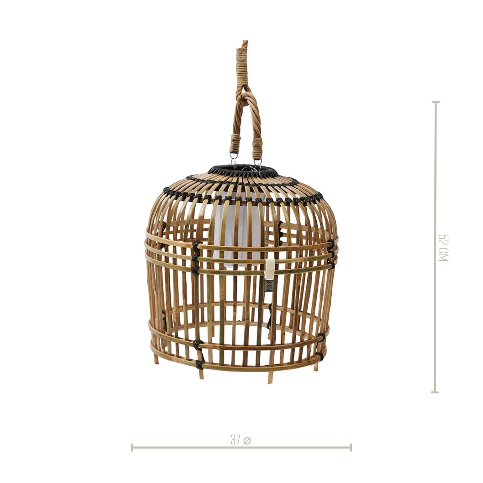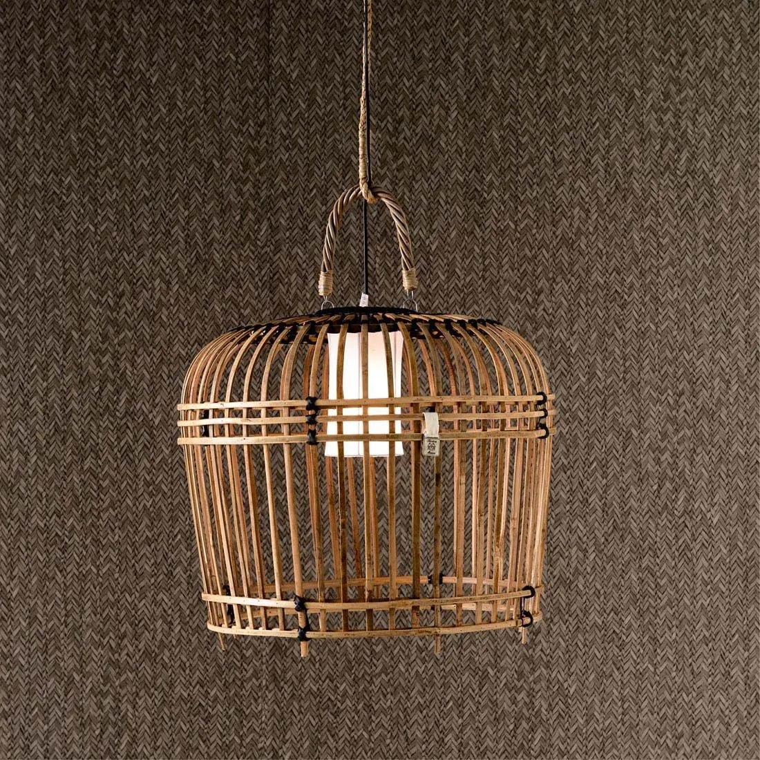 Diese schöne Hängelampe wurde von Hahnenkäfigen aus Indonesien inspiriert, ist aus Bambus gefertigt. Durch den Bambus wird das Licht subtil gestreut, was ein schöner Effekt ist.