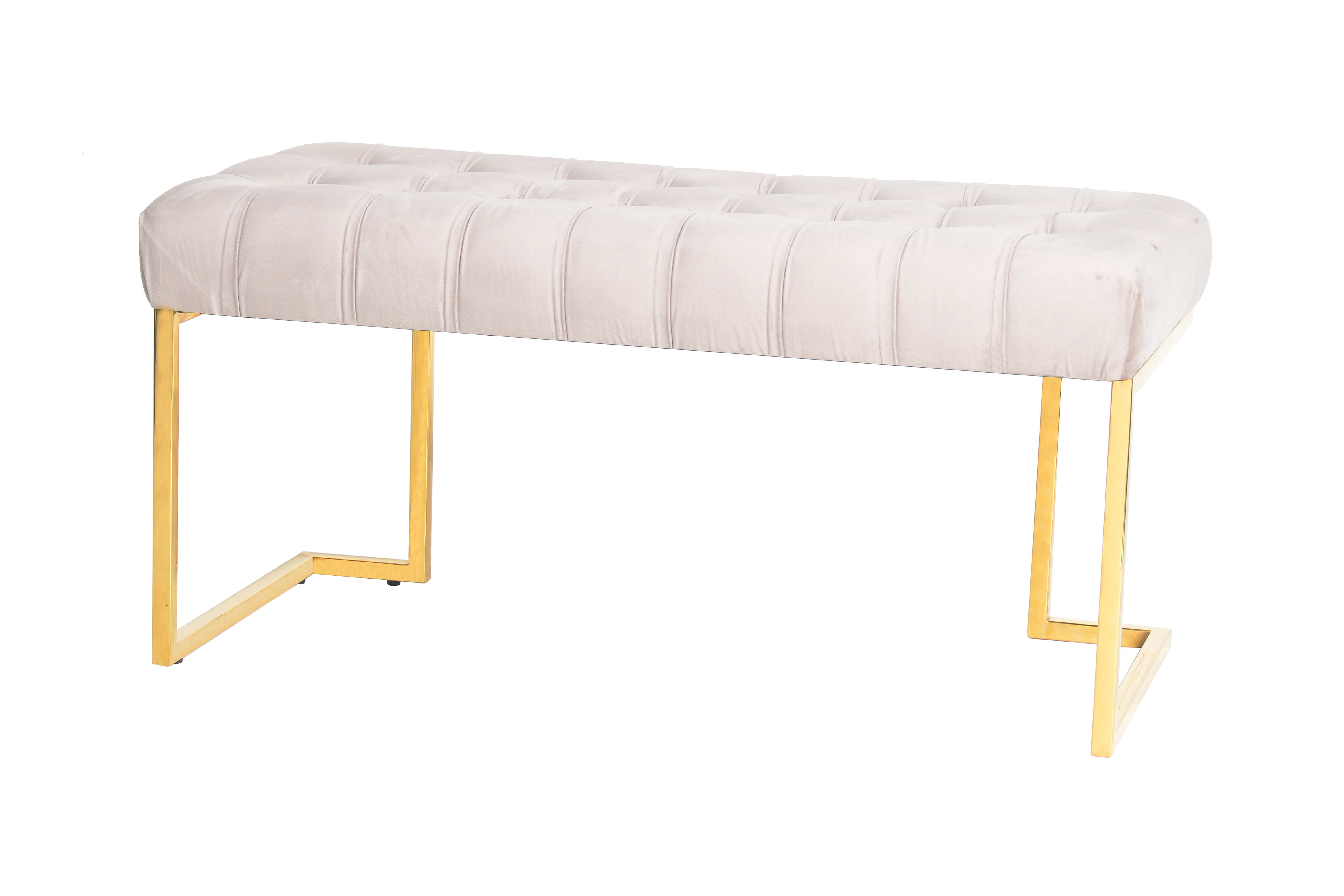 Dieser wunderschöne Sitzbank besitzt einen samtigen Stoffbezug aus Polyester. Das weiche Polster ist mit Zierknöpfen gesteppt und lädt zum gemütlichen Verweilen auf mehreren Sitzplätzen ein. Das goldene, eckige Metallgestell verleiht der Bank einen modernen Look und bringt Schwung in Ihre Wohnung. Mit seinen neutralen Farbtönen bietet die Sitzbank einen unaufdringlichen, hochwertigen Hingucker und lässt sich super mit dem dazu gehörigen Hocker kombinieren. Spezifikationen: • Farben: Altrosa, Grau, Schwarz, Taupe • Material: 100% Polyester, Schaumstoff, Edelstahl • Größe: ca. 100cm (L/T) x 47cm (B) x 48cm (H)
